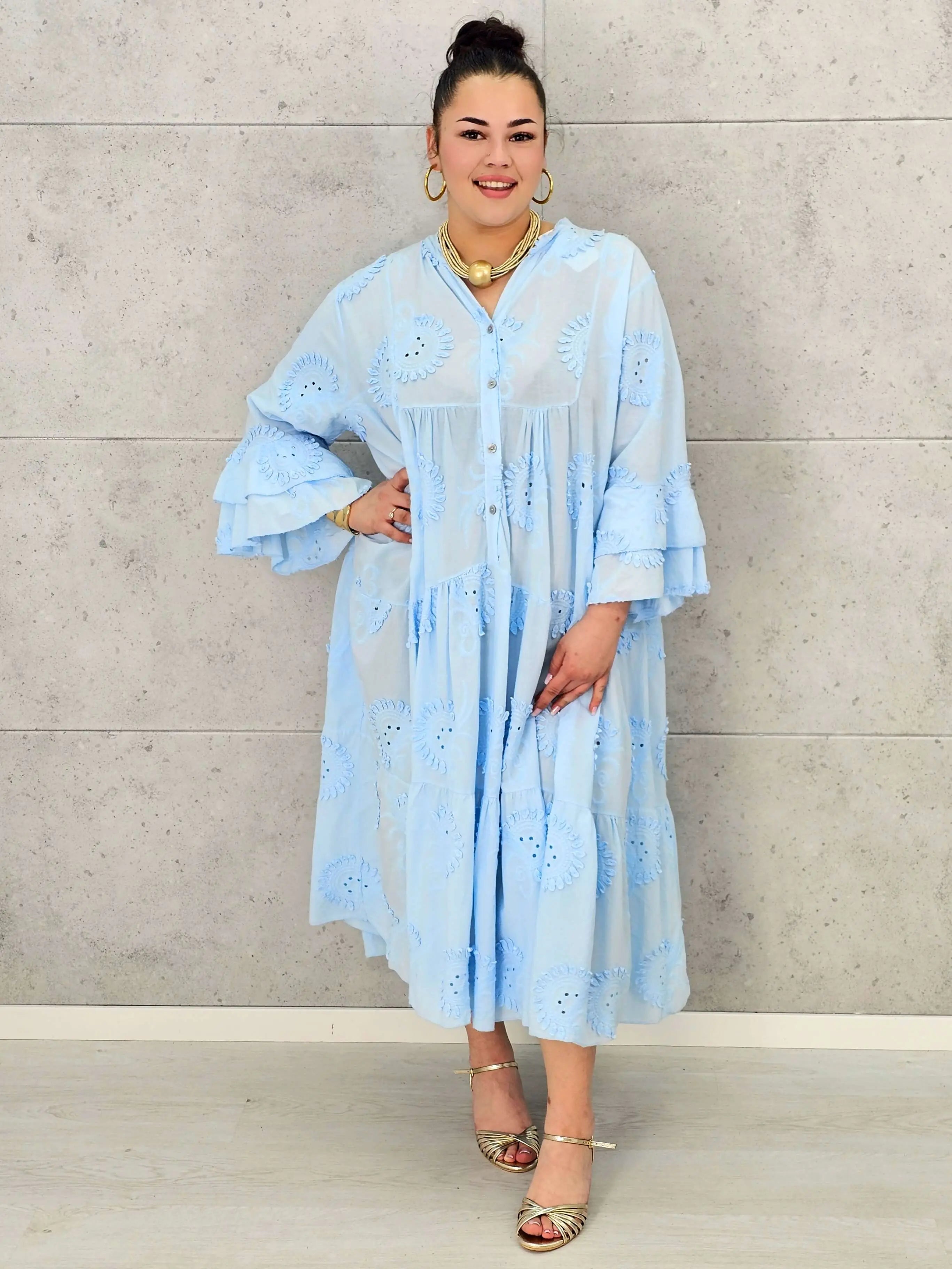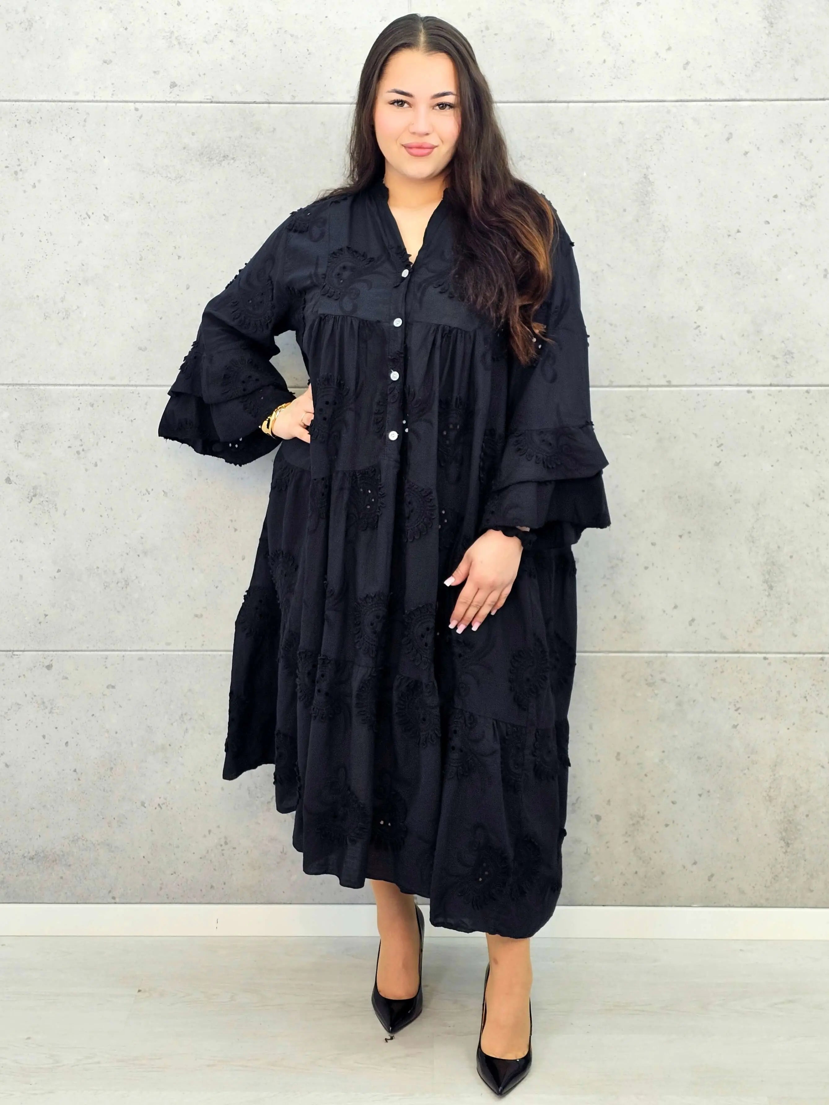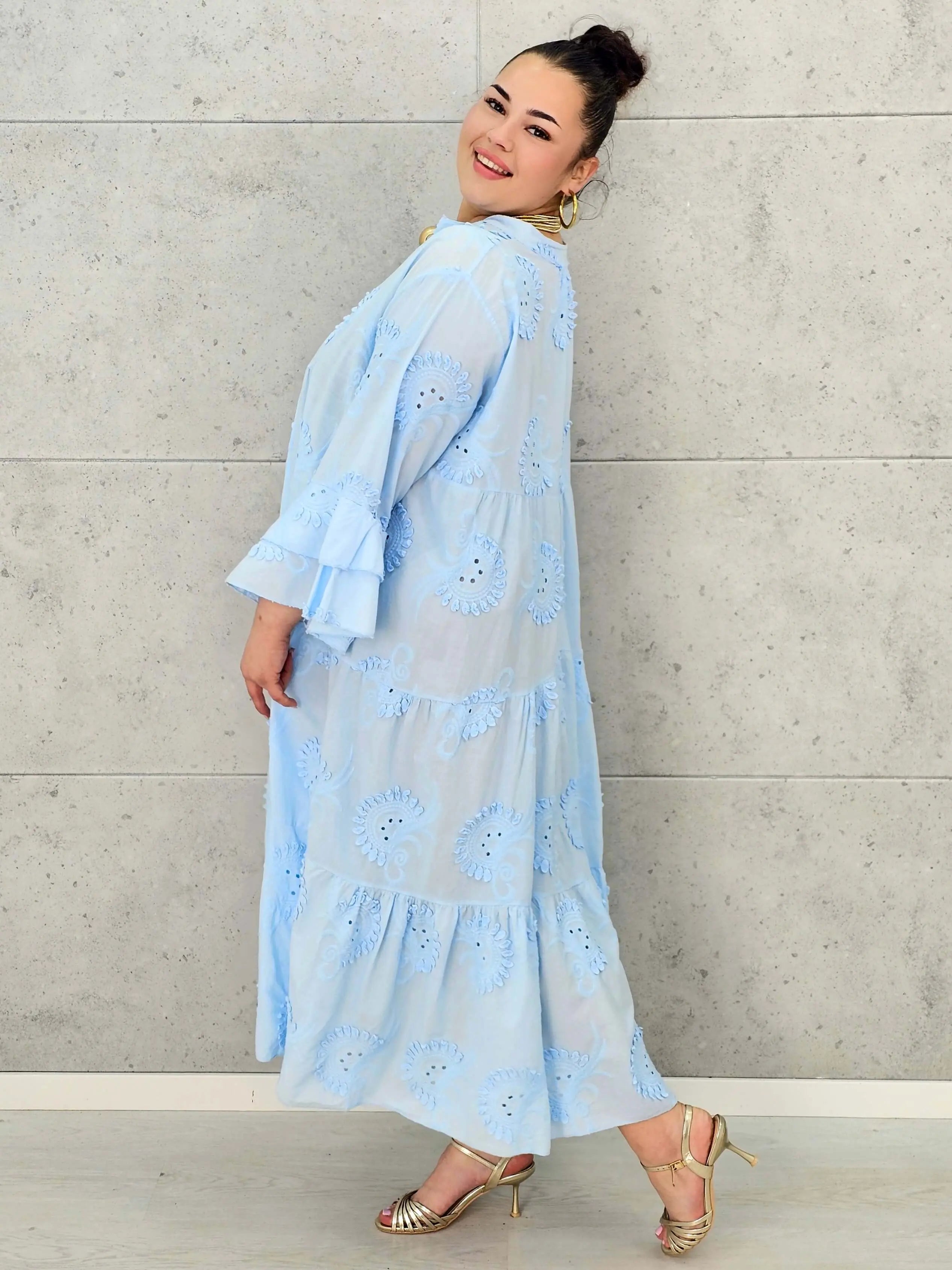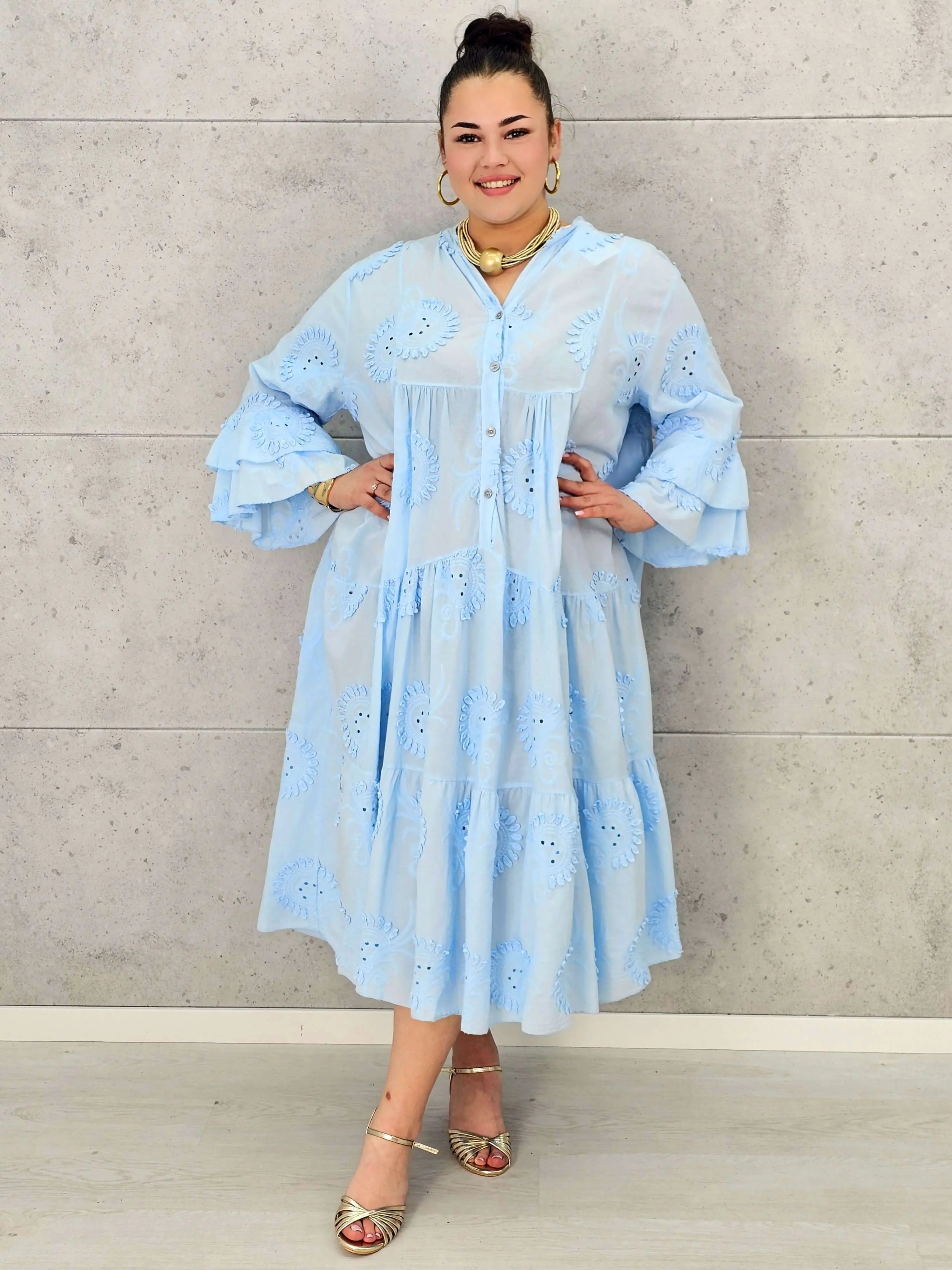 Sukienka plus size w stylu boho to doskonała propozycja dla kobiet, które cenią komfort, lekkość i modne detale charakterystyczne dla mody plus size. Luźny, swobodny krój pięknie układa się na sylwetce XXL, nie opina ciała i zapewnia pełną wygodę przez cały dzień. Haftowany materiał oraz delikatne przeszycia nadają całości wyjątkowego, romantycznego charakteru.