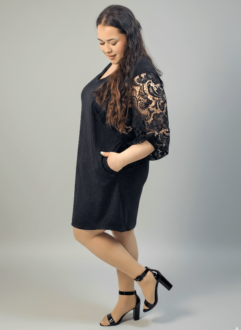 Sukienka plus size w kolorze czarnym to model, który zawsze ratuje stylizację, gdy chcesz wyglądać elegancko i czuć się swobodnie. Na zdjęciu widać prosty, lekko luźny krój z dekoltem w kształcie litery V oraz efektowne, koronkowe rękawy 3/4. Koronka dodaje lekkości i kobiecego charakteru, a jednolita czerń wysmukla sylwetkę. Dodatkowym plusem są kieszenie, dzięki którym sukienka jest nie tylko ładna, ale też praktyczna na co dzień.
