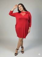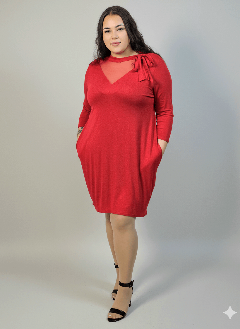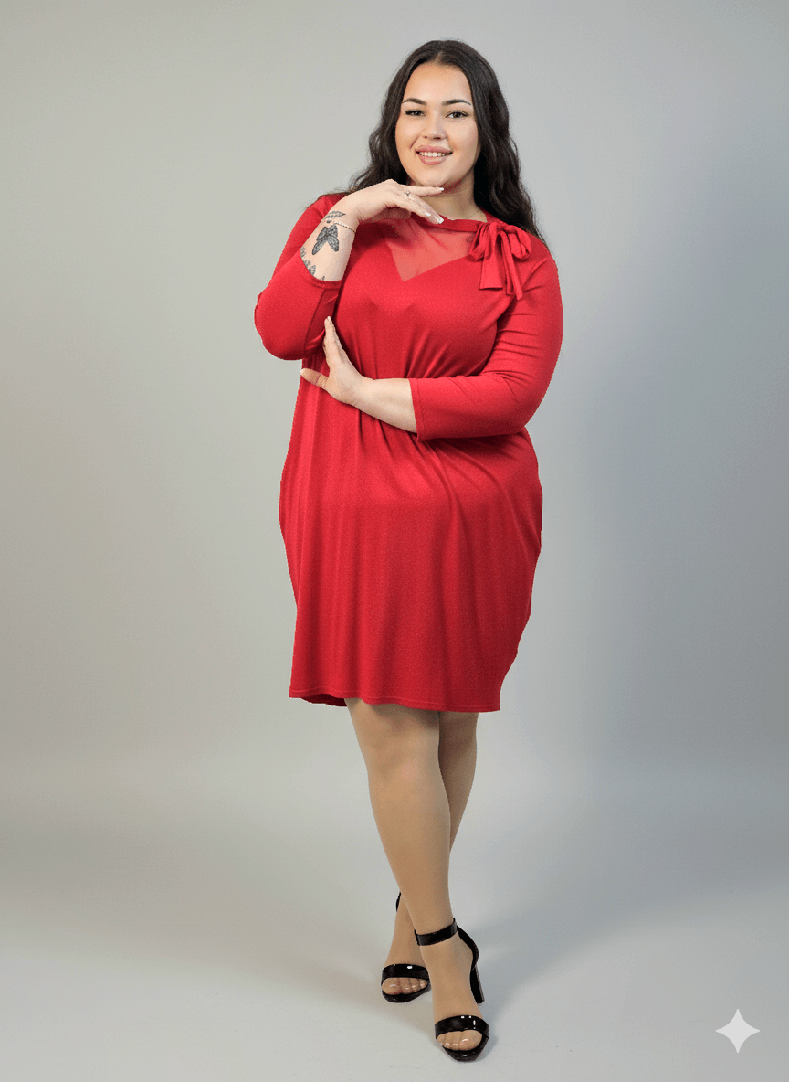 Sukienka plus size w intensywnym czerwonym kolorze to doskonała propozycja dla kobiet, które chcą połączyć elegancję z wygodą. Model wyróżnia się subtelną, tiulową wstawką przy dekolcie w kształcie litery V, która dodaje lekkości i optycznie wysmukla górną część sylwetki. Ozdobne wiązanie przy szyi nadaje sukience charakteru i sprawia, że wygląda wyjątkowo bez nadmiaru dodatków.