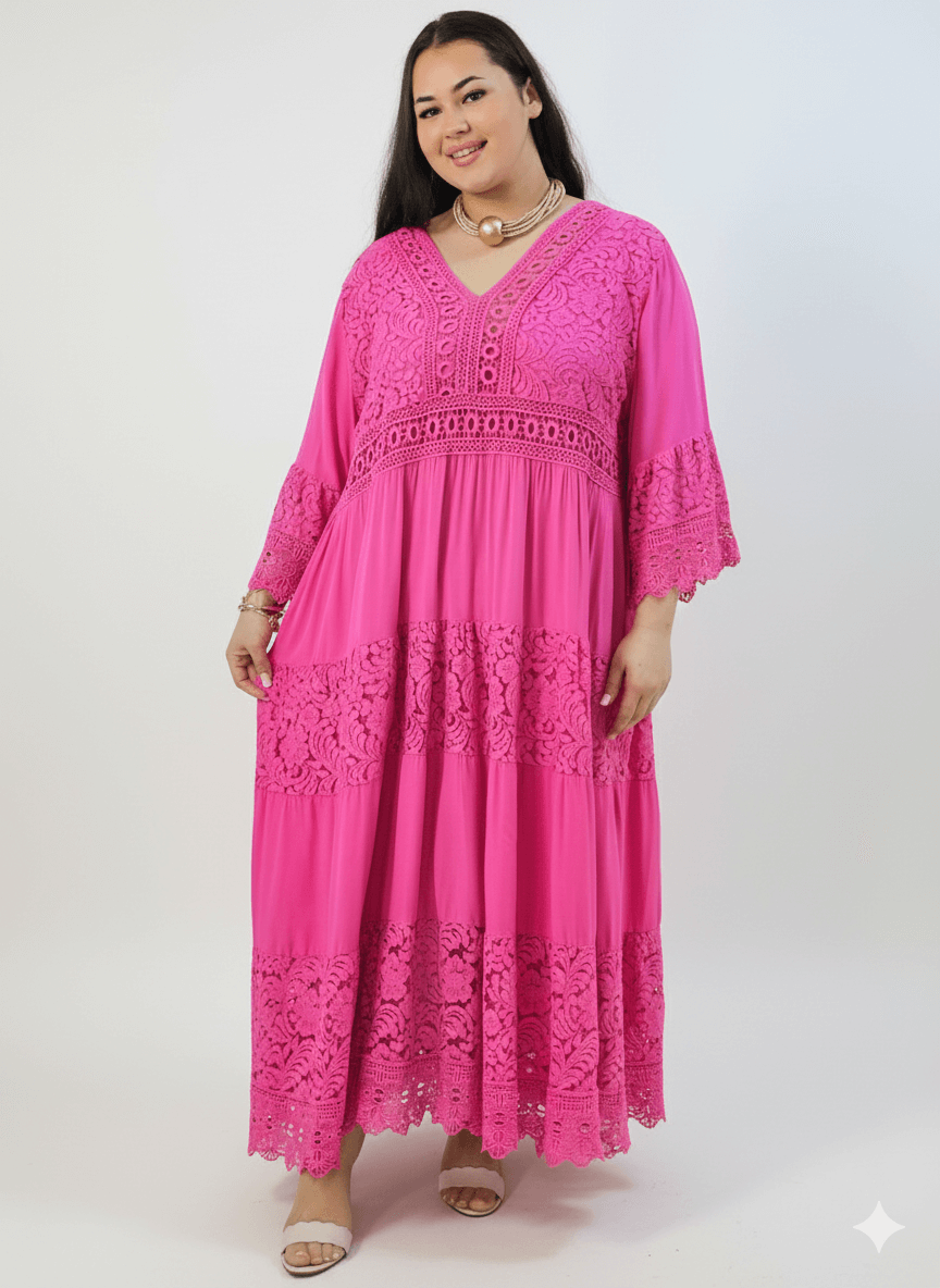 Sukienka plus size koronkowa maxi fuksja – boho, dekolt V
