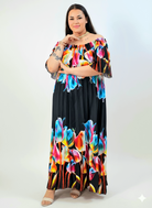 Sukienka plus size maxi hiszpanka w kwiaty – czarna z kolorowym printem