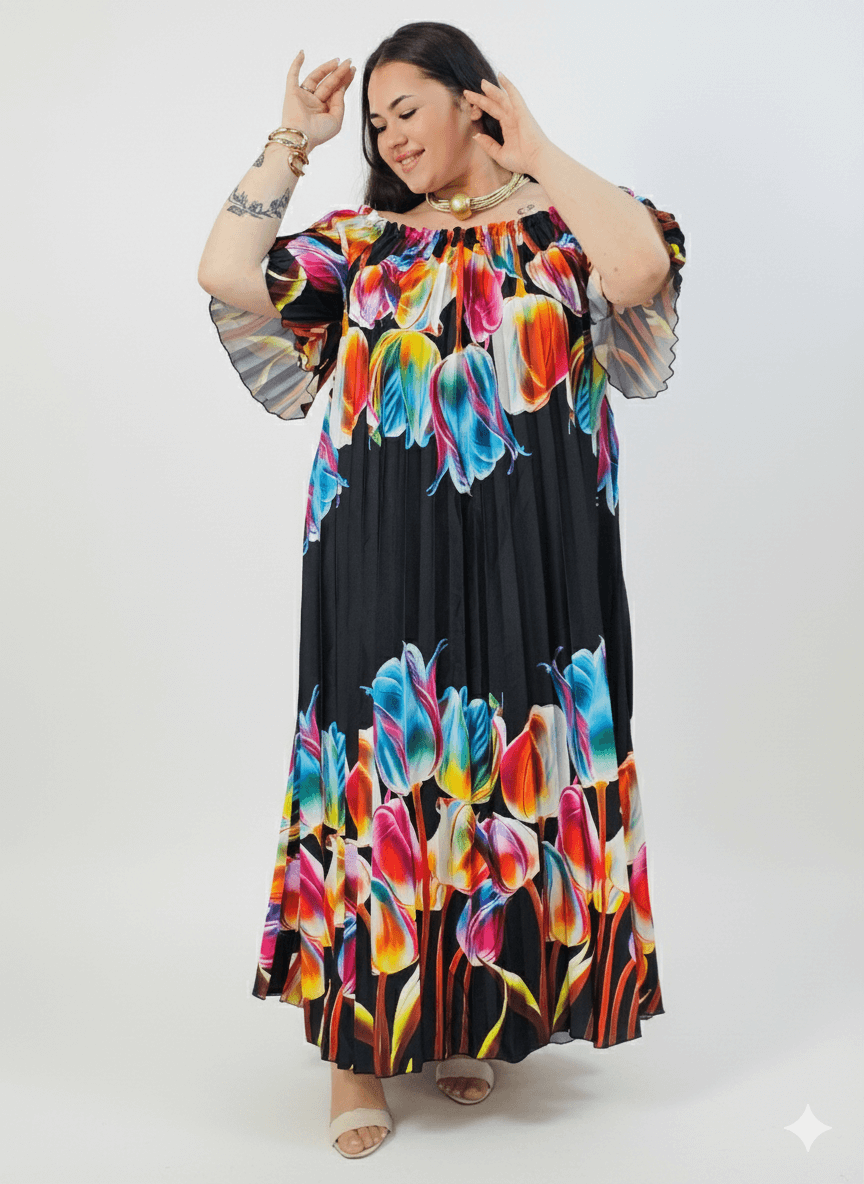 Sukienka plus size w czarnym kolorze z intensywnie kolorowym printem tulipanów to model, który wygląda jak gotowa stylizacja. Fason typu hiszpanka delikatnie odsłania ramiona i dodaje kobiecego uroku, a luźne, zwiewne rękawy pięknie układają się na rękach. To świetna propozycja dla kobiet, które lubią modę plus size w wersji „wow”, ale jednocześnie chcą czuć się swobodnie i komfortowo.