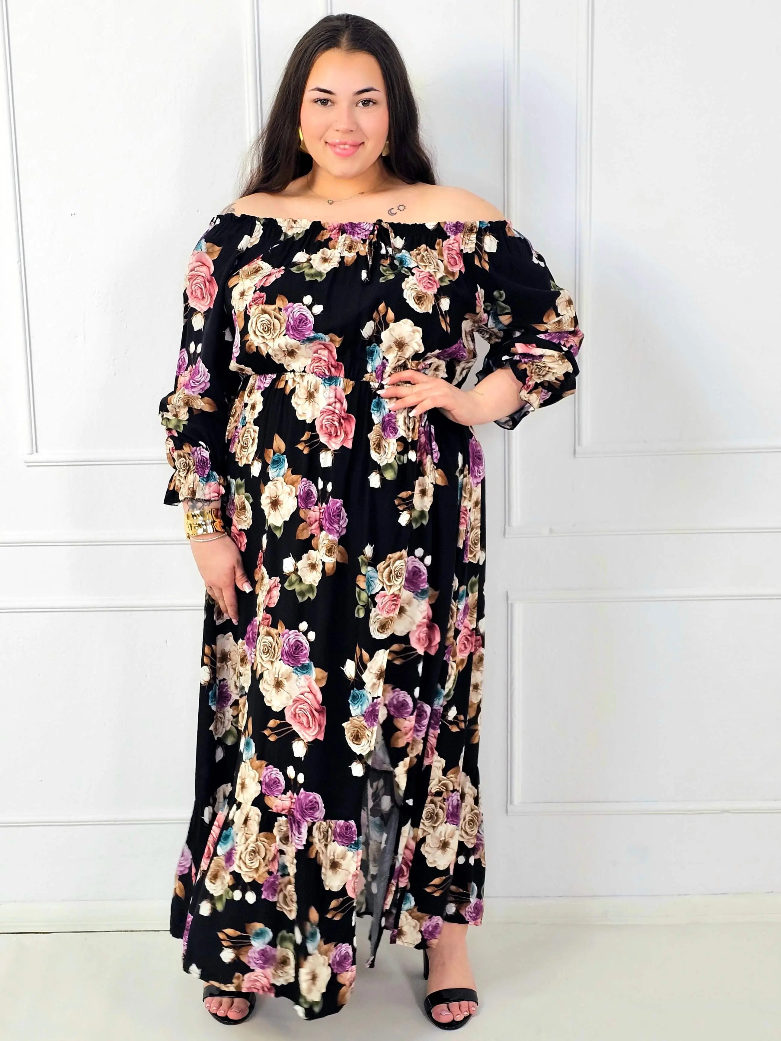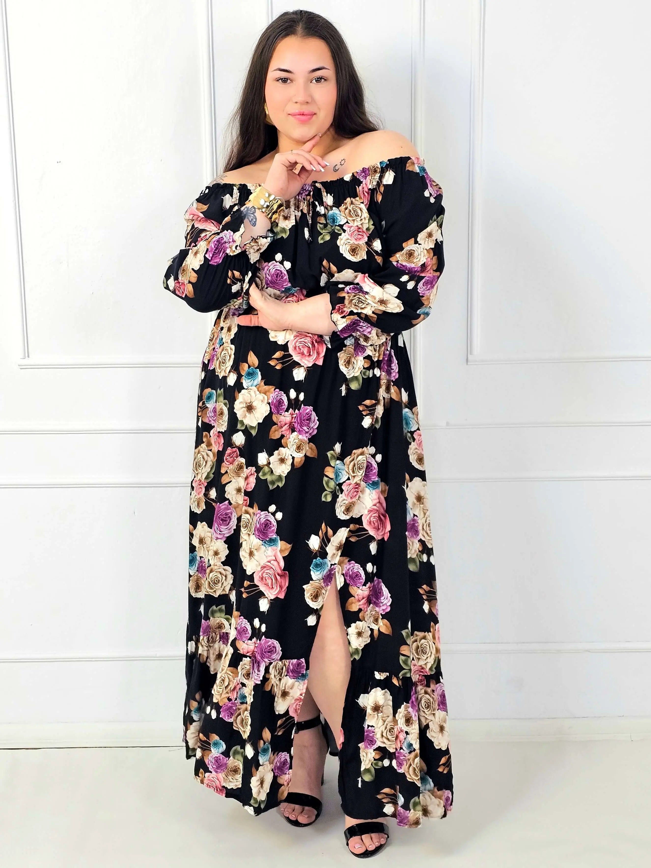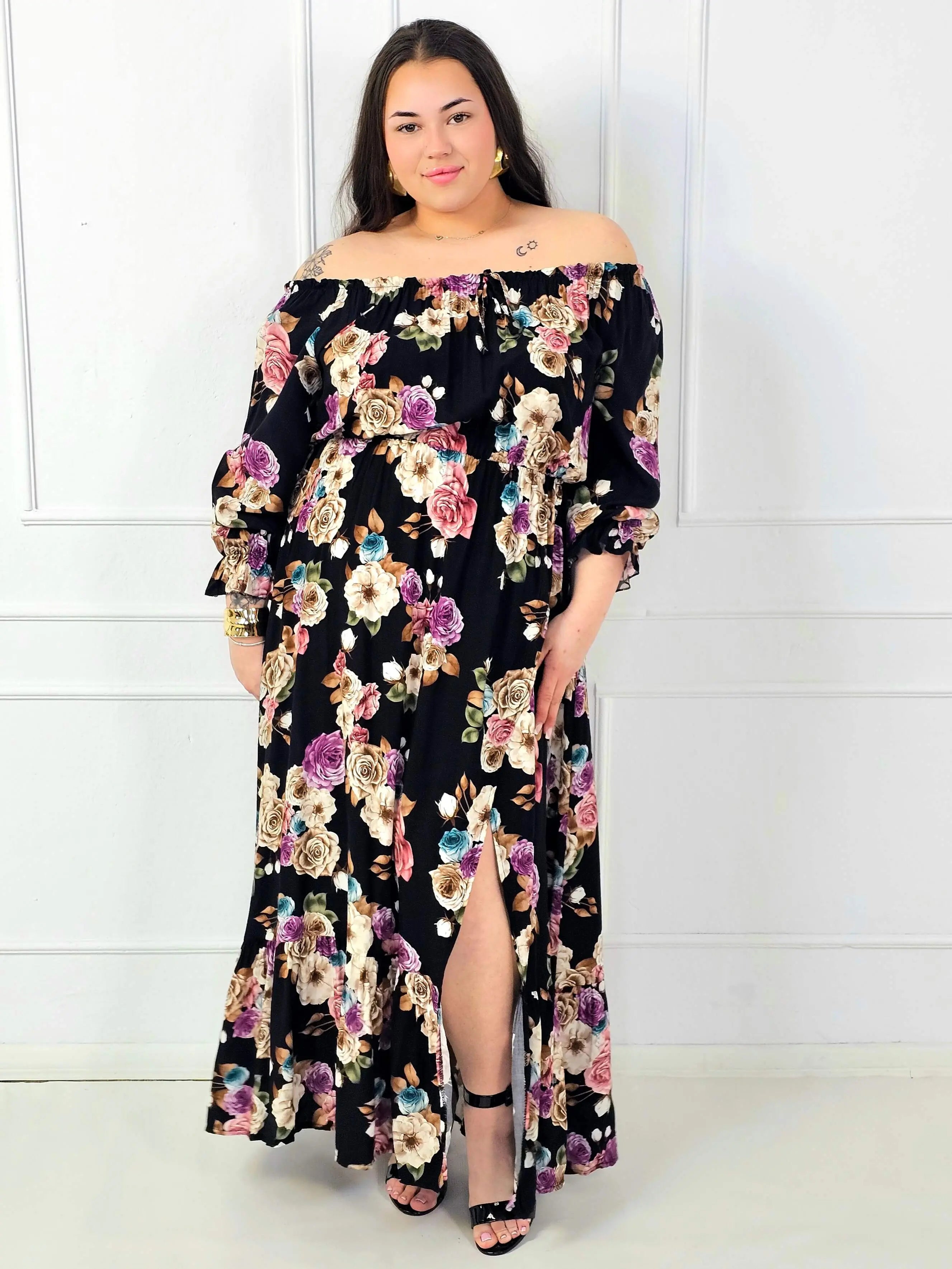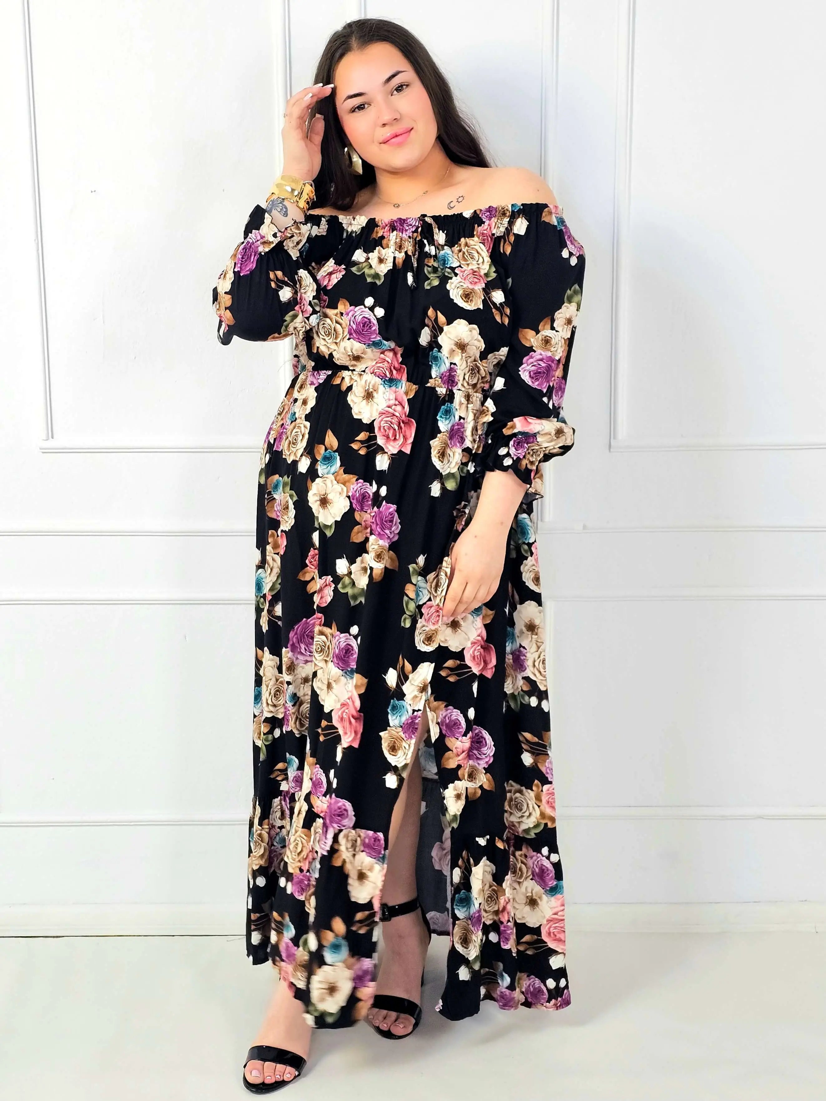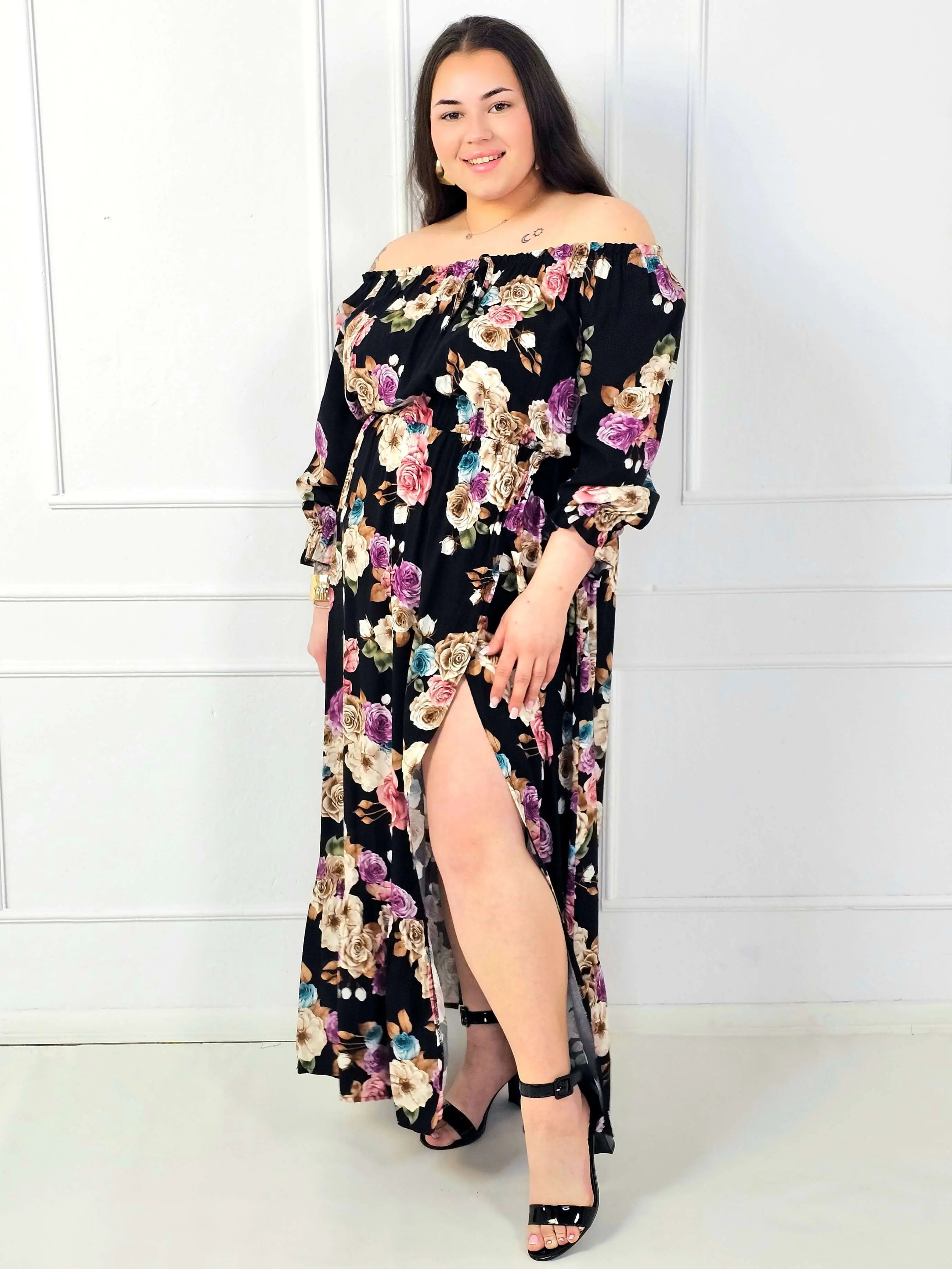 Rozkloszowany dół układa się lekko i nie opina bioder, dzięki czemu sukienka plus size jest bardzo komfortowa także przy większych rozmiarach. Dodatkowym atutem jest rozcięcie z przodu, które dodaje lekkości, wydłuża optycznie nogi i podkręca stylizację. Kwiatowy print na czarnym tle wygląda elegancko i ponadczasowo – pasuje zarówno do sandałów, jak i do butów na obcasie.