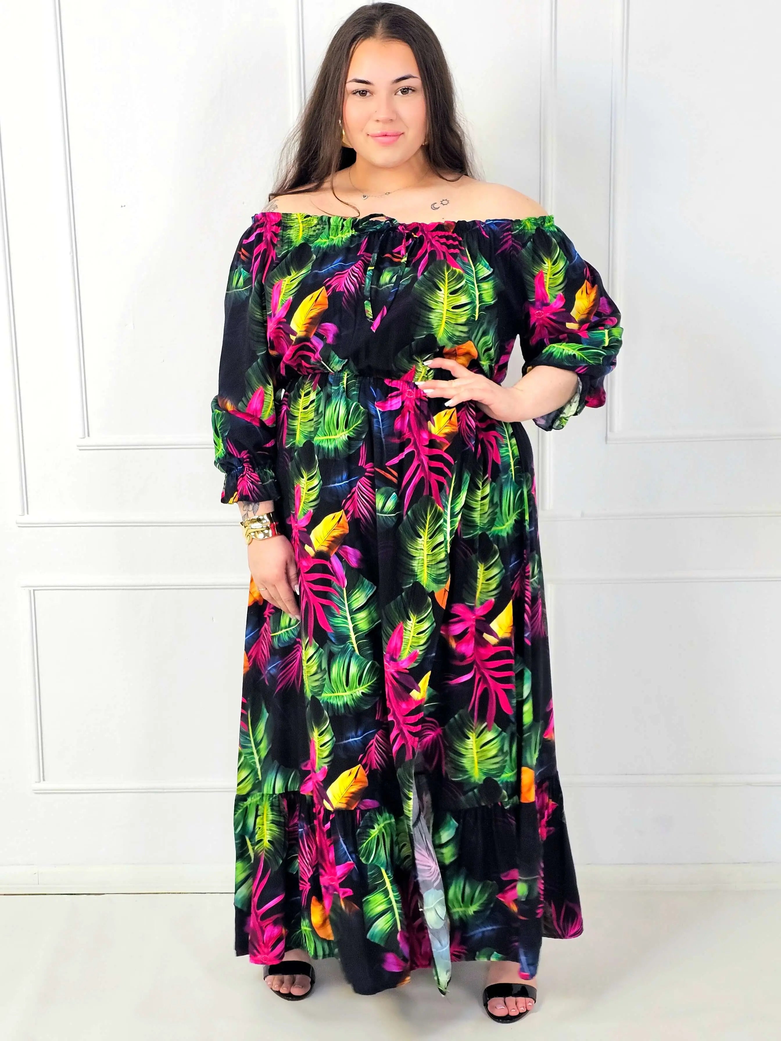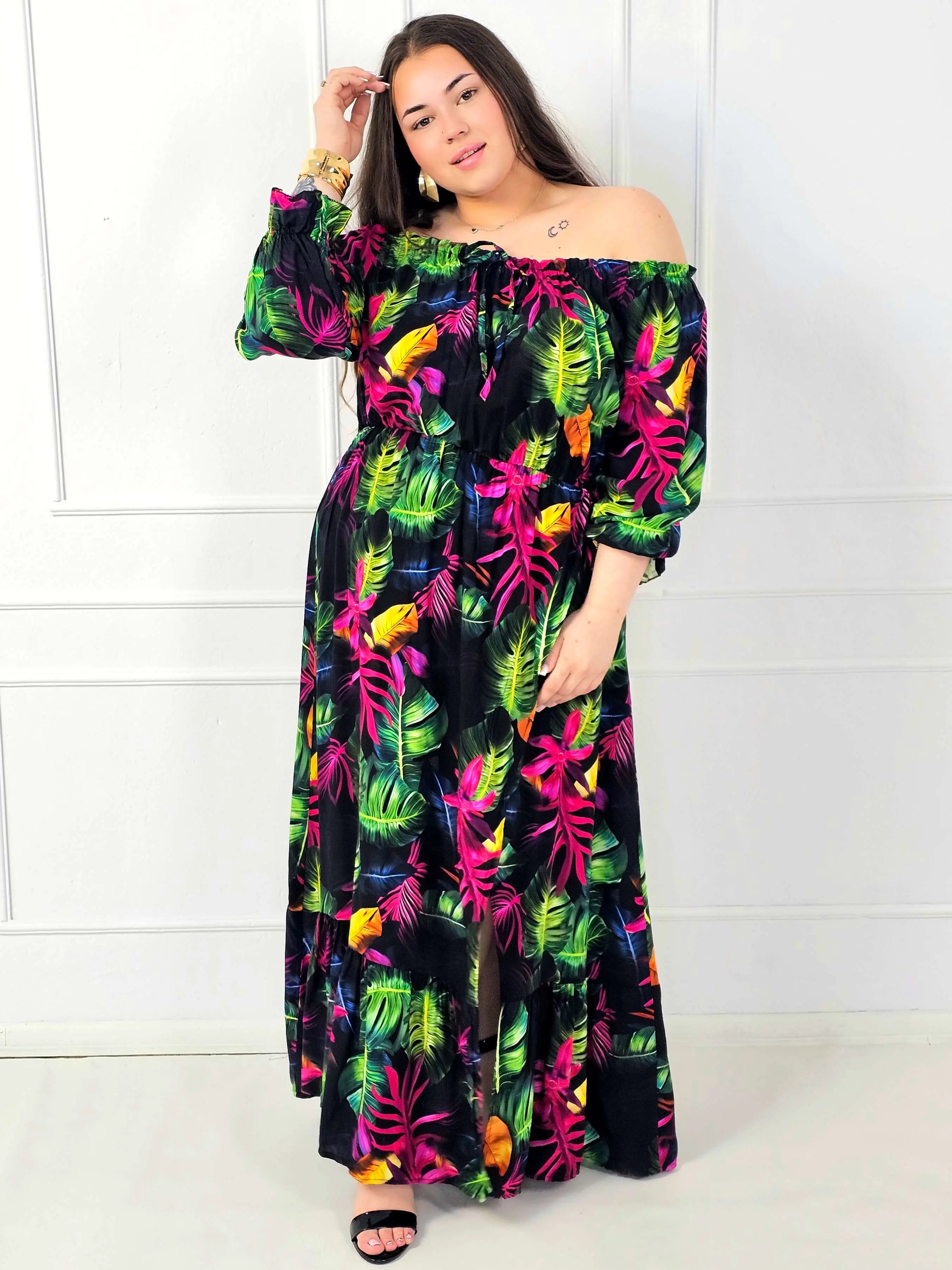 Sukienka plus size maxi w tropikalny wzór to propozycja dla kobiet, które lubią mocny print i styl, który robi wrażenie bez dodatków. Fason typu hiszpanka pięknie eksponuje ramiona, a elastyczny dekolt dopasowuje się do sylwetki, dzięki czemu sukienka plus size jest wygodna i stabilnie trzyma się na miejscu. To idealny wybór na lato, wakacje, imprezy w plenerze oraz każdą okazję, gdy chcesz wyglądać kobieco i czuć pełen komfort.