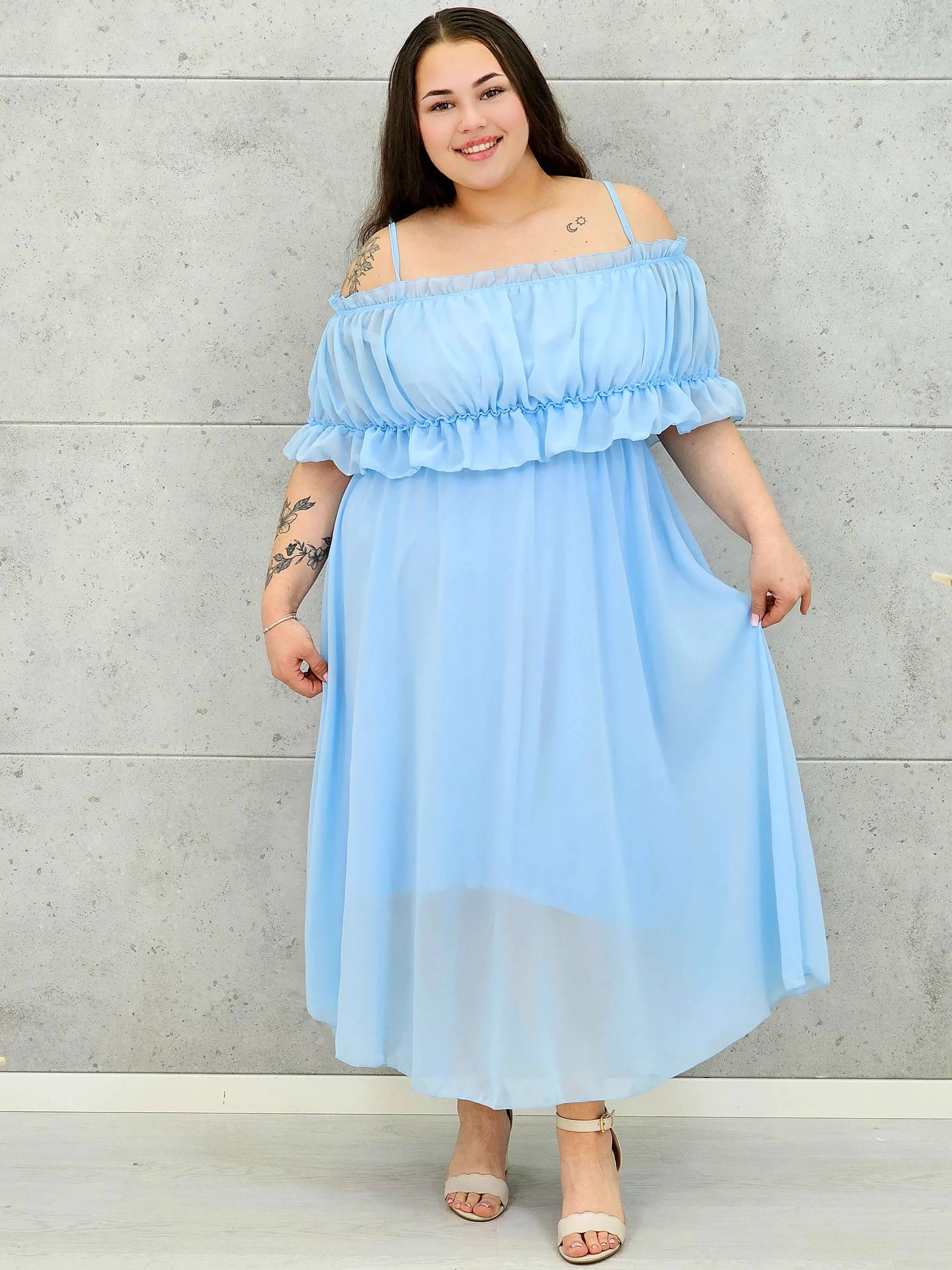 Sukienka plus size w tym modelu zachwyca swoją subtelną lekkością, delikatnym wykończeniem oraz ponadczasową, kobiecą formą. Głównym elementem dekoracyjnym jest efektowna podwójna falbana na górze, która pięknie układa się na sylwetce i dodaje sukience romantycznego charakteru. Regulowane ramiączka oraz możliwość noszenia hiszpanki zapewniają wygodę i większe możliwości stylizacji.
