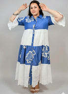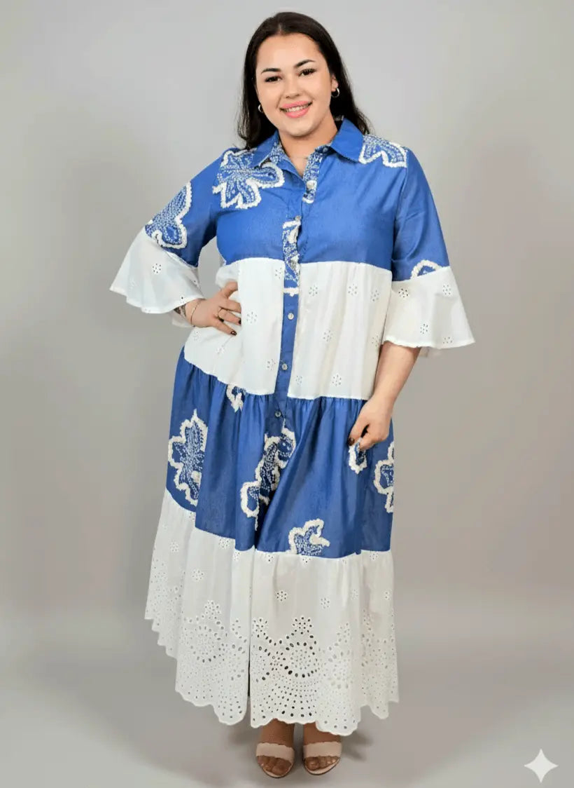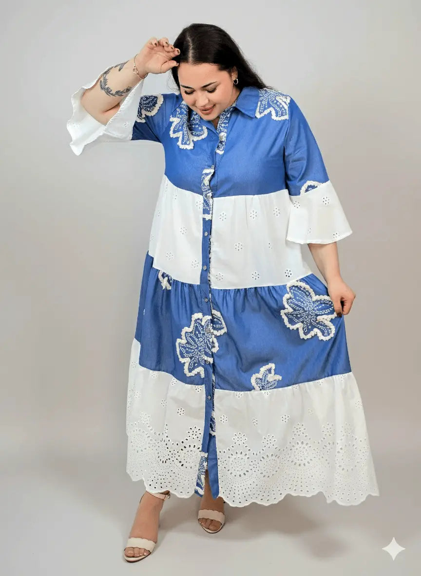 Sukienka plus size maxi z haftowanymi panelami i falbanami