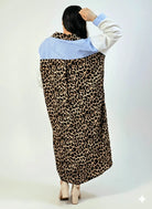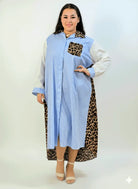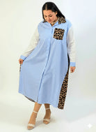 Sukienka plus size ma kołnierz i zapięcie na guziki, co pozwala nosić ją na różne sposoby: jako sukienkę, lekką narzutkę lub tunikę do spodni. Z przodu uwagę przyciąga kieszeń, która podkreśla koszulowy charakter, a kontrastowe wstawki nadają całości wyrazistego stylu. Dzięki temu sukienka plus size świetnie pasuje zarówno do stylizacji miejskich, jak i bardziej eleganckich.