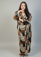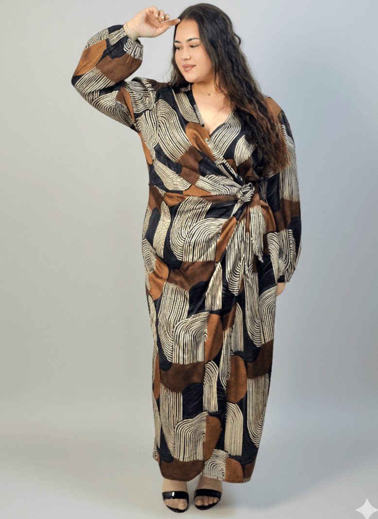Sukienka plus size szlafrokowa maxi to model, który pięknie układa się na sylwetce i daje pełną kontrolę nad dopasowaniem. Kopertowy krój z dekoltem V wysmukla górę i optycznie wydłuża szyję, a pasek w talii pozwala regulować obwód i podkreślić wcięcie dokładnie tak, jak lubisz. Na zdjęciu widać wyrazisty, geometryczny wzór w odcieniach czerni, beżu i karmelu, który wygląda bardzo „premium” i świetnie wpisuje się w modę plus size.