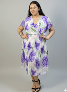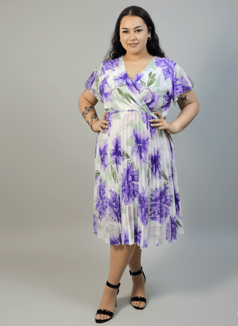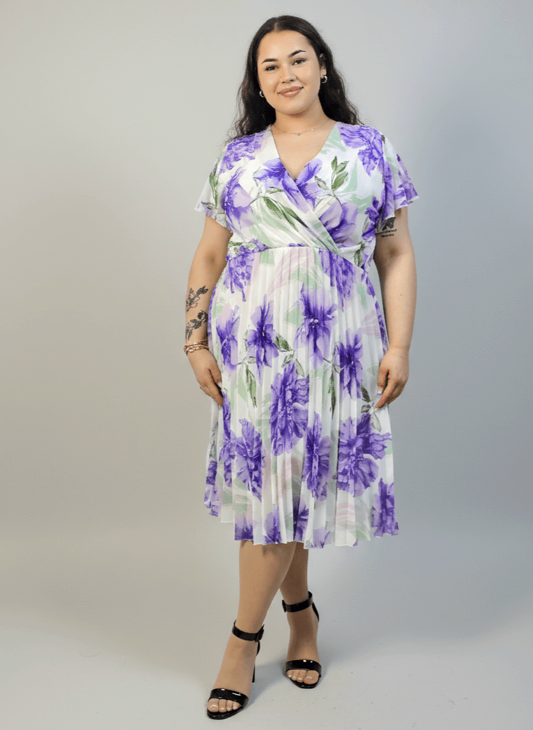 Sukienka plus size w fioletowe kwiaty – kopertowy dekolt i plisowany dół