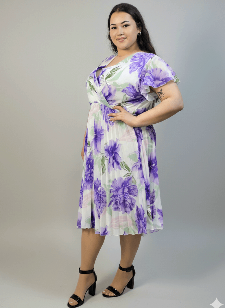 Sukienka plus size w fioletowy, kwiatowy print na jasnym tle to model, który od razu wygląda świeżo i elegancko. Kopertowy dekolt w kształcie litery V pięknie podkreśla biust i optycznie wysmukla górę sylwetki, a odcięcie w talii pomaga zbudować proporcje. Plisowany dół dodaje lekkości w ruchu i sprawia, że stylizacja prezentuje się bardzo efektownie – zarówno na co dzień, jak i na większe wyjścia.