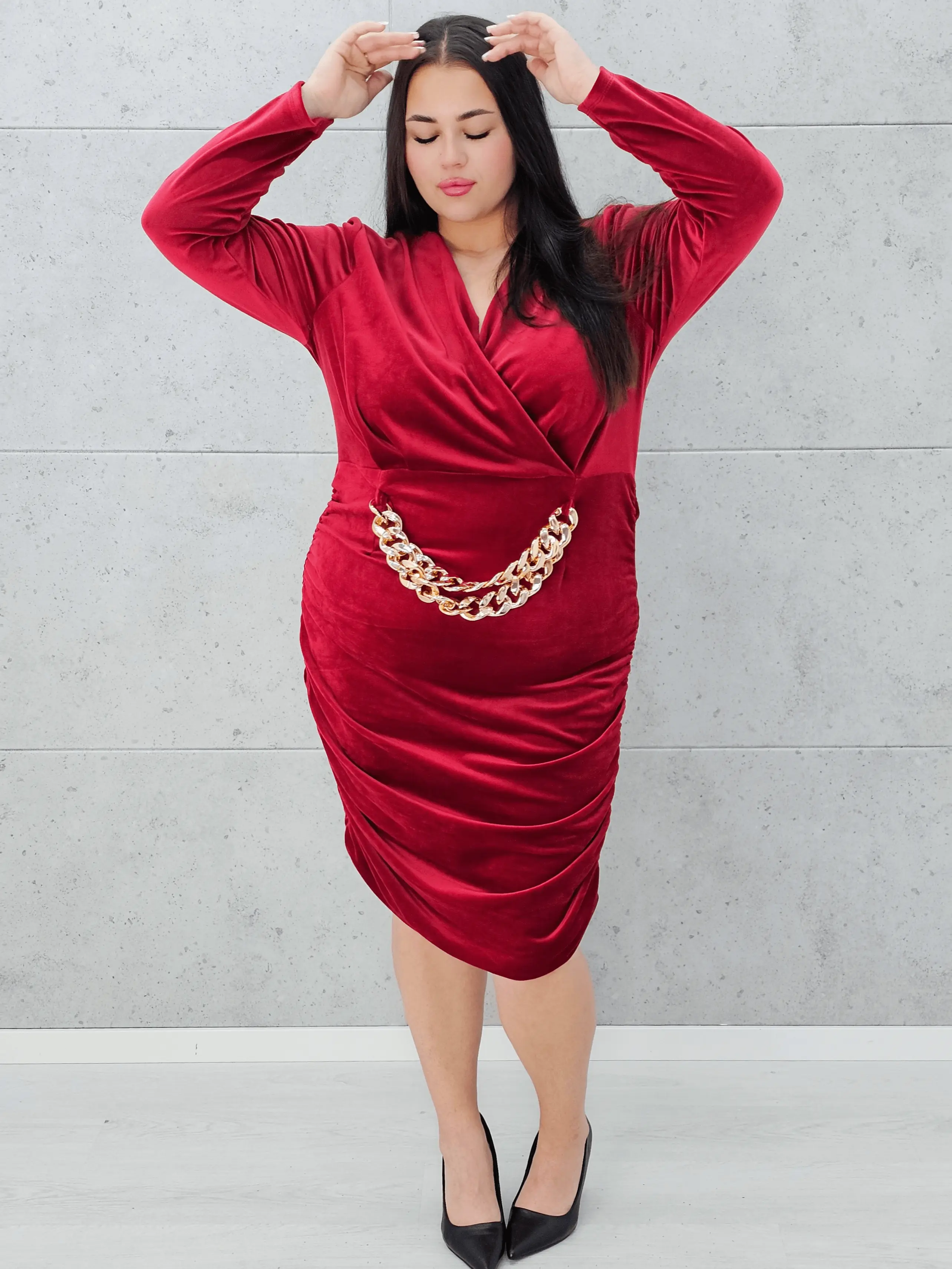 Ta sukienka to połączenie klasy, zmysłowości i nuty luksusu. Głęboka czerwień weluru przyciąga spojrzenia, a złoty łańcuch w talii pięknie podkreśla sylwetkę. Kopertowy dekolt, kobiece marszczenia i długość za kolano czynią ją idealnym wyborem na święta, sylwestra czy elegancką kolację
