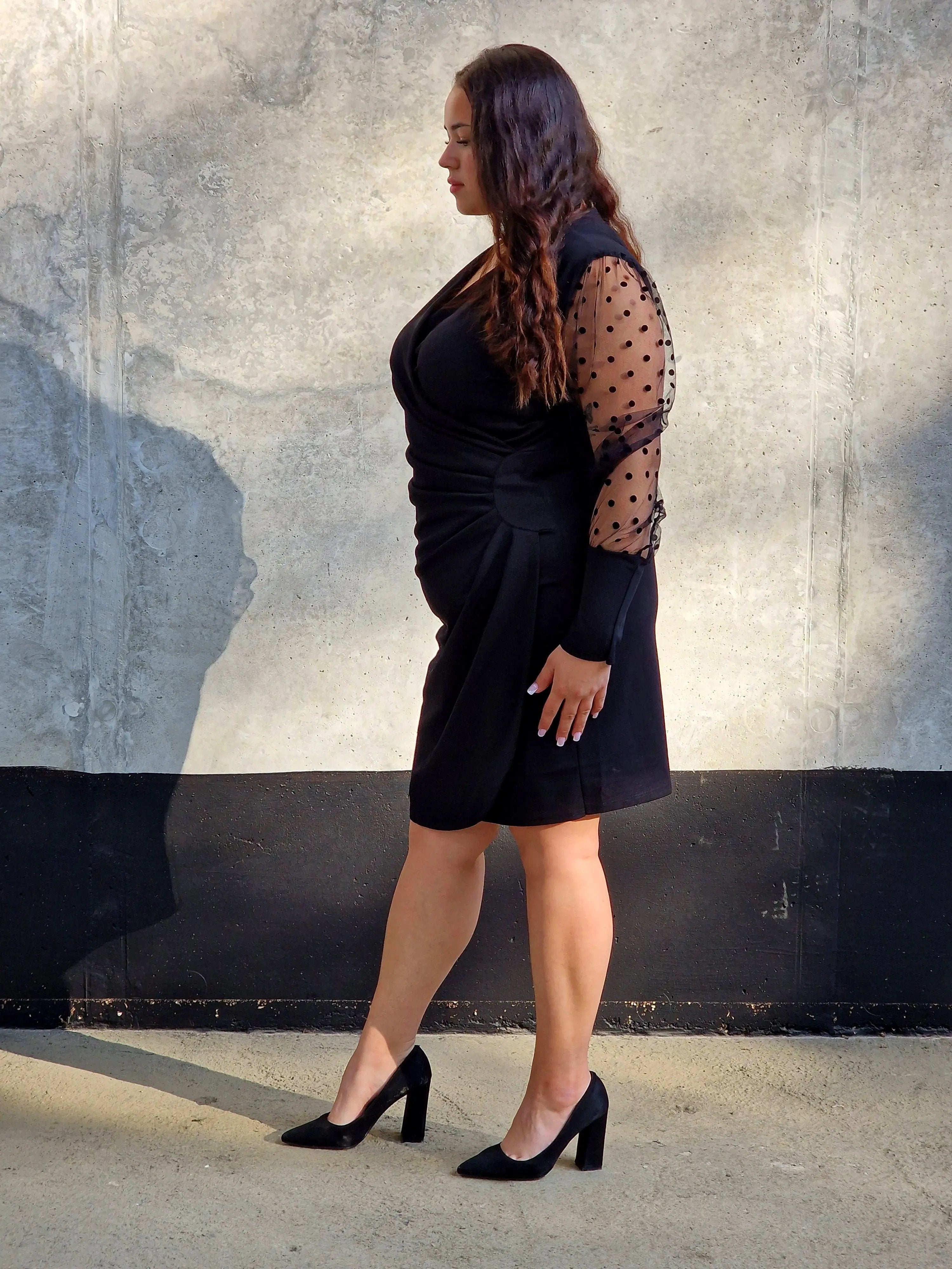 Najbardziej przykuwającym uwagę detalem są transparentne rękawy wykonane z tiulu, ozdobione delikatnym, kropkowanym wzorem. Ten unikalny akcent dodaje sukience lekkości i nowoczesnego stylu, a elastyczne wykończenie rękawów zapewnia wygodę i swobodę ruchu.