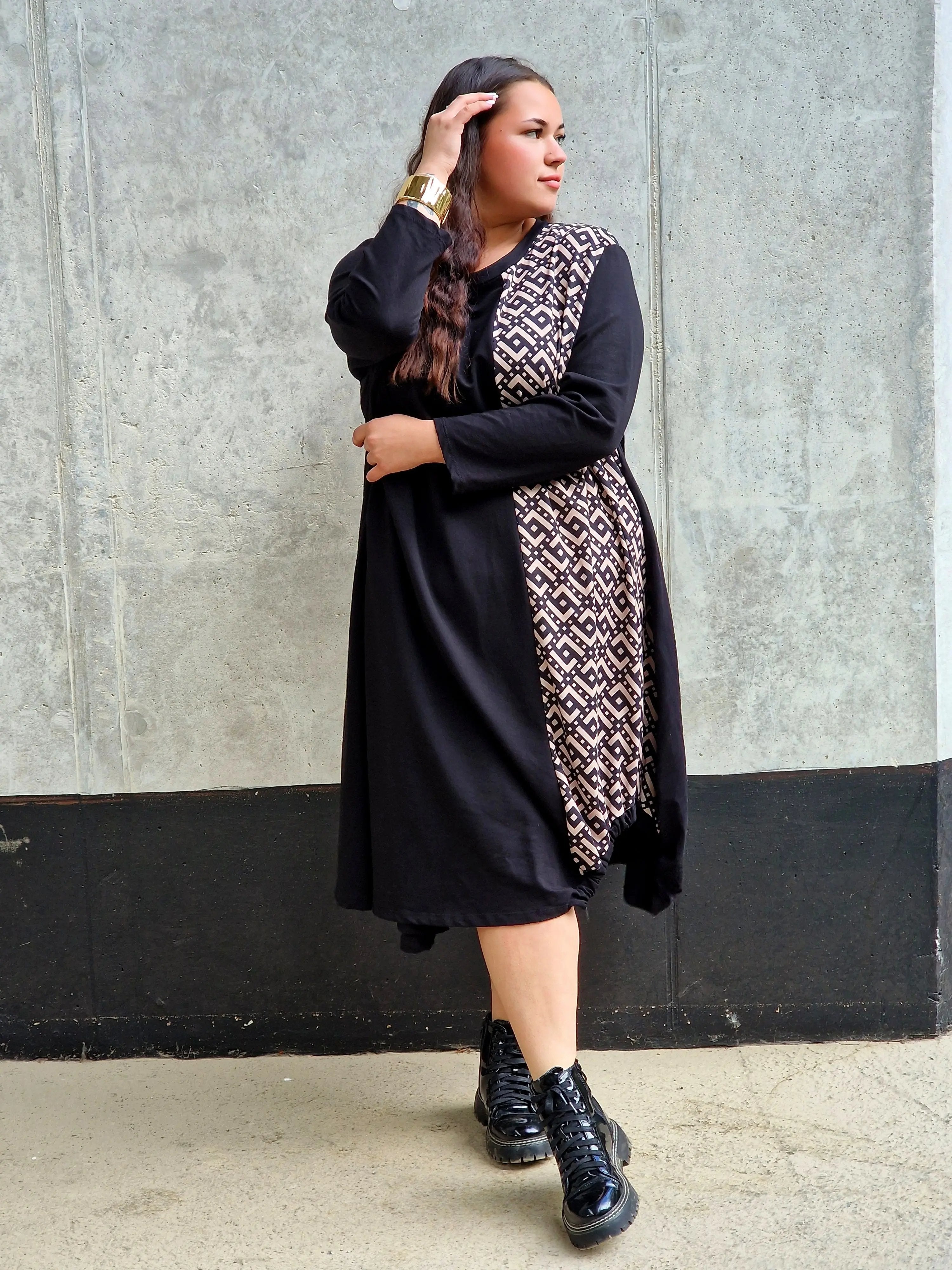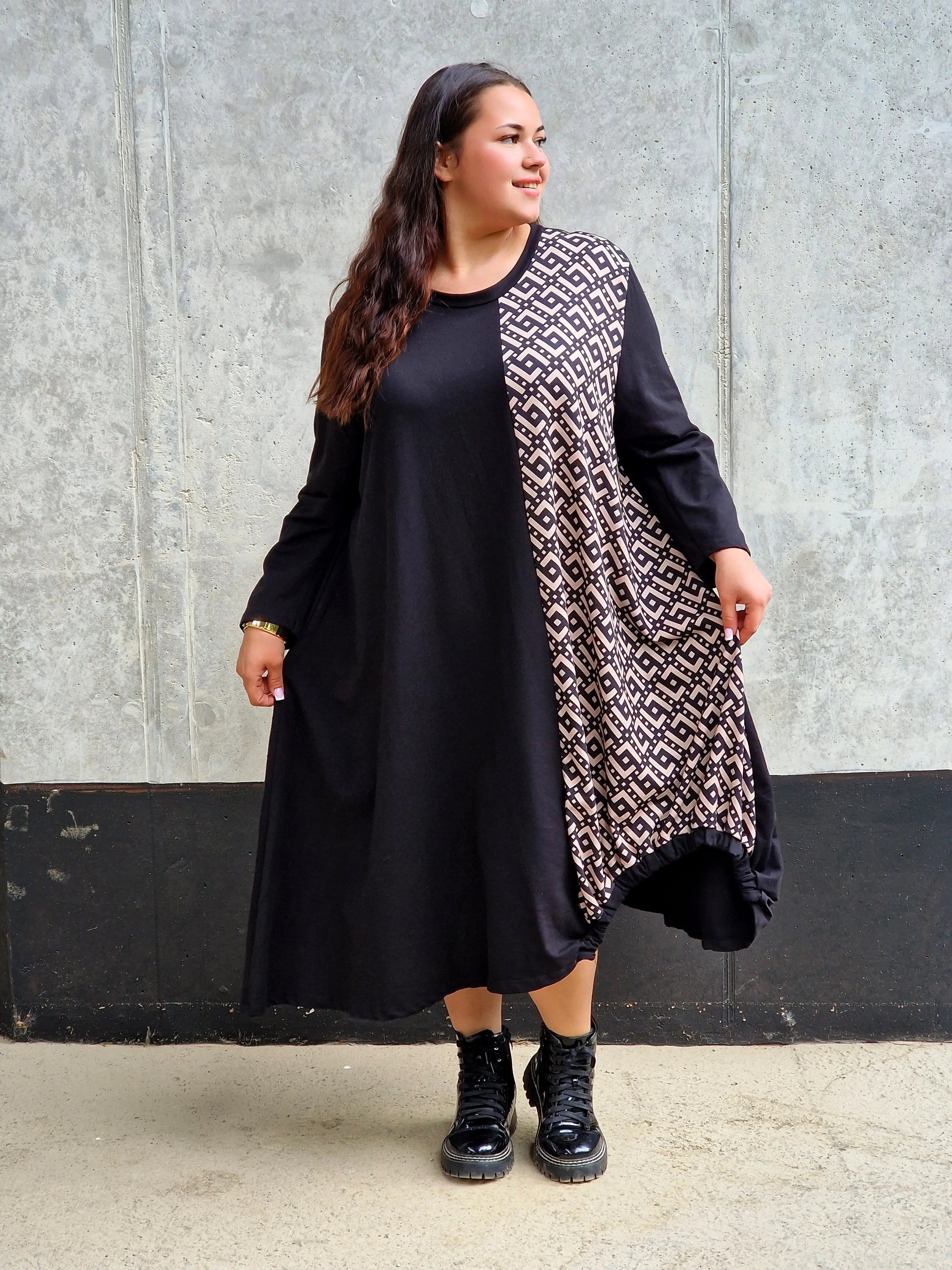 Ta sukienka to połączenie klasyki z odrobiną artystycznego twistu. Luźny krój, kontrastowy panel z geometrycznym wzorem i asymetryczna długość tworzą niezwykle efektowny, a zarazem wygodny fason. To idealny wybór na wyjątkowe okazje i codzienne stylizacje z nutą nonszalancji.