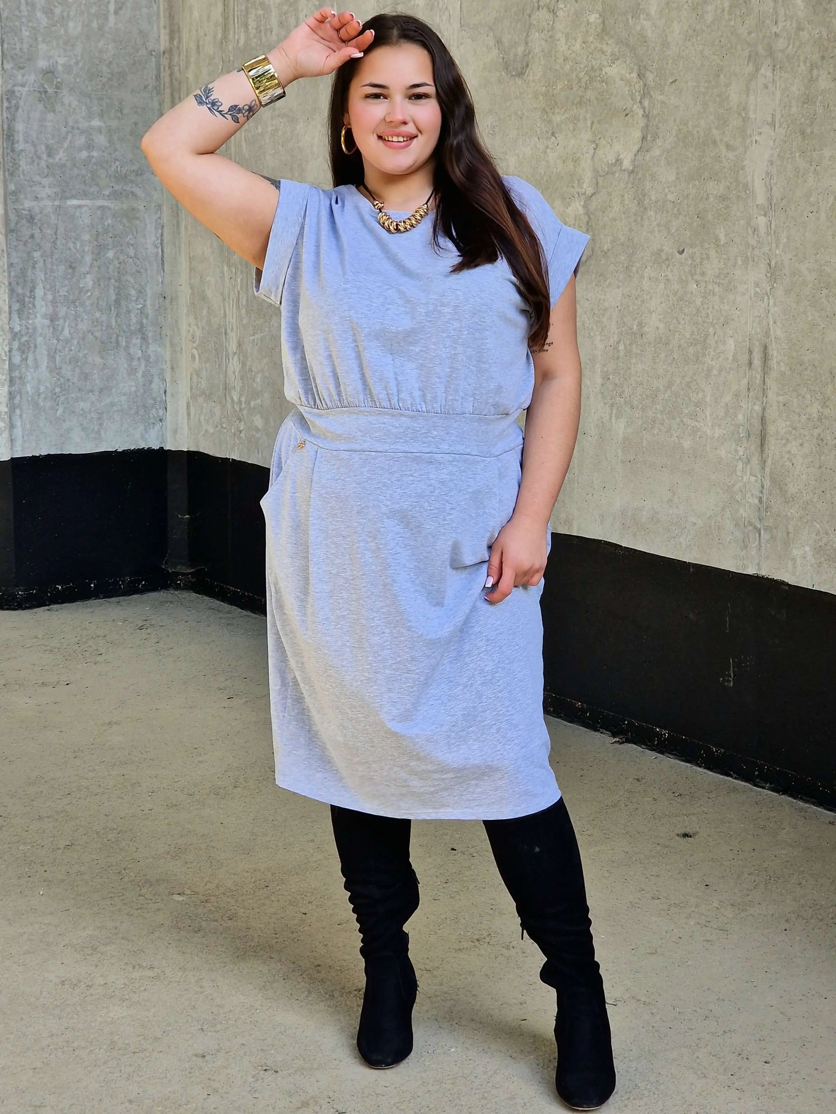 Sukienka ma krótki rękaw, luźny fason, który nie opina sylwetki, oraz delikatny pasek w talii, pozwalający dopasować ją do kształtu figury. To rozwiązanie, które podkreśla kobiece kształty, a jednocześnie zapewnia pełen komfort przez cały dzień.