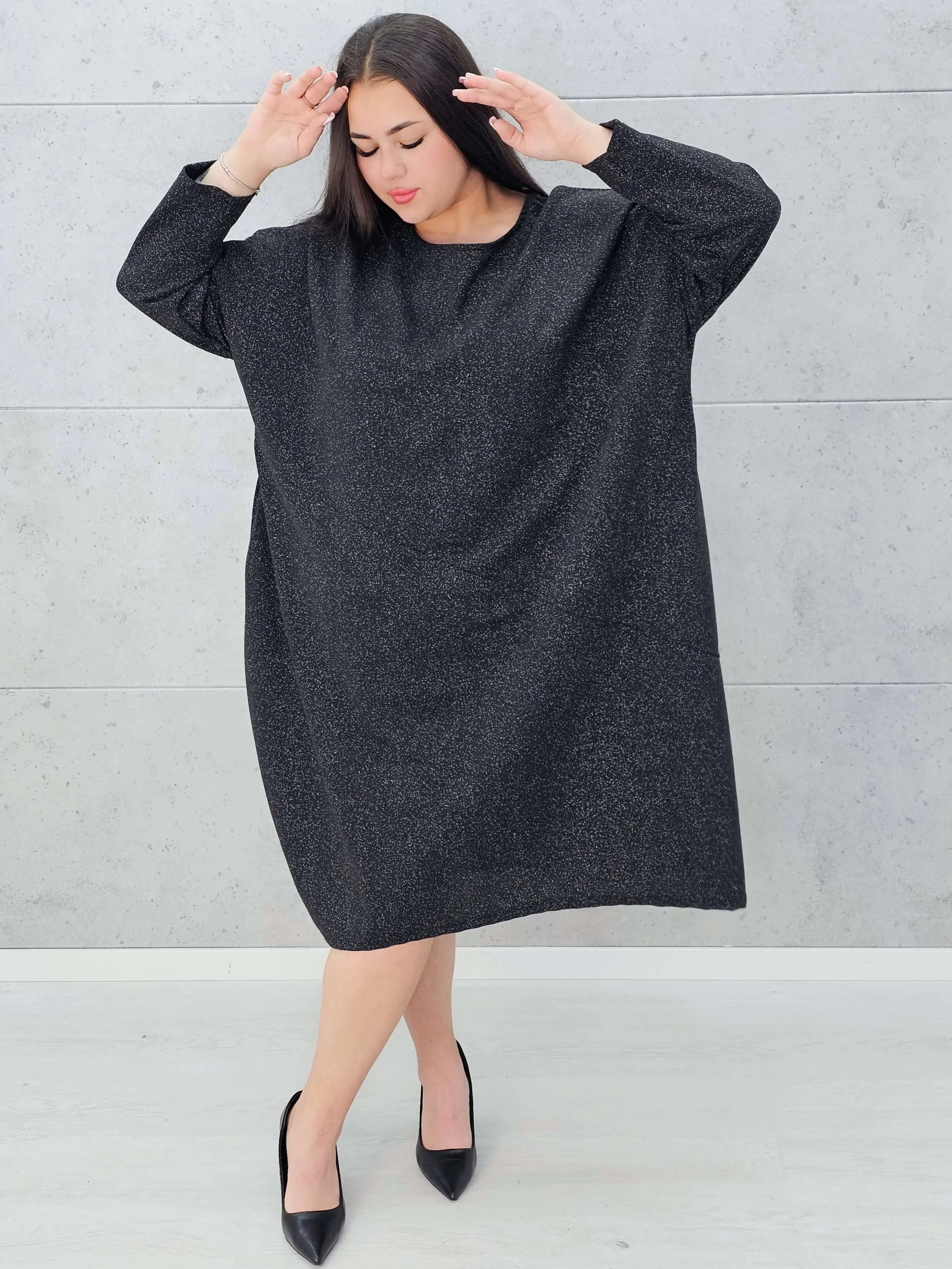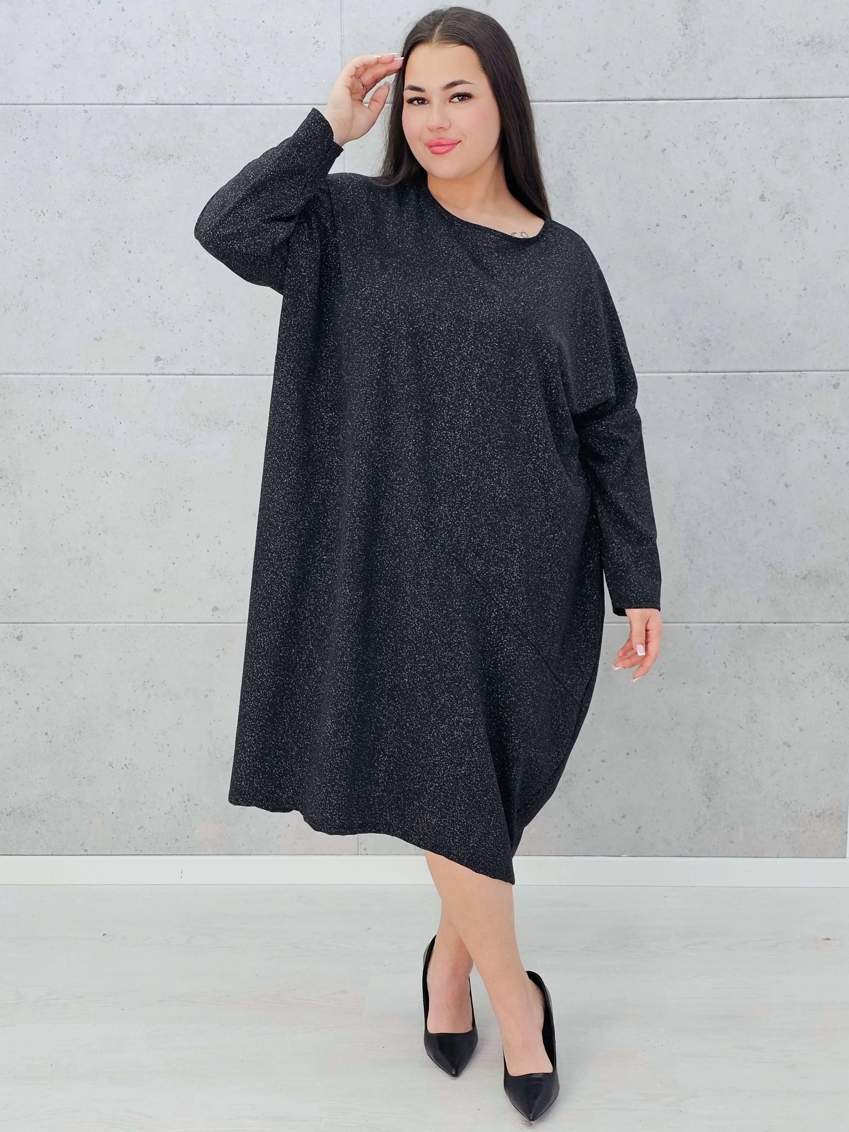 Prosta, a jednocześnie niezwykle efektowna.Ta czarna sukienka z połyskiem to idealna propozycja dla kobiet, które cenią elegancję w wygodnym wydaniu. Lekko oversize’owy krój gwarantuje swobodę ruchów i pełen komfort przez cały dzień.