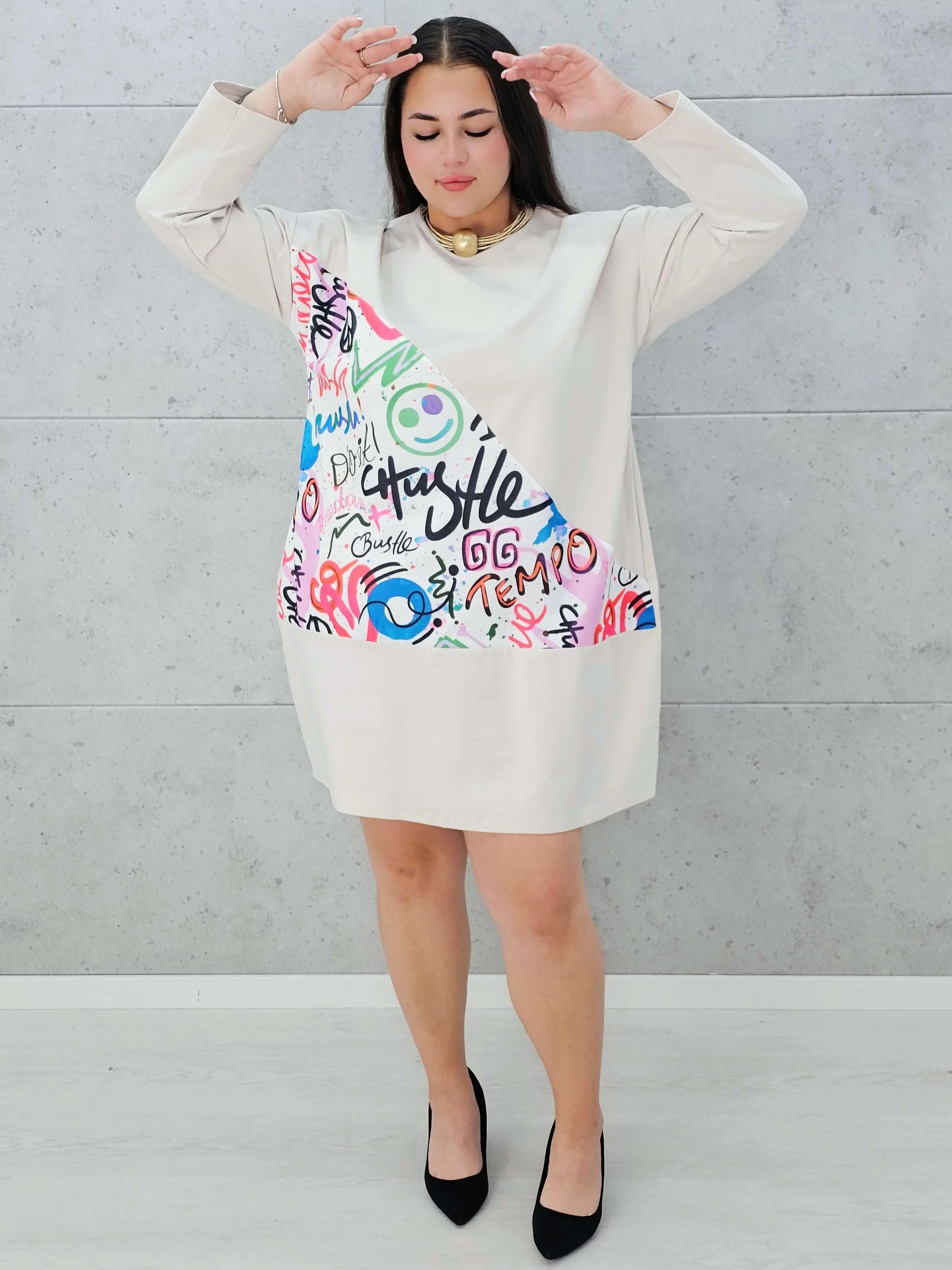 Na przodzie sukienki umieszczona jest oryginalna wstążka z napisem. Wstawka ta dodaje sukience unikalnego charakteru i wyrazistego stylu.