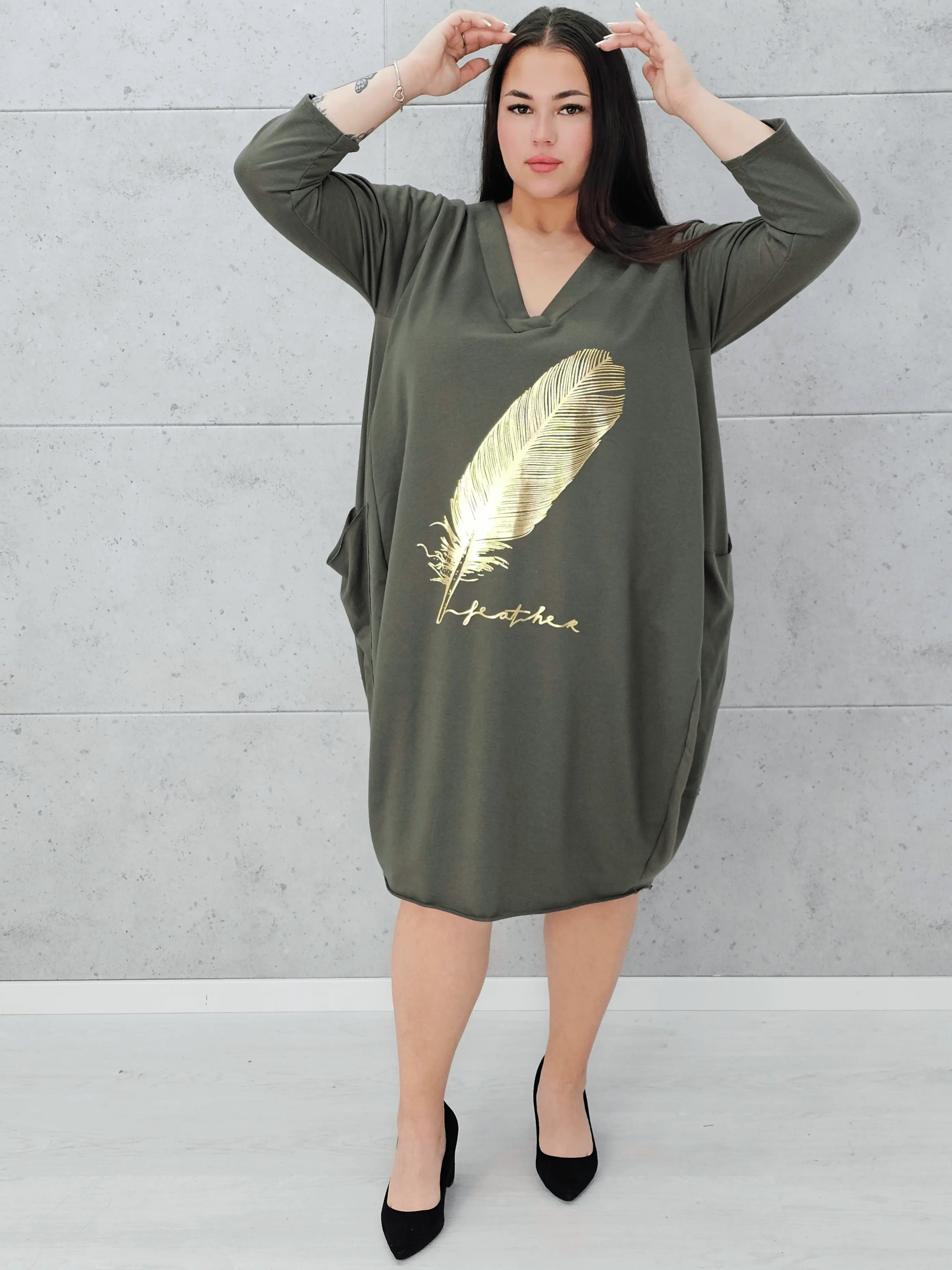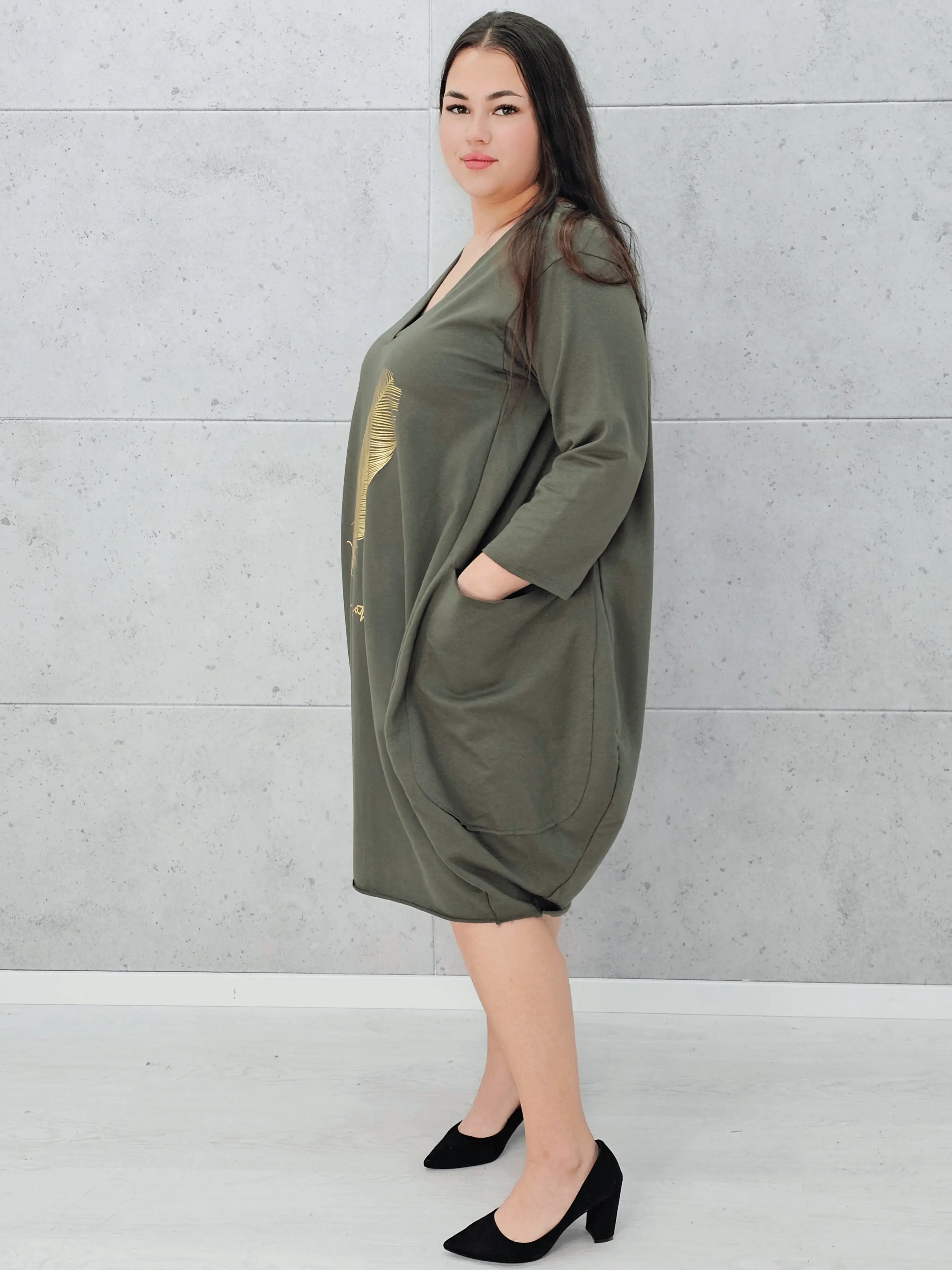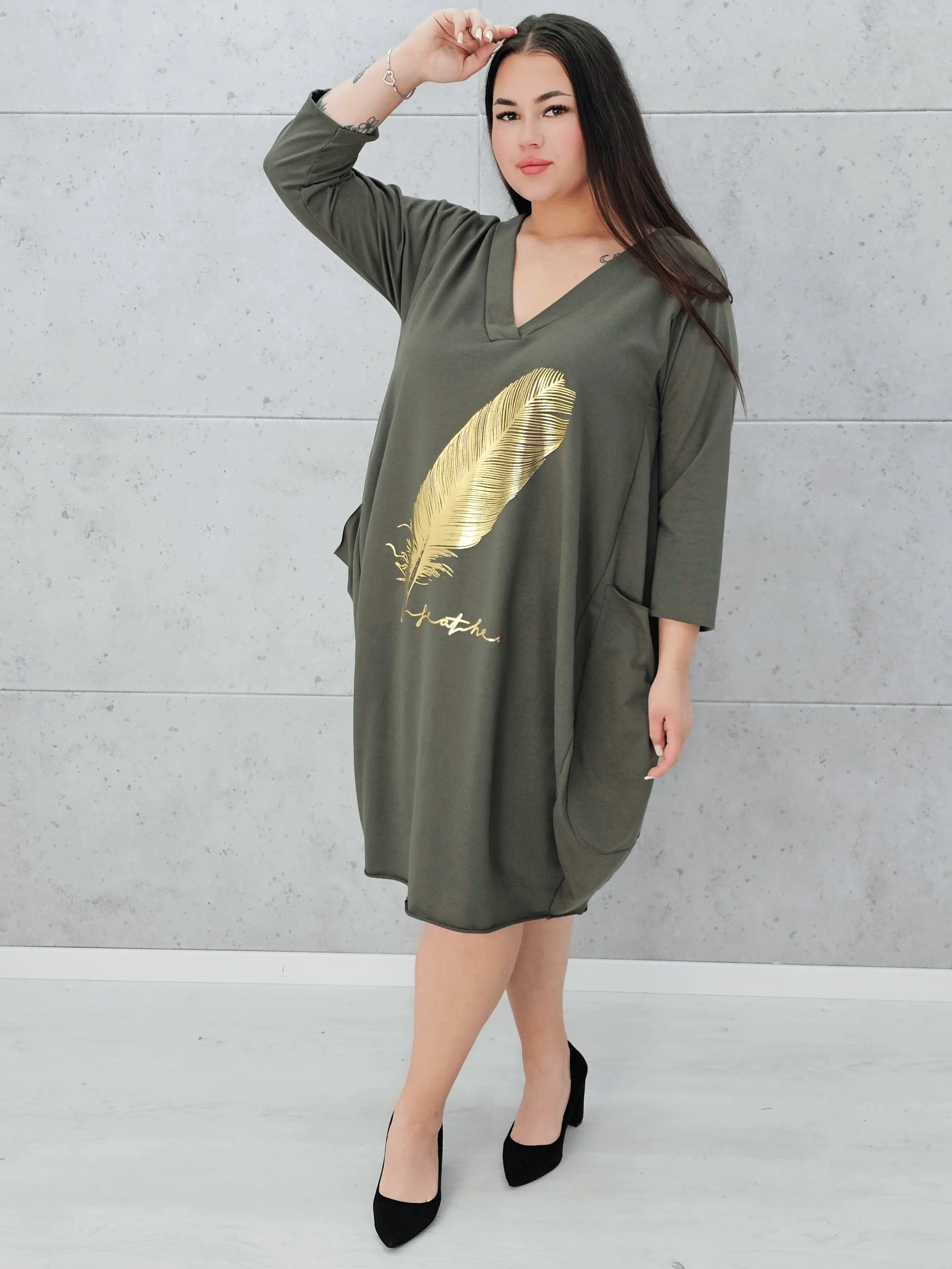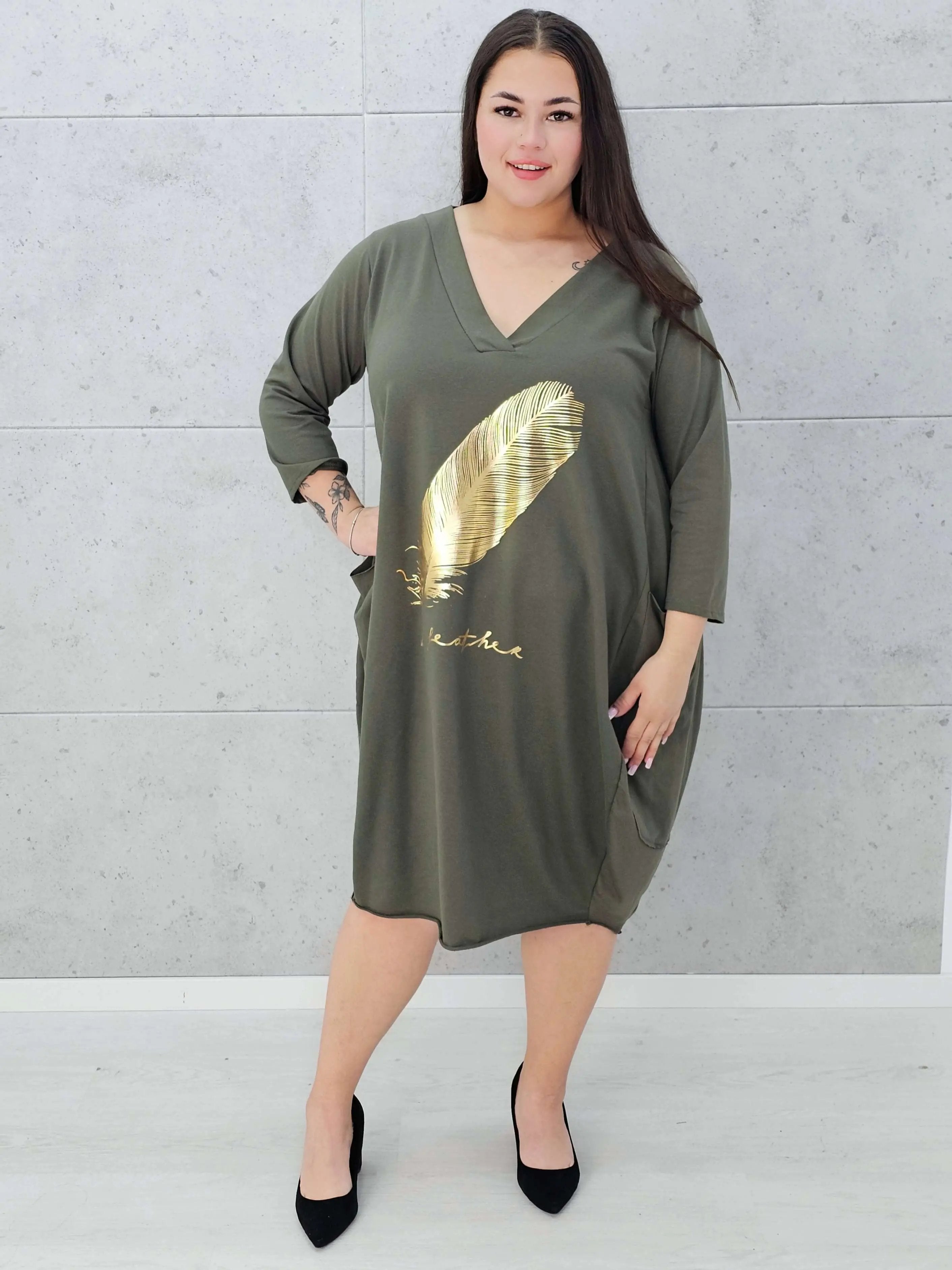 Szukasz sukienki, która łączy wygodę z modnym wyglądem? Ta sukienka z złotym piórem plus size to strzał w dziesiątkę!