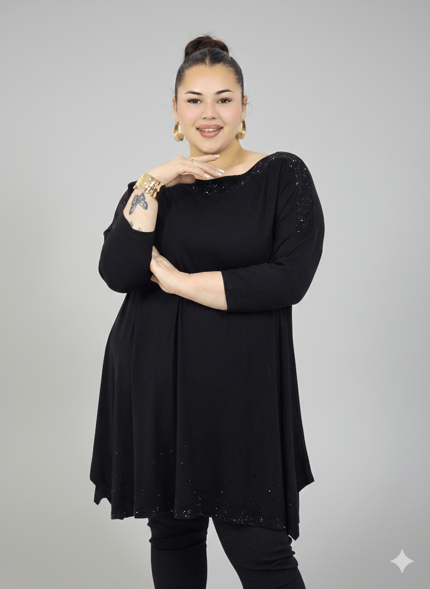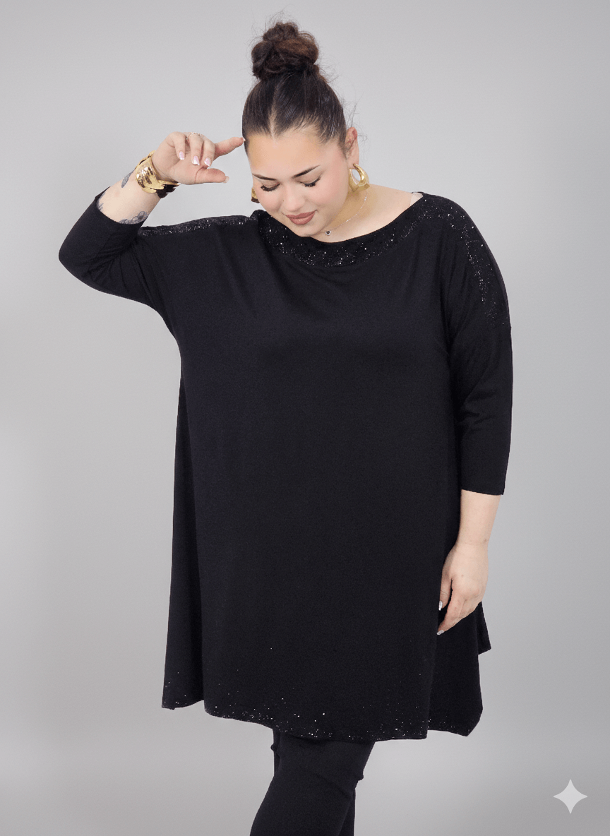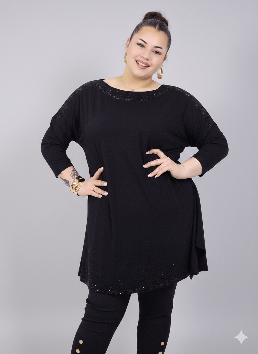 Tunika plus size w klasycznej czerni to ponadczasowa propozycja dla kobiet, które cenią komfort i styl w modzie plus size. Luźny, swobodny krój pięknie układa się na sylwetce, nie opina ciała i zapewnia pełną swobodę ruchów. Subtelny, delikatny połysk przy dekolcie oraz na dole tuniki dodaje elegancji i sprawia, że model świetnie sprawdzi się nie tylko na co dzień, ale również na wyjścia czy spotkania rodzinne. To idealna tunika plus size, która łączy prostotę z kobiecym charakterem.