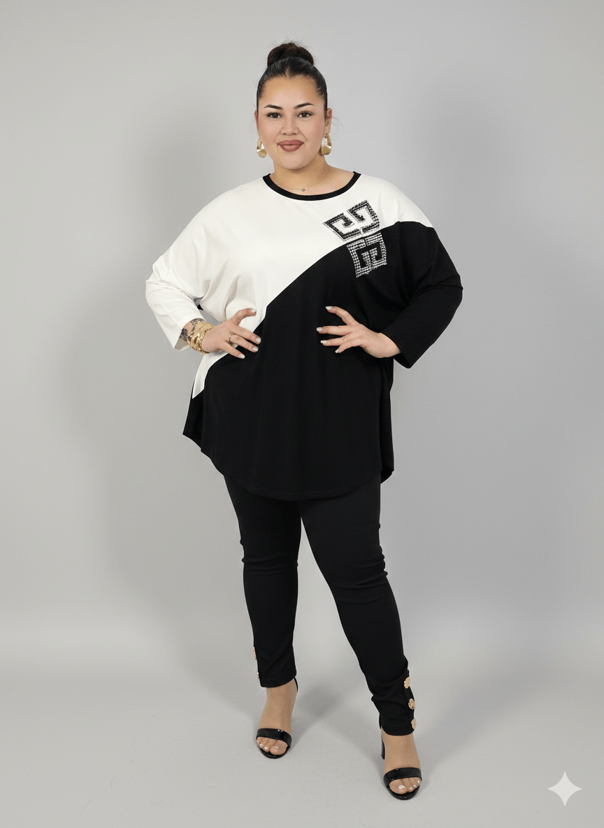 Tunika plus size to idealna propozycja dla kobiet, które cenią wygodę, modny wygląd i uniwersalność w codziennych stylizacjach. Model o luźnym, oversize’owym kroju pięknie układa się na sylwetce, nie opinając ciała i zapewniając pełen komfort noszenia przez cały dzień. Asymetryczne połączenie kolorów oraz dekoracyjna aplikacja nadają całości nowoczesnego charakteru i sprawiają, że tunika plus size wyróżnia się na tle klasycznych fasonów.