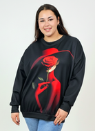 Bluza plus size wyróżnia się spektakularnym nadrukiem przedstawiającym kobiecą sylwetkę w czerwonym kapeluszu z różą zasłaniającą twarz. Kontrast czerwieni z czarnym tłem nadaje bluzie eleganckiego, zmysłowego charakteru i sprawia, że model przyciąga uwagę zarówno z przodu, jak i z tyłu. Masełkowa tkanina jest elastyczna, miękka i komfortowa w noszeniu przez cały dzień.