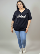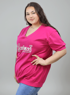 Bluzka plus size posiada luźniejszy fason z delikatnym wykończeniem u dołu, który maskuje okolice brzucha i bioder – kluczowy element w projektowaniu odzieży plus size dla kobiet. Krótkie rękawy zapewniają komfort nawet w cieplejsze dni, a długość bluzki pozwala nosić ją zarówno na wierzchu, jak i lekko wpuszczoną w spodnie.