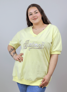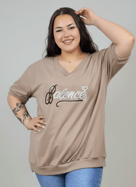 Bluzka plus size została wykonana z przyjemnej w dotyku, elastycznej dzianiny, która dopasowuje się do kształtów ciała i pozwala na swobodę ruchów. Ozdobny haft „Balance” z subtelnym sercem przyciąga wzrok i nadaje całości kobiecego charakteru. To doskonały wybór zarówno do codziennych stylizacji z jeansami, jak i do bardziej dopracowanych zestawów casualowych.