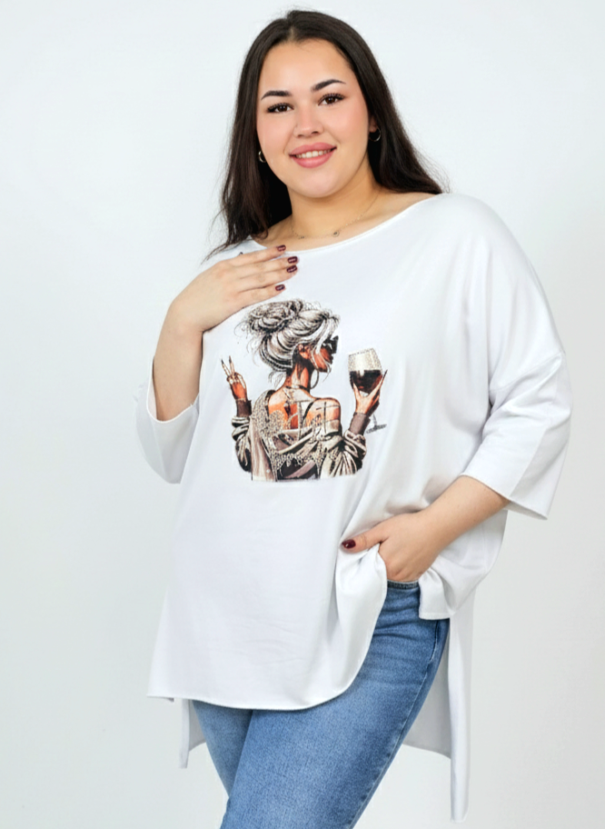 Bluzka plus size laserowo cięta z nadrukiem kobiety z kieliszkiem – nowoczesny styl XXL