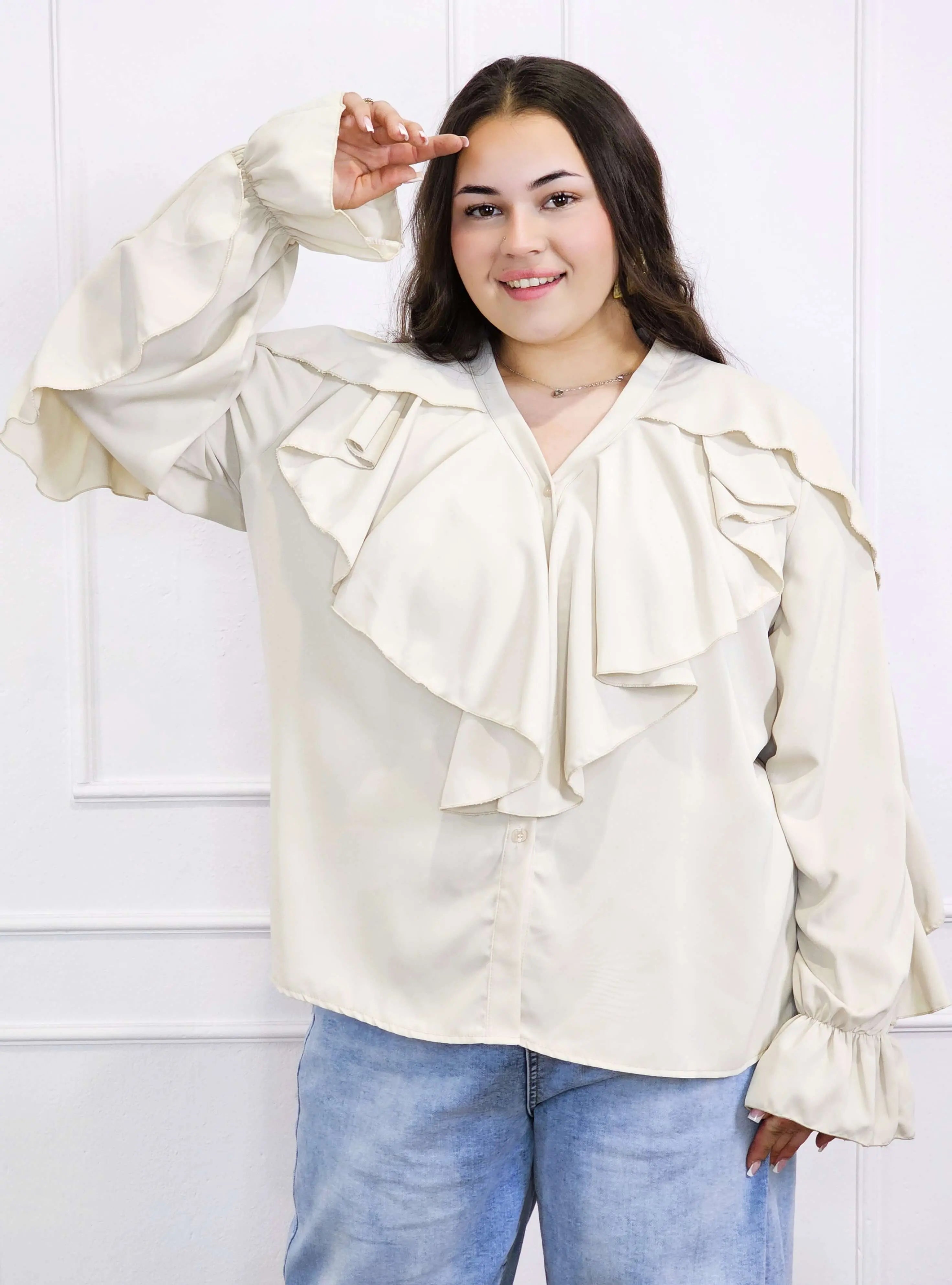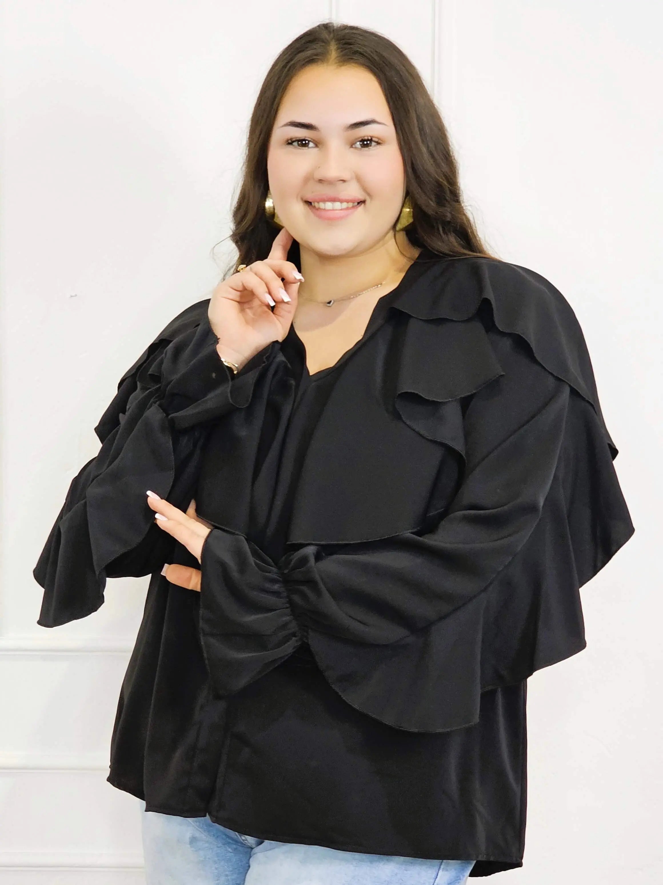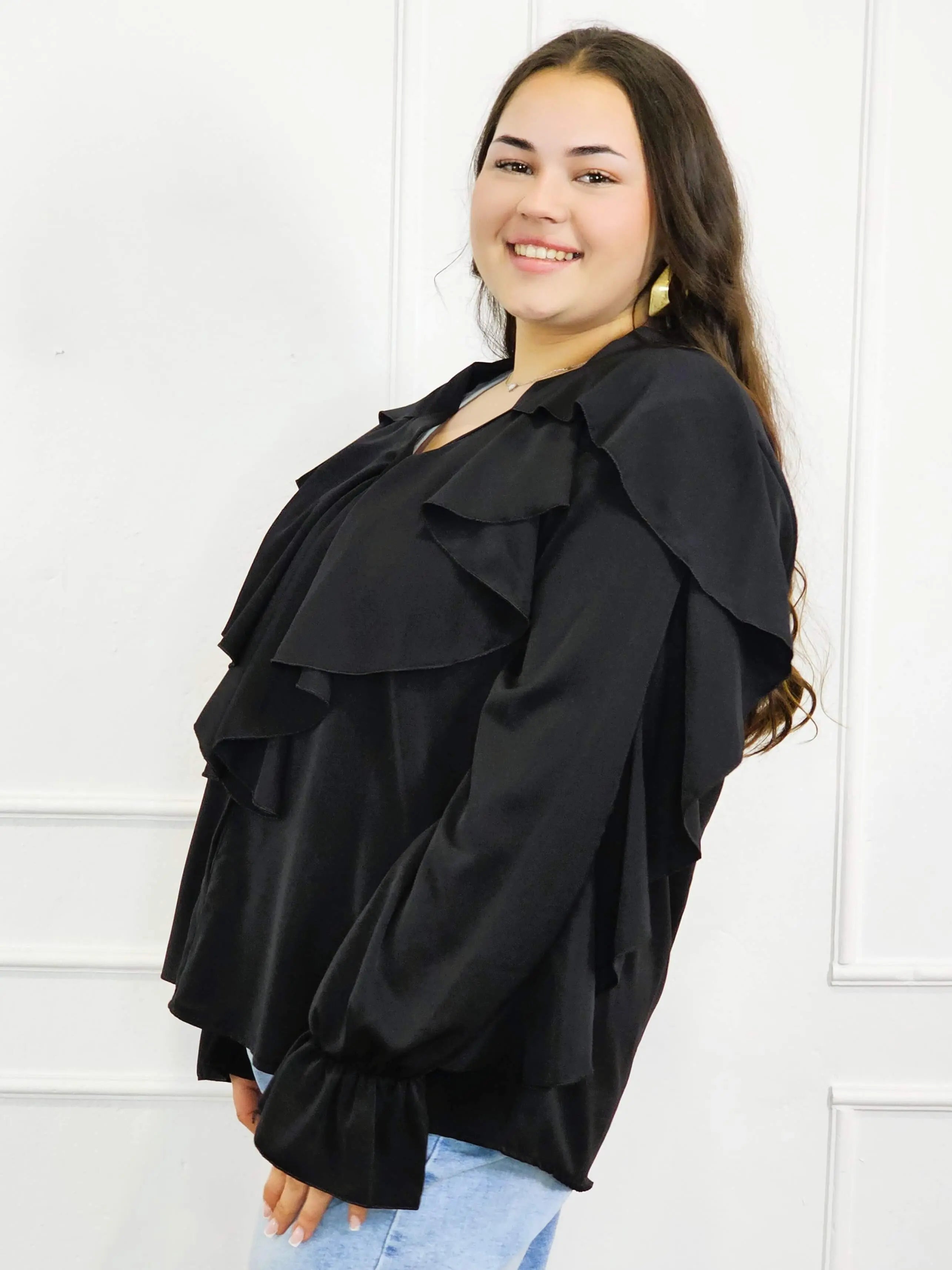 Dzięki efektownym falbanom przy dekolcie i ramionach, bluzka przyciąga wzrok i dodaje objętości tam, gdzie potrzeba – idealnie równoważąc proporcje sylwetki plus size. To doskonały wybór zarówno do pracy, jak i na spotkania rodzinne czy wieczorne wyjścia.