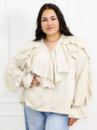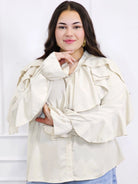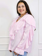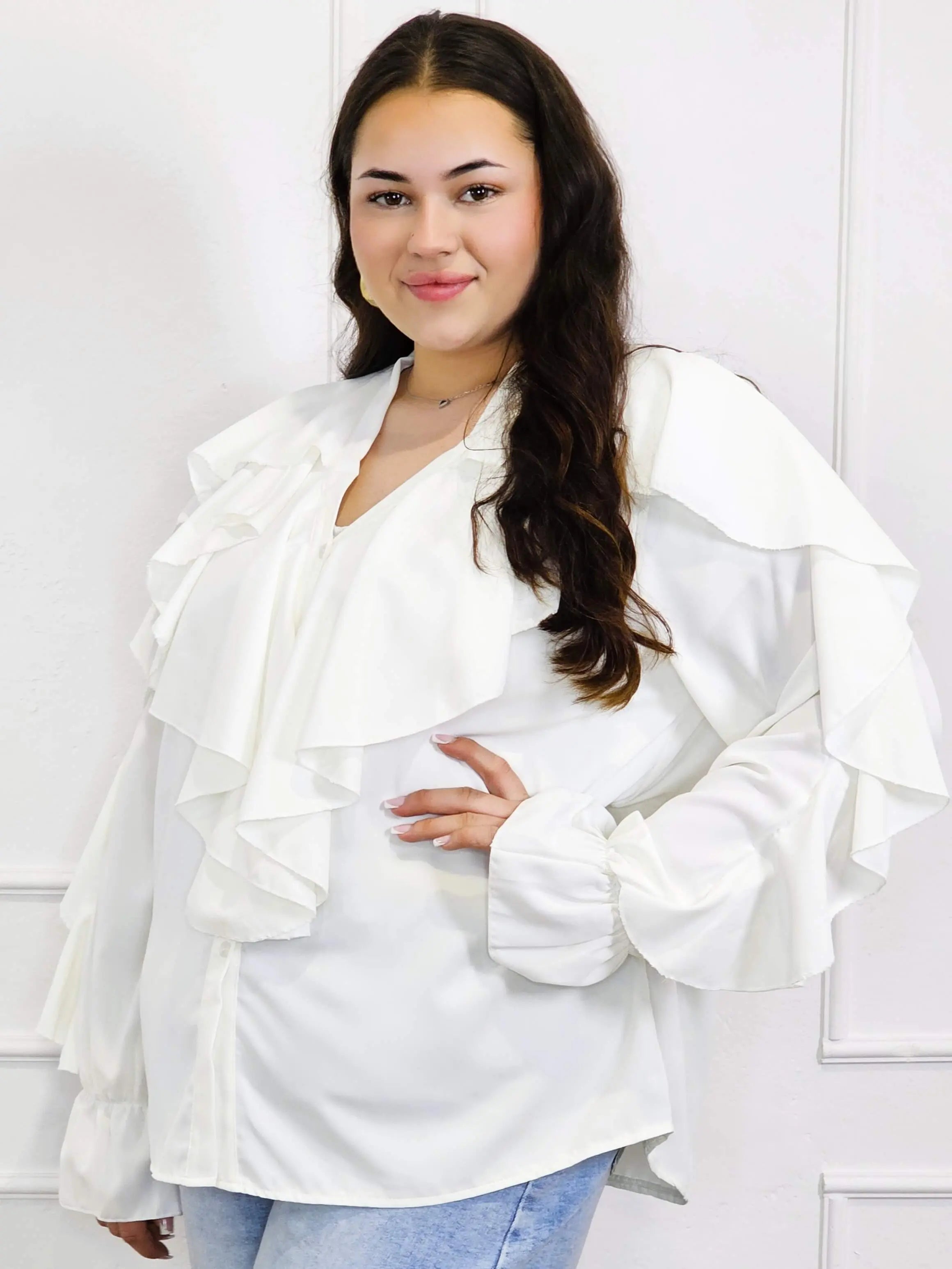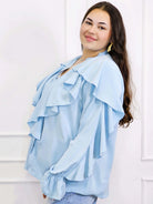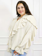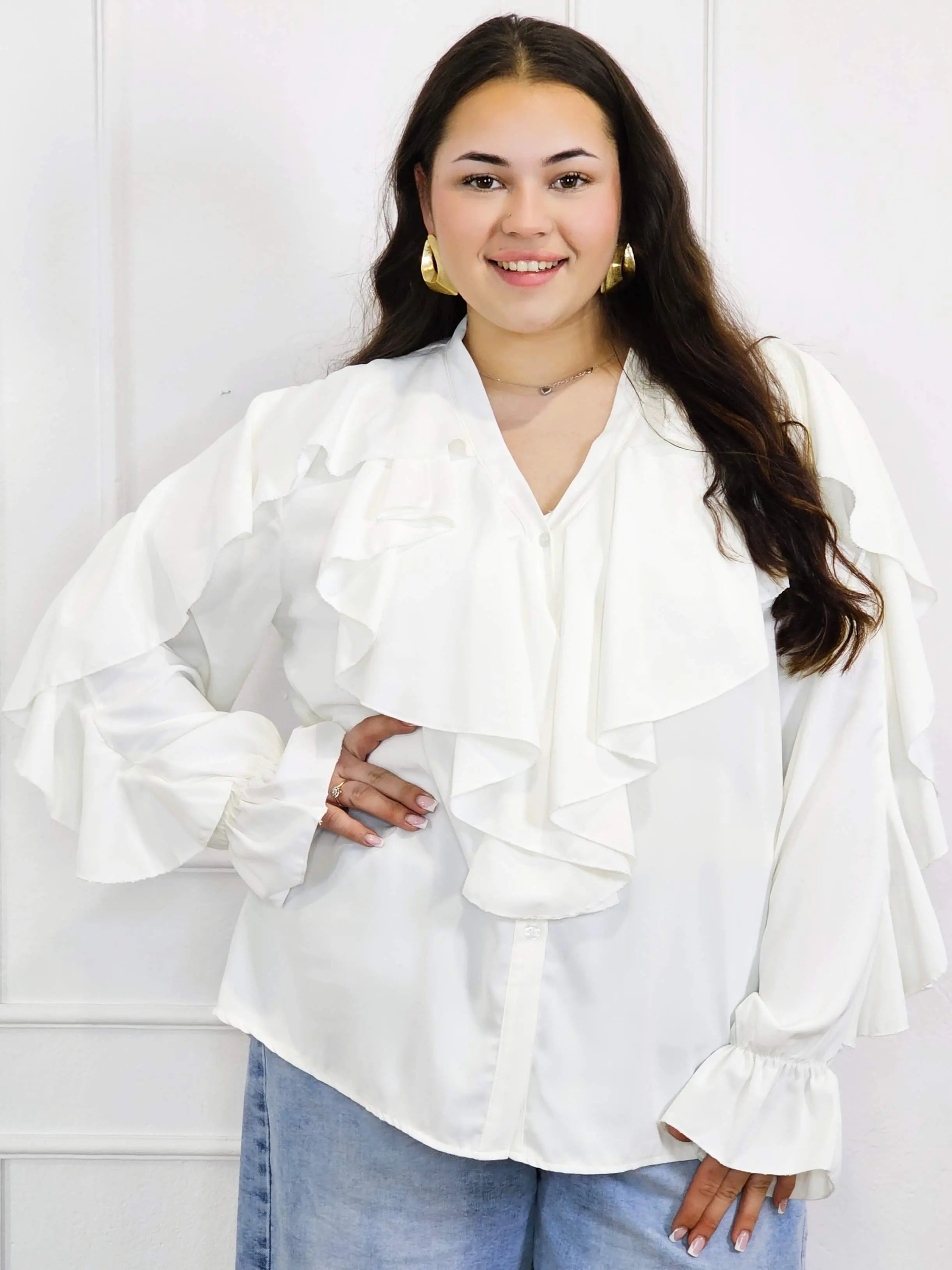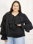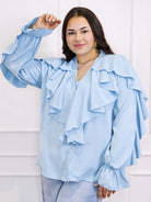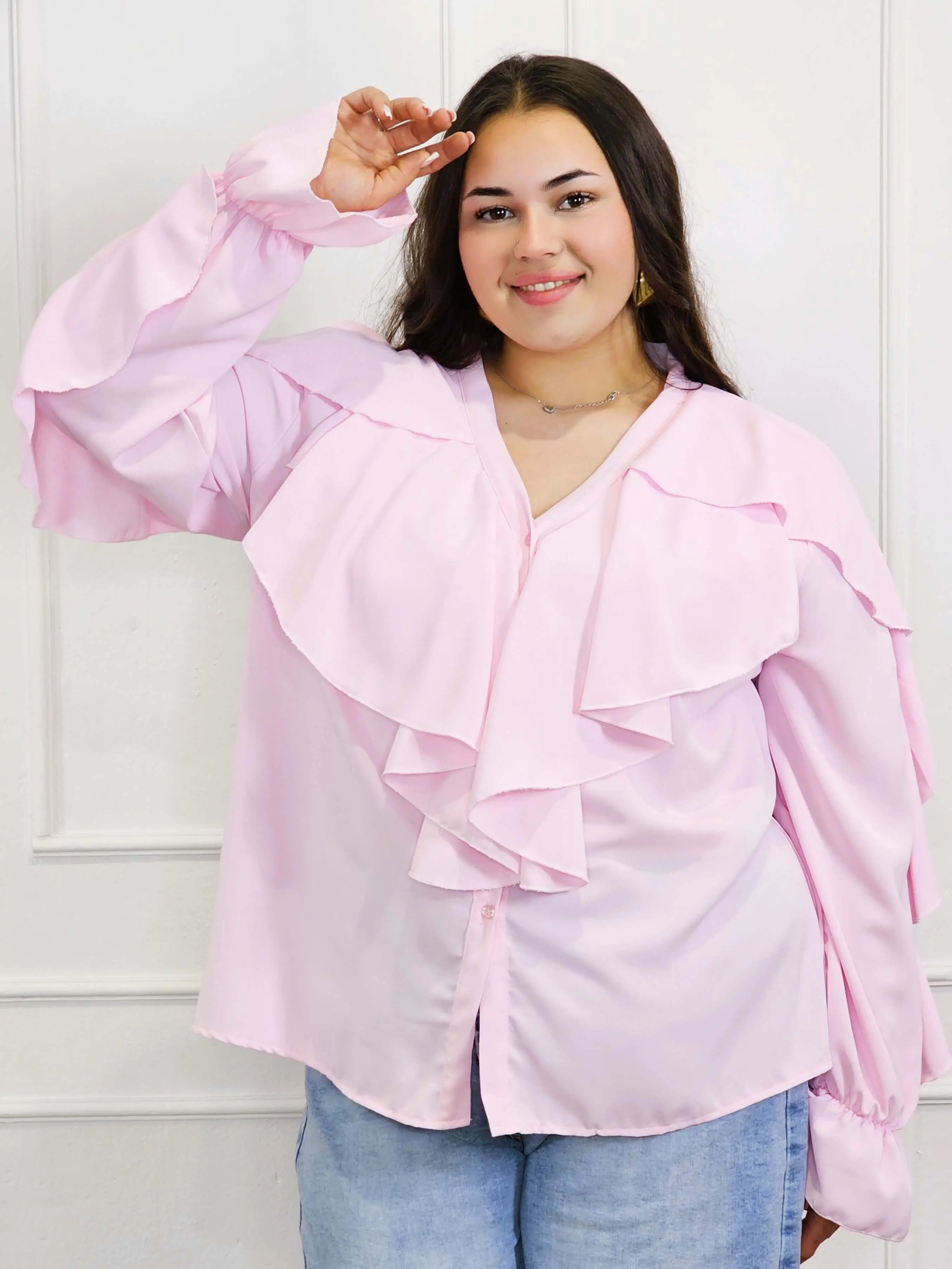 Dzięki efektownym falbanom przy dekolcie i ramionach, bluzka przyciąga wzrok i dodaje objętości tam, gdzie potrzeba – idealnie równoważąc proporcje sylwetki plus size. To doskonały wybór zarówno do pracy, jak i na spotkania rodzinne czy wieczorne wyjścia.