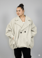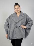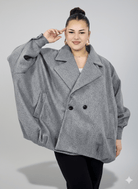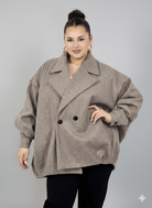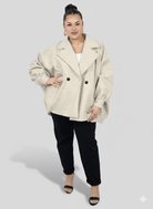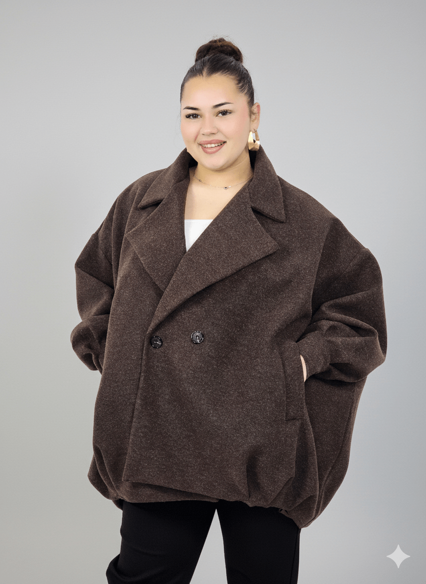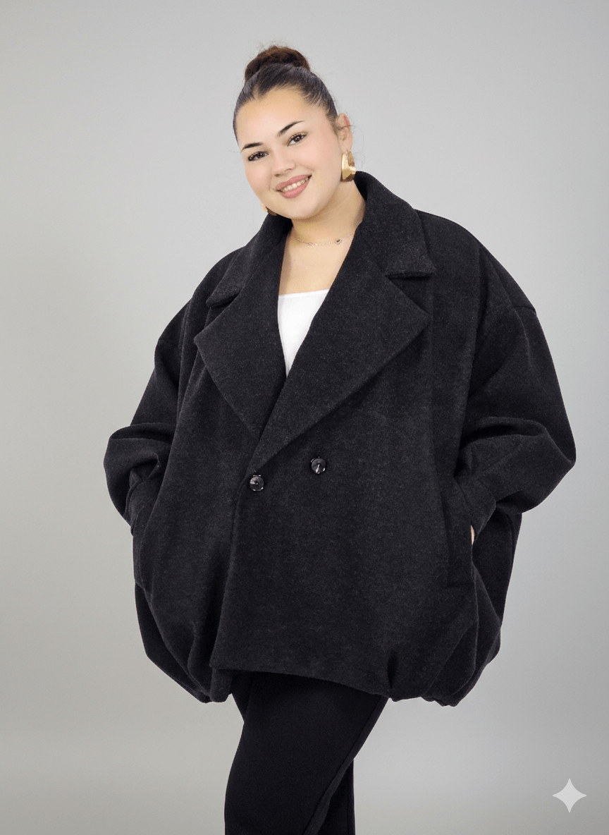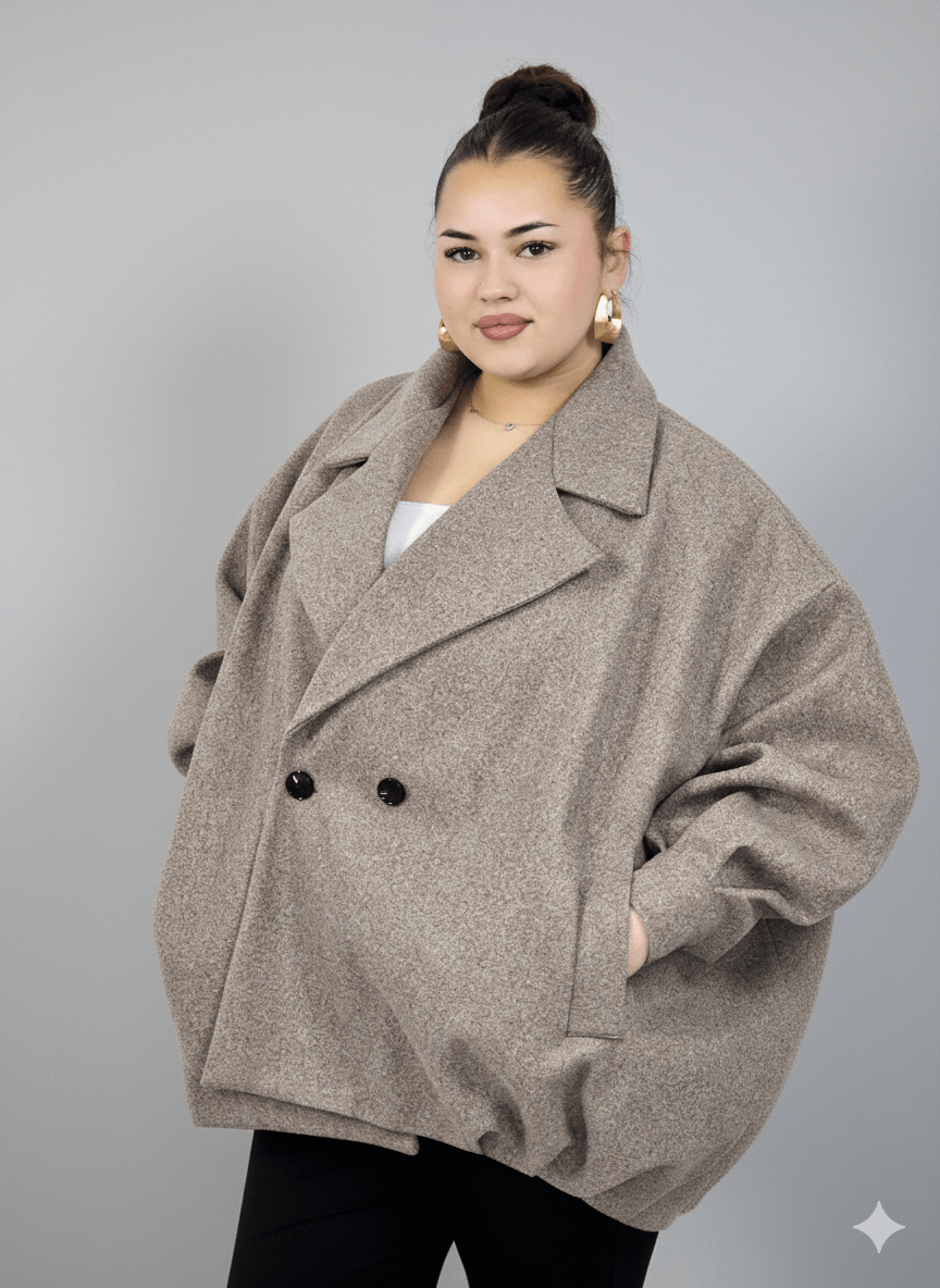 Płaszcz plus size oversize dwurzędowy z szerokim kołnierzem – modny krótki fason XXL