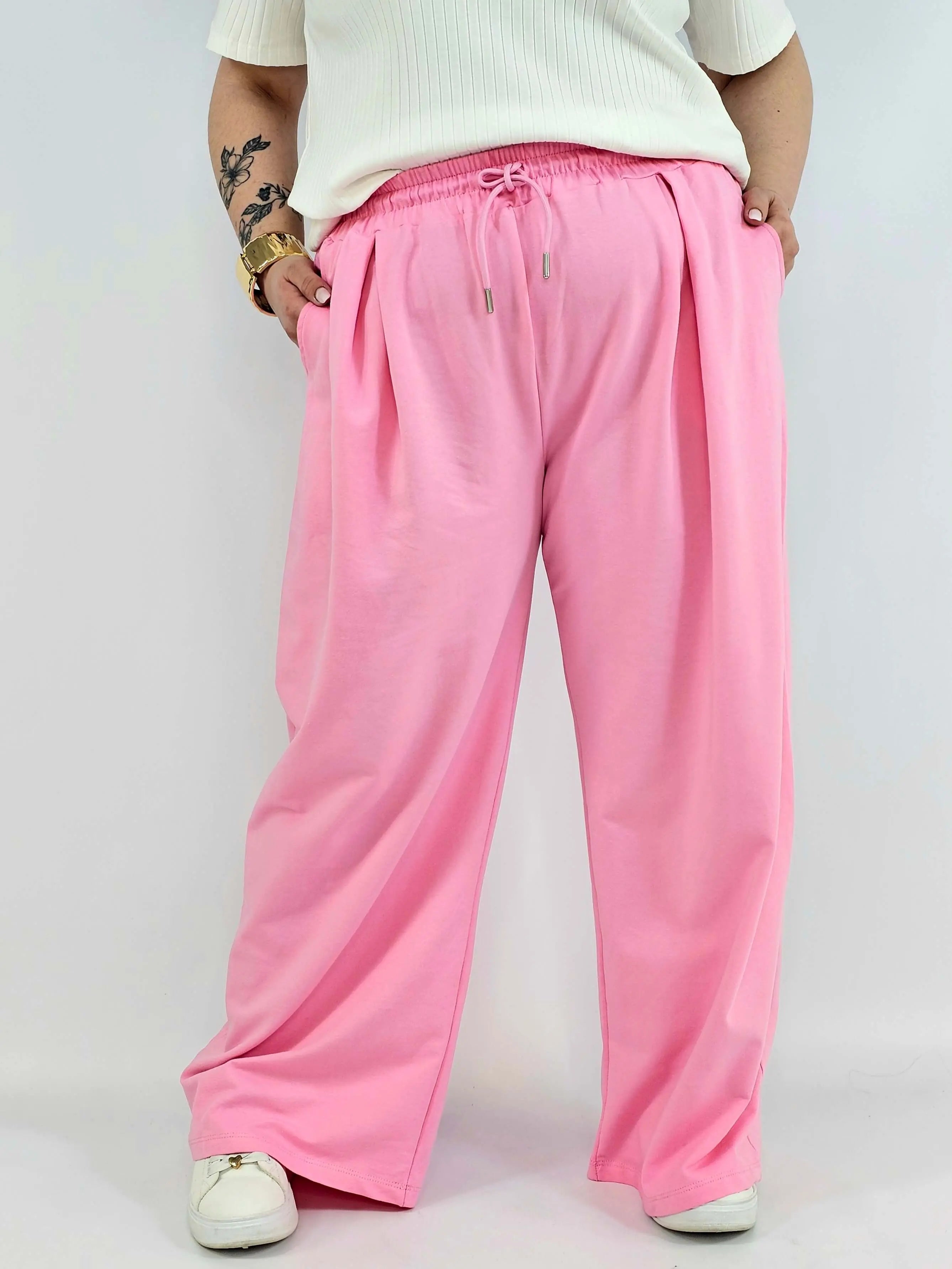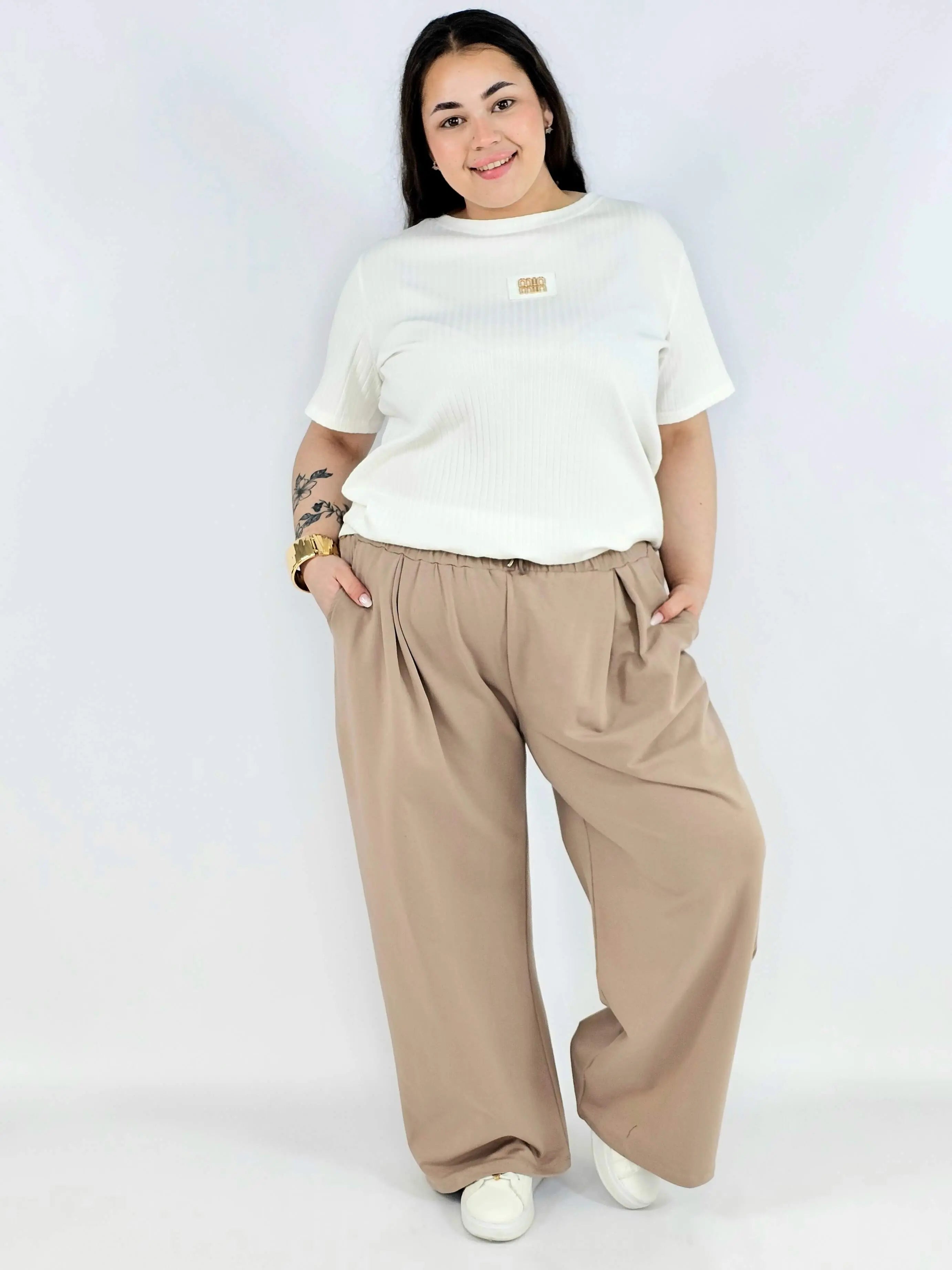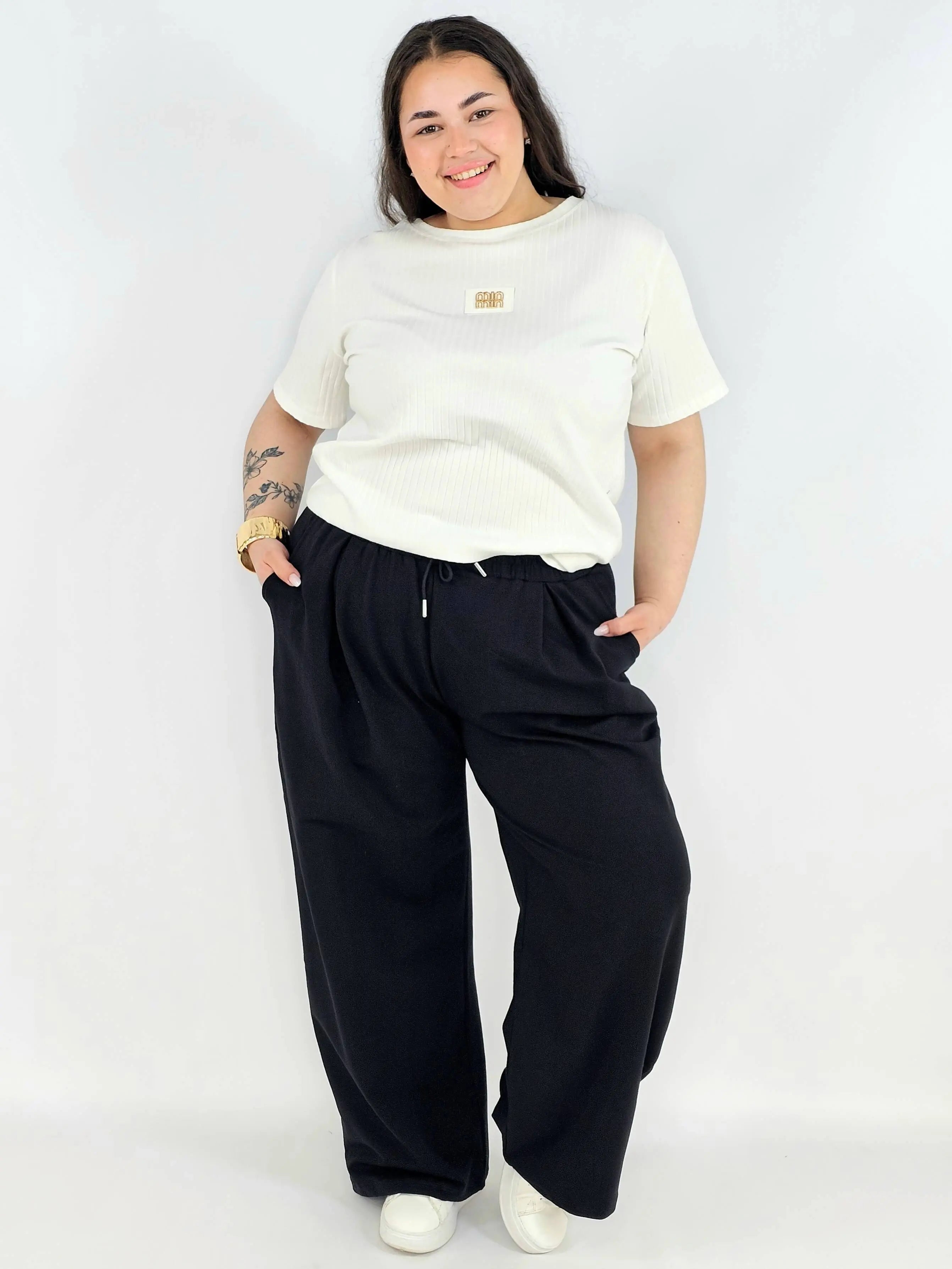 Model posiada elastyczną gumkę w pasie oraz troczek do regulacji, co sprawia, że spodnie doskonale dopasowują się do figury. To must-have w kategorii odzież plus size – idealne zarówno na co dzień, jak i do bardziej casualowych stylizacji.