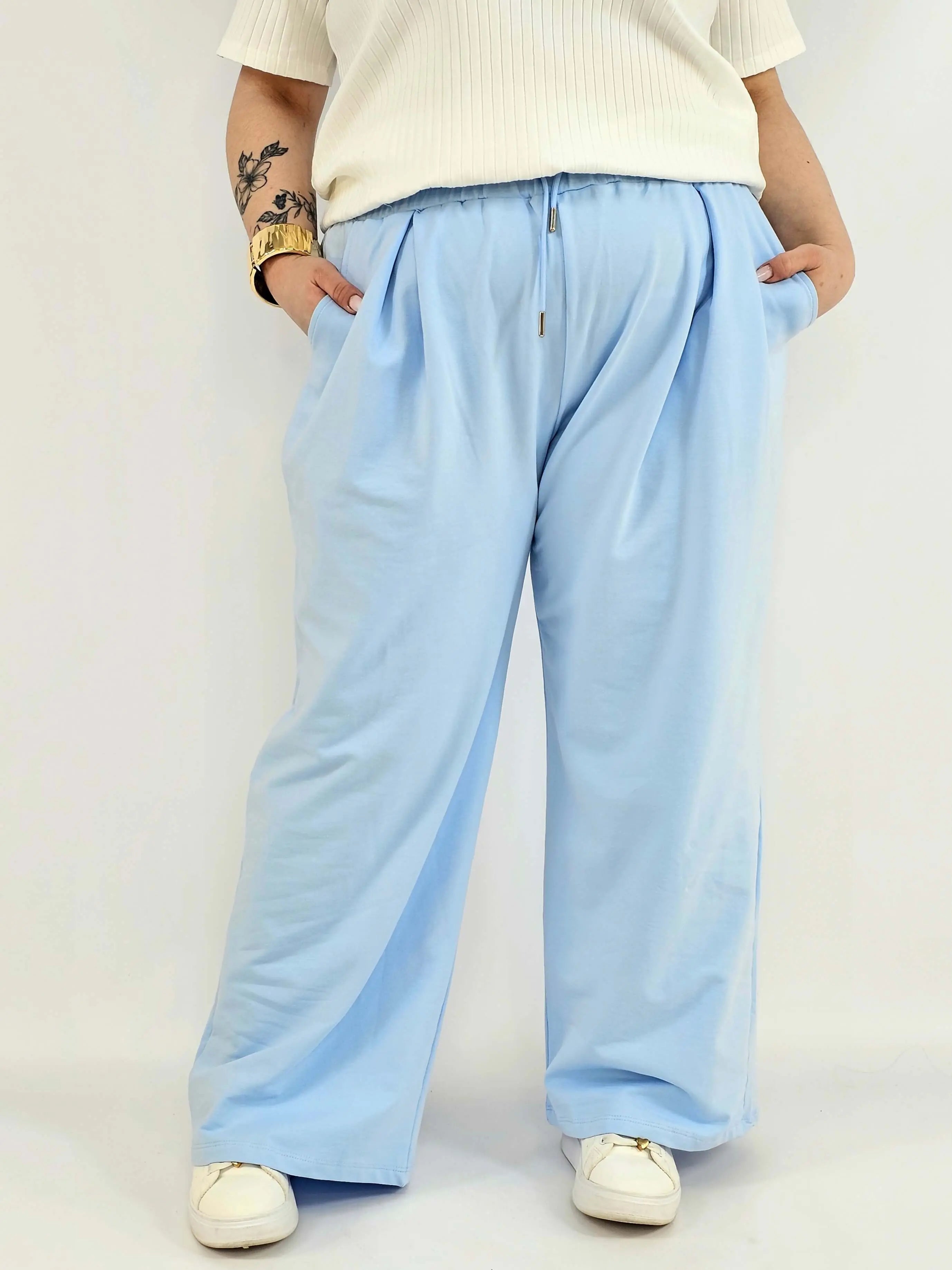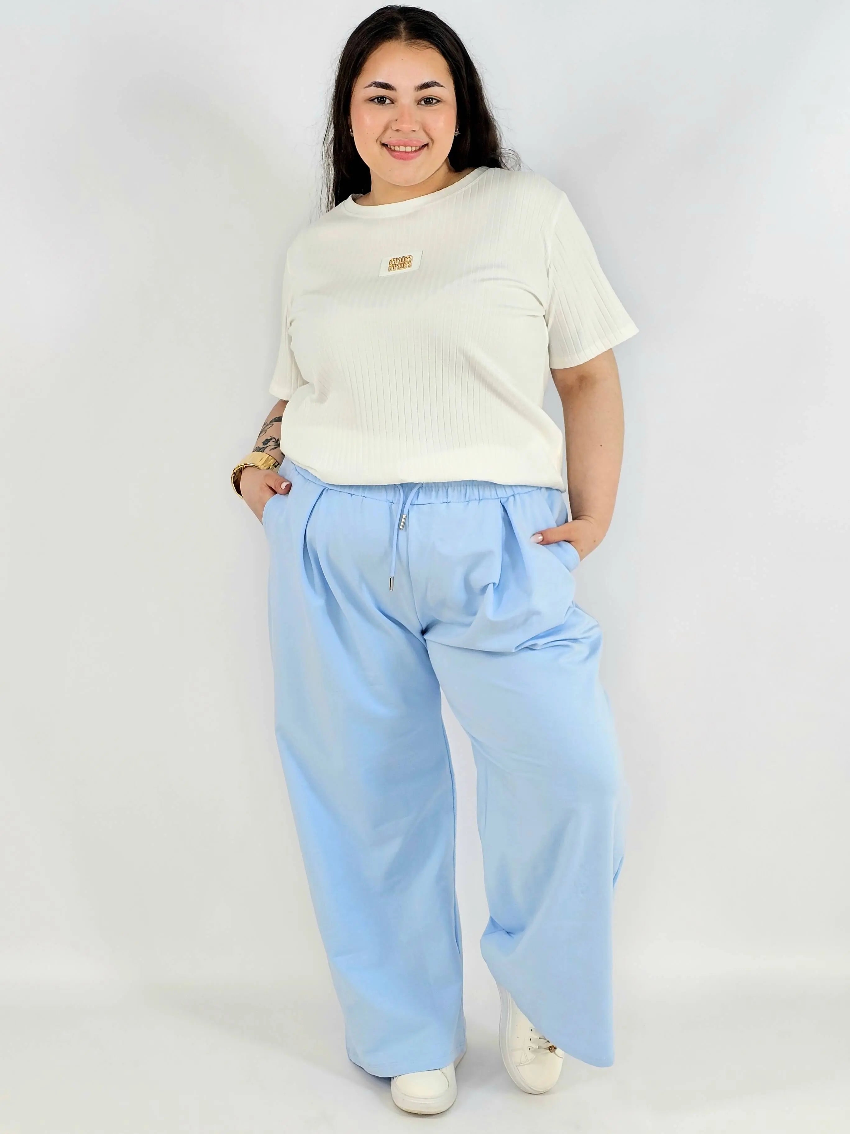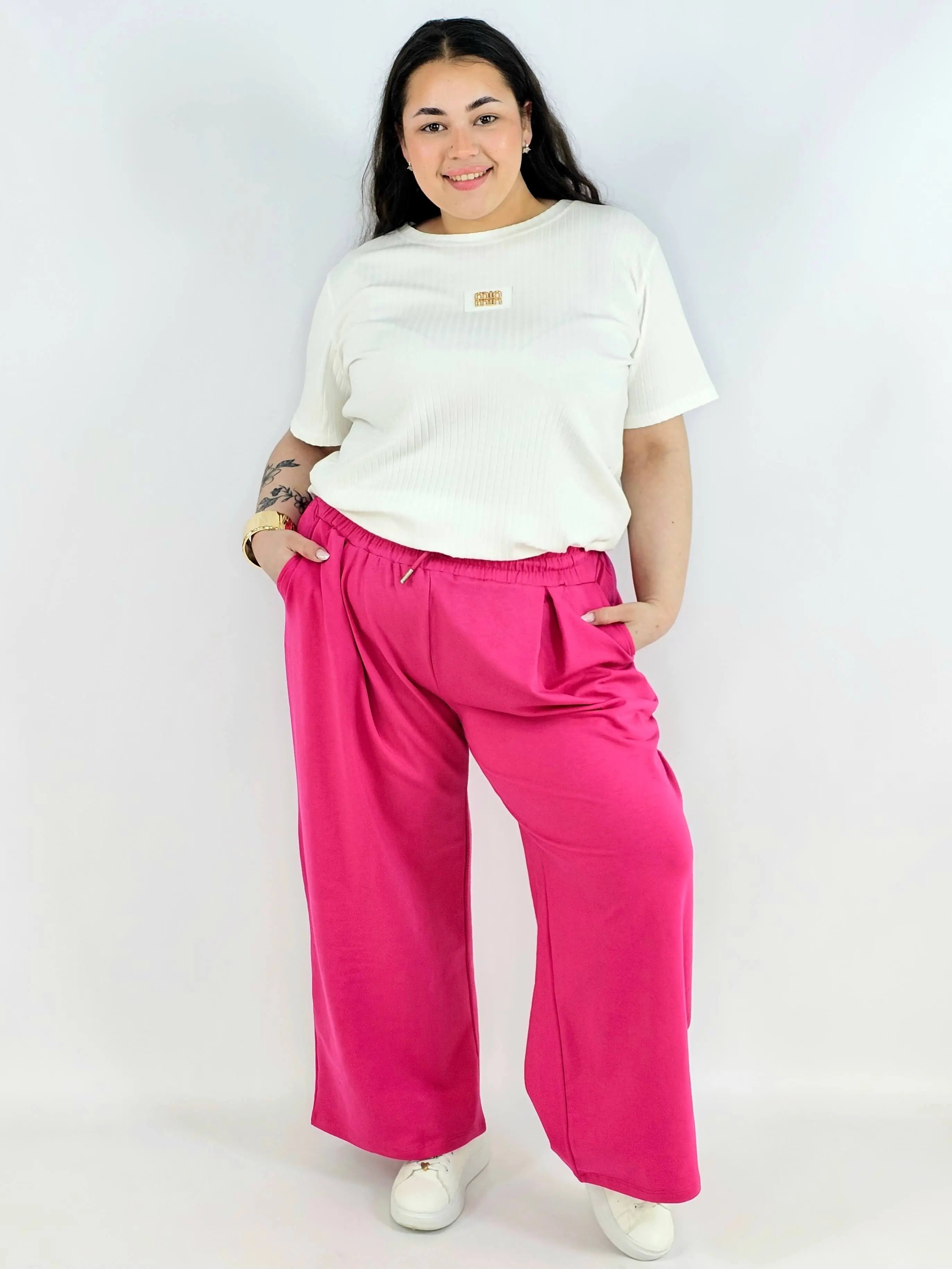 Model posiada elastyczną gumkę w pasie oraz troczek do regulacji, co sprawia, że spodnie doskonale dopasowują się do figury. To must-have w kategorii odzież plus size – idealne zarówno na co dzień, jak i do bardziej casualowych stylizacji.