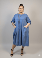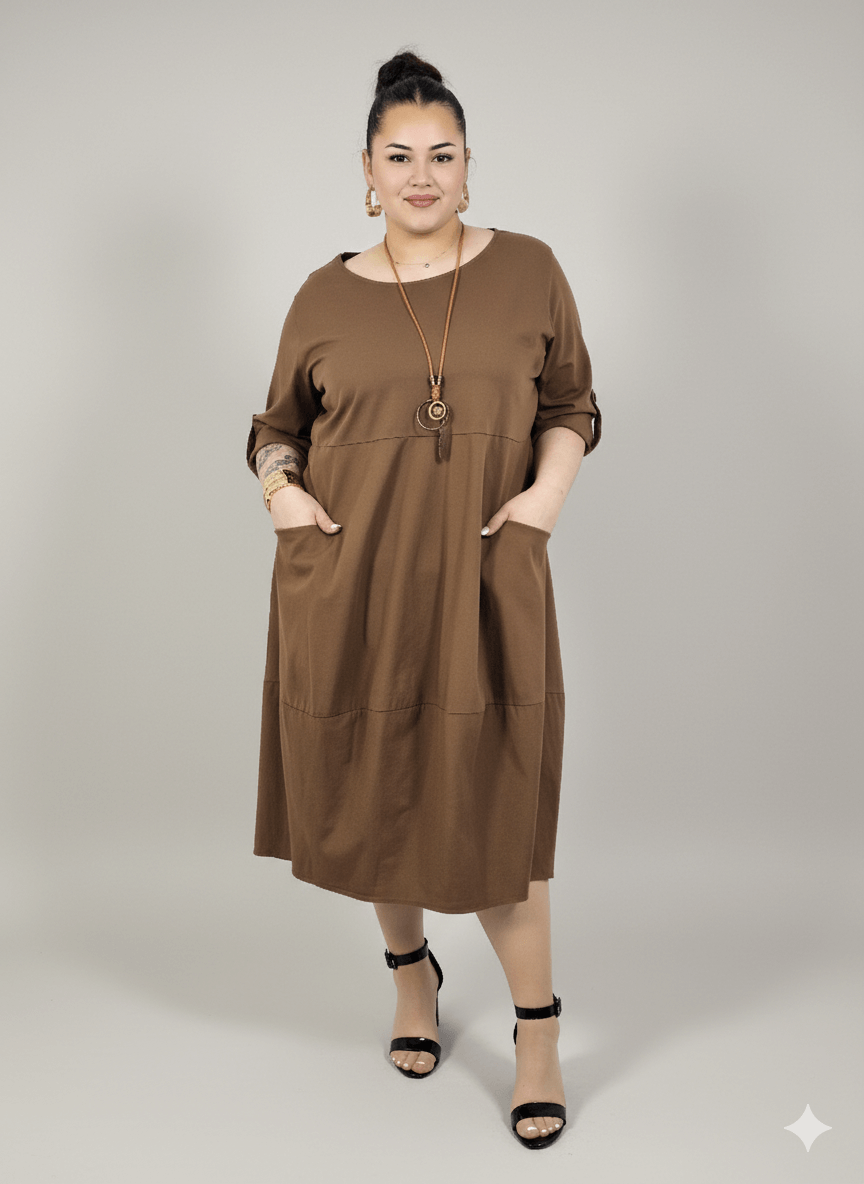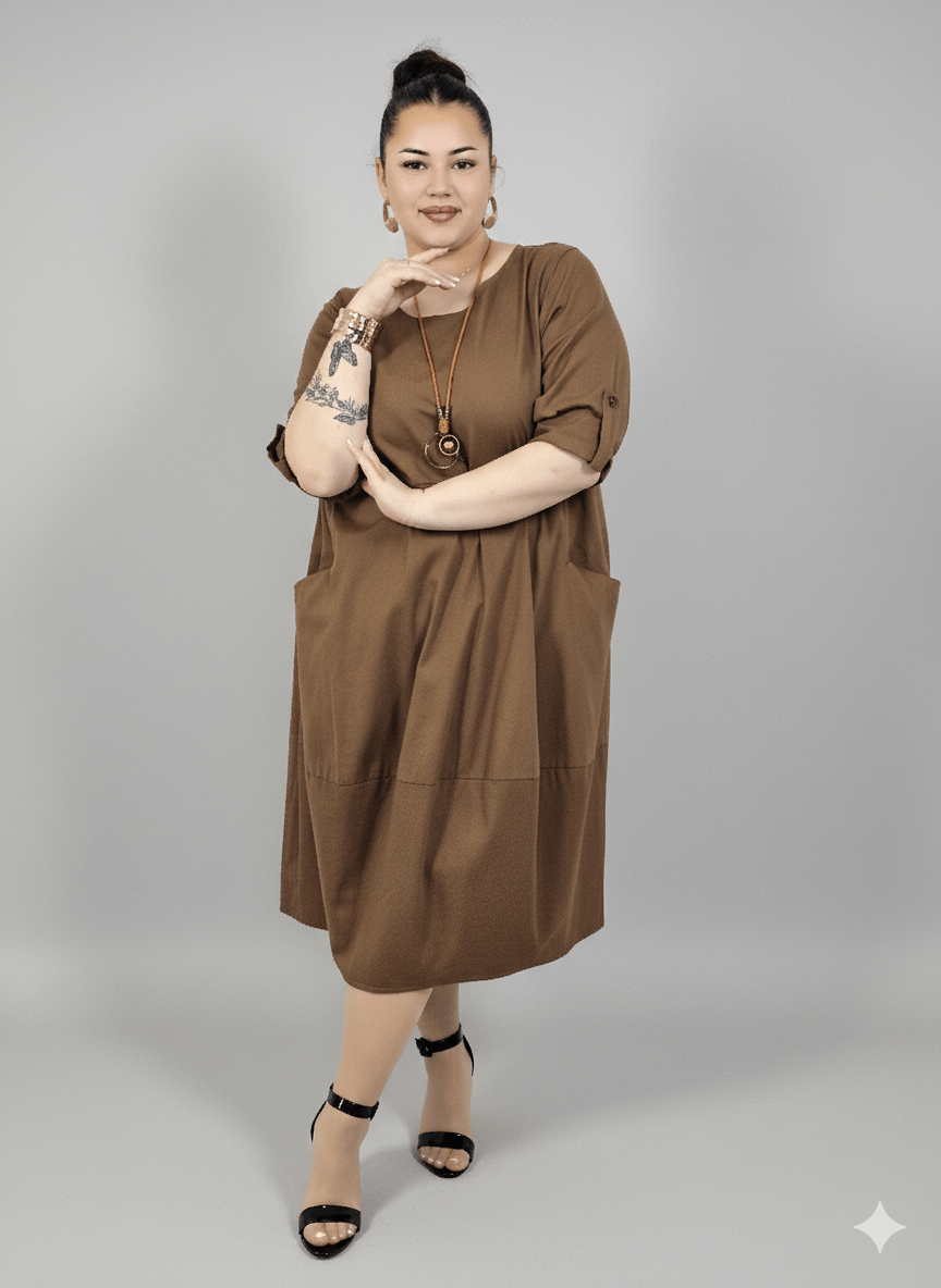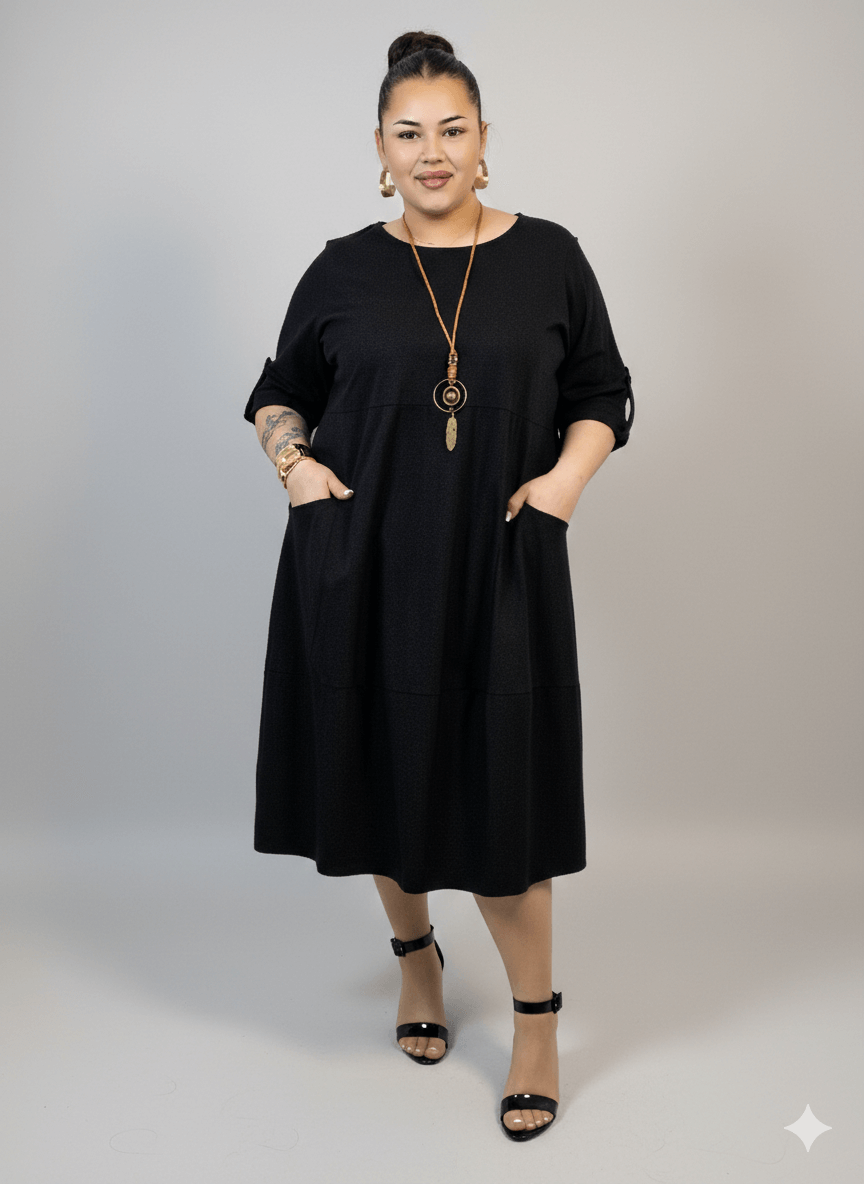 Sukienka plus size ma praktyczne kieszenie, które dodają jej charakteru i sprawiają, że jest jeszcze bardziej funkcjonalna. Rękawy o długości 3/4 z możliwością podpięcia nadają lekkości i pozwalają dopasować styl do okazji. Sukienka plus size jest uszyta z przyjemnej bawełny, która dobrze oddycha i sprawdza się przez cały sezon, zapewniając komfort noszenia w rytmie codziennych obowiązków.