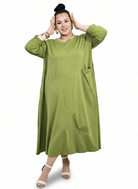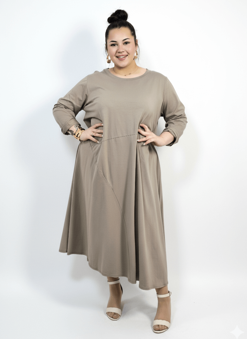 Sukienka plus size wyróżnia się ciekawą konstrukcją z asymetrycznymi przeszyciami, które dodają charakteru i tworzą efekt lekkiego modelowania. Dzięki temu sukienka nie jest „zwykłą bazą”, tylko gotową stylizacją, którą wystarczy uzupełnić butami i torebką. Rękaw 3/4 sprawia, że model jest uniwersalny i sprawdzi się w wielu sezonach, co jest ważne w odzieży plus size dla kobiet.
