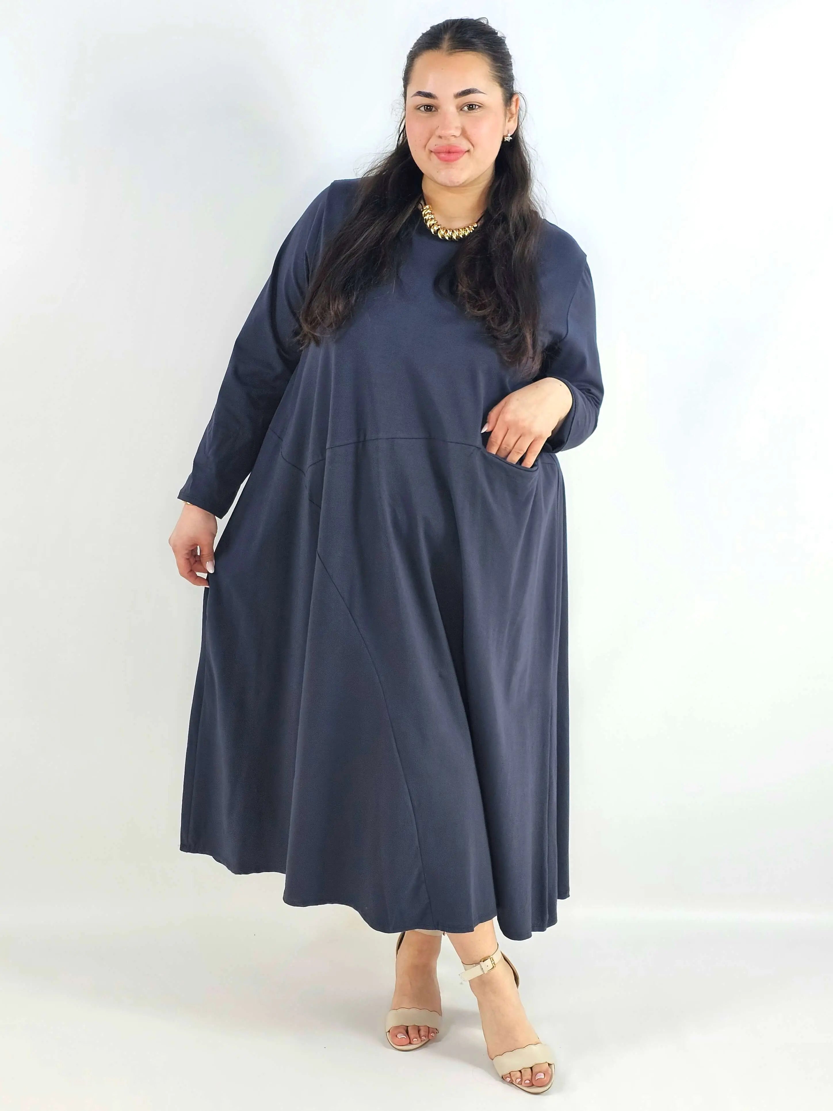 Sukienka plus size pasuje zarówno do codziennych stylizacji XXL (np. z płaskim obuwiem), jak i do bardziej eleganckich zestawów (np. z obcasem). To wybór dla kobiet, które cenią komfort, ale chcą też wyglądać nowocześnie i kobieco. Jeśli szukasz sukienki, która układa się miękko, nie opina i daje efekt „lekkości”, ten fason będzie idealny.