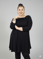 Tunika plus size w klasycznej czerni to ponadczasowa propozycja dla kobiet, które cenią komfort i styl w modzie plus size. Luźny, swobodny krój pięknie układa się na sylwetce, nie opina ciała i zapewnia pełną swobodę ruchów. Subtelny, delikatny połysk przy dekolcie oraz na dole tuniki dodaje elegancji i sprawia, że model świetnie sprawdzi się nie tylko na co dzień, ale również na wyjścia czy spotkania rodzinne. To idealna tunika plus size, która łączy prostotę z kobiecym charakterem.