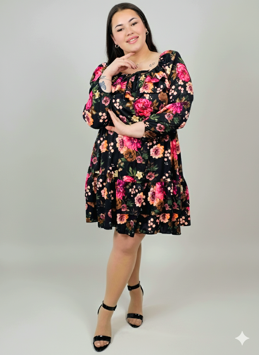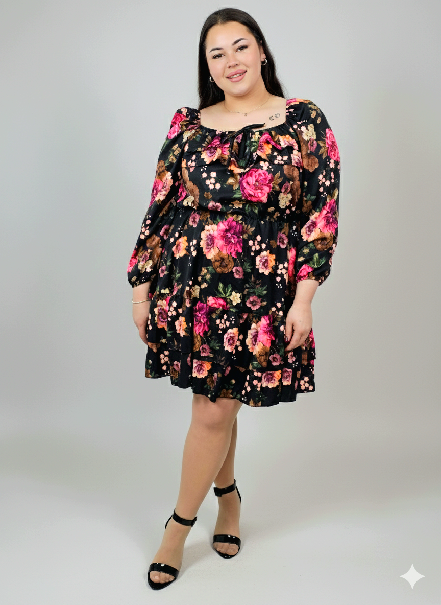 Sukienka plus size w kwiaty z dekoltem hiszpańskim – kobiecy fason XXL