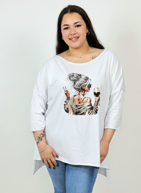 Bluzka plus size laserowo cięta z nadrukiem kobiety z kieliszkiem – nowoczesny styl XXL