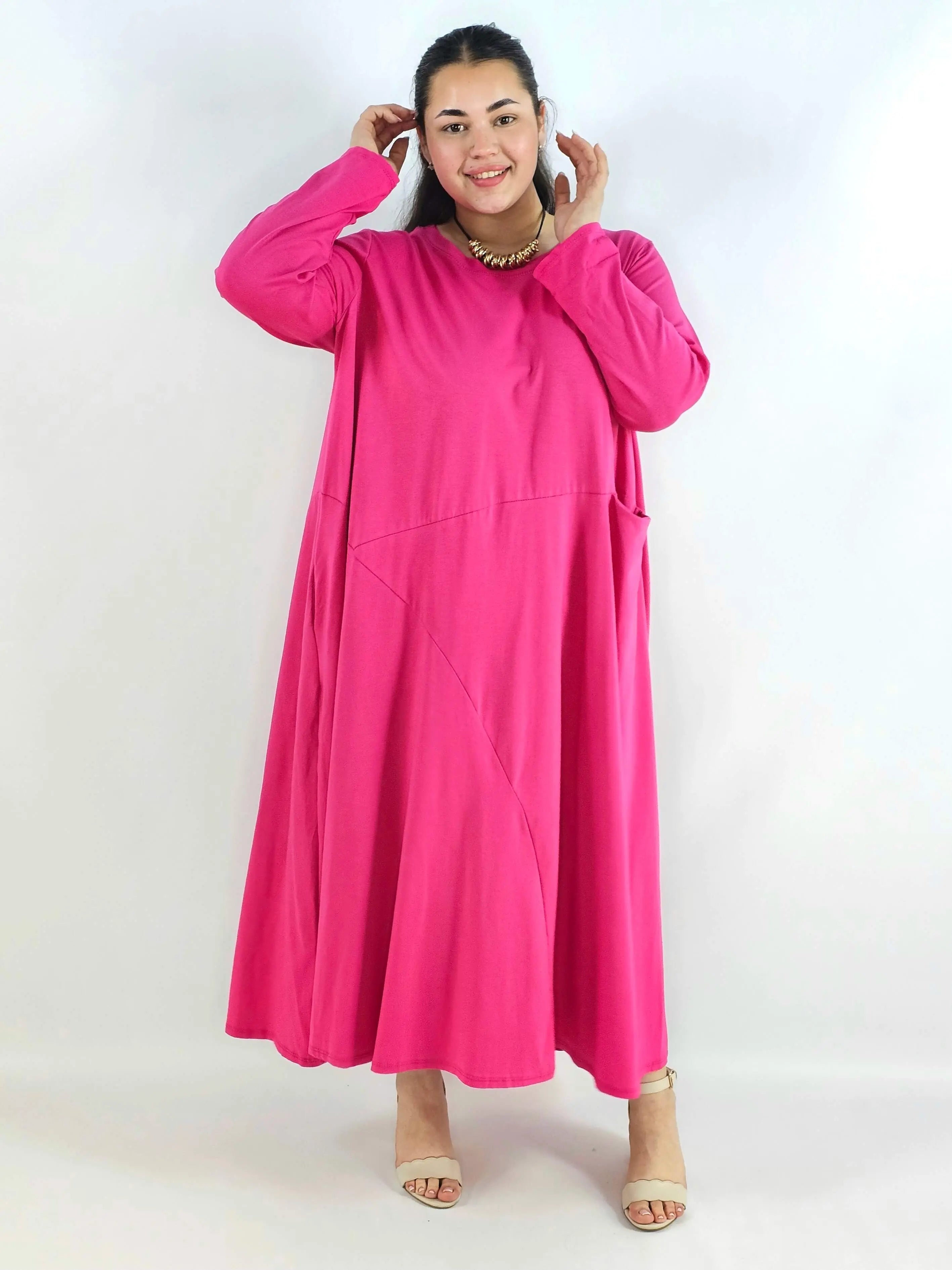 Sukienka plus size maxi z rękawem 3/4 i asymetrycznymi przeszyciami