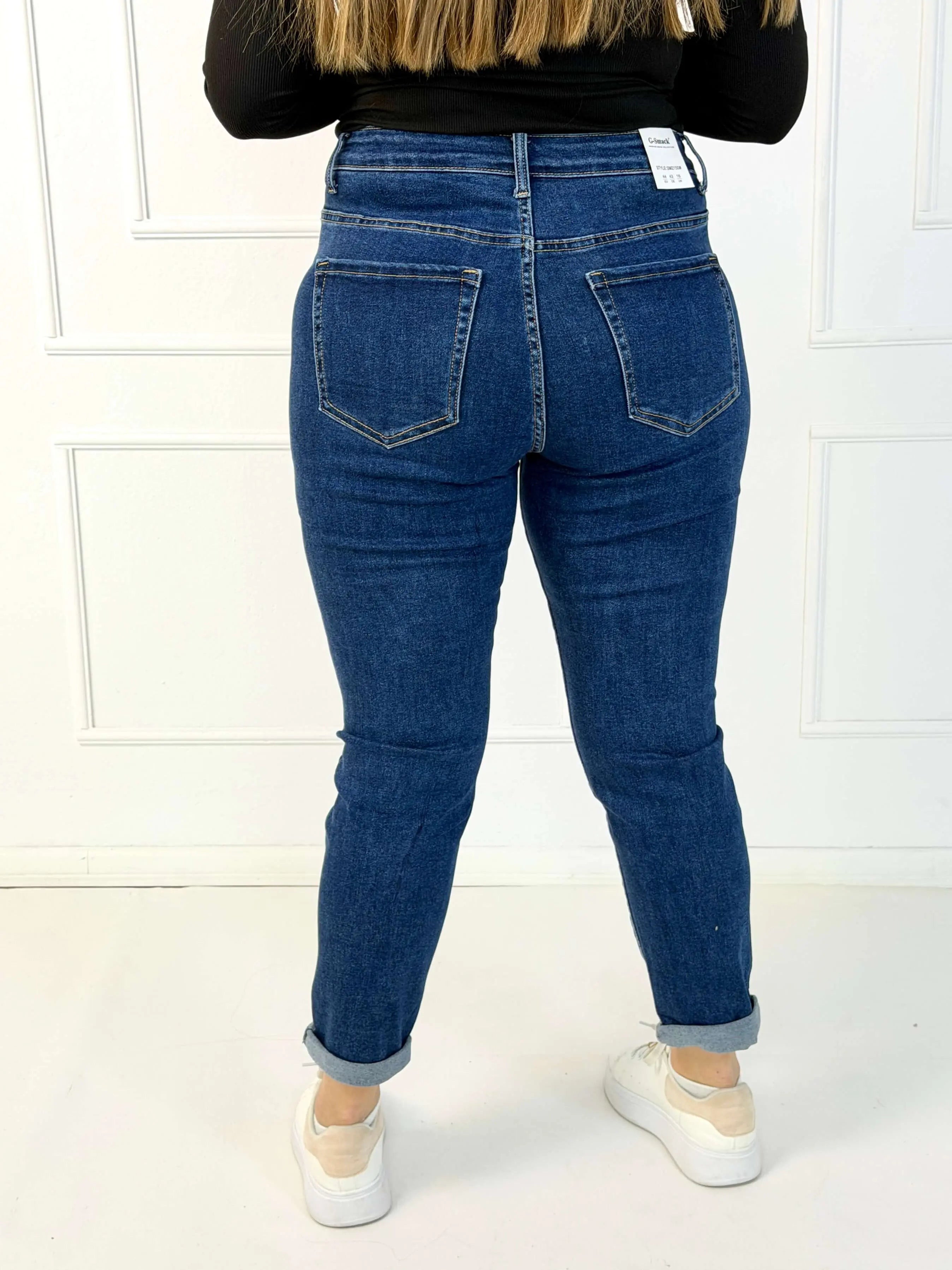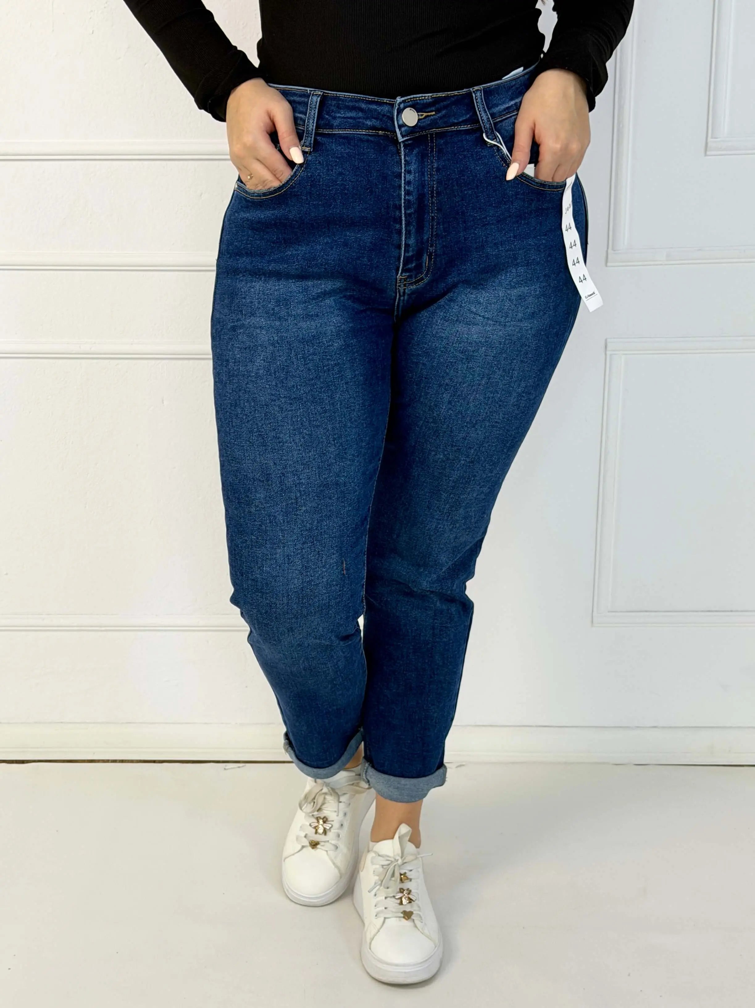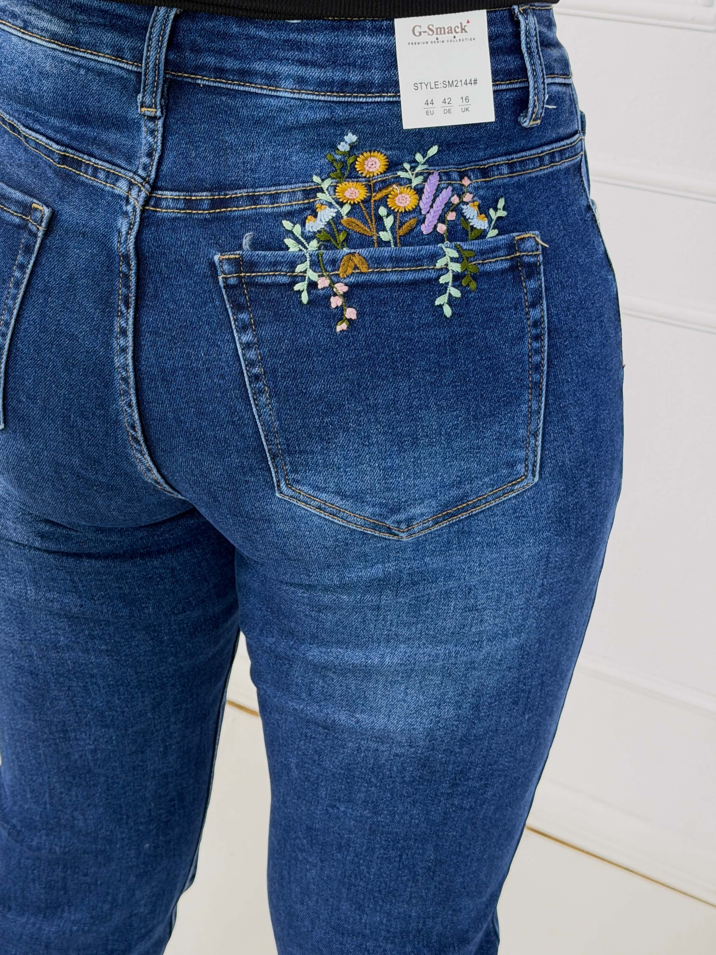 Jeansy plus size G-Smack mom fit XXL – granatowy denim z haftowanym kwiatem