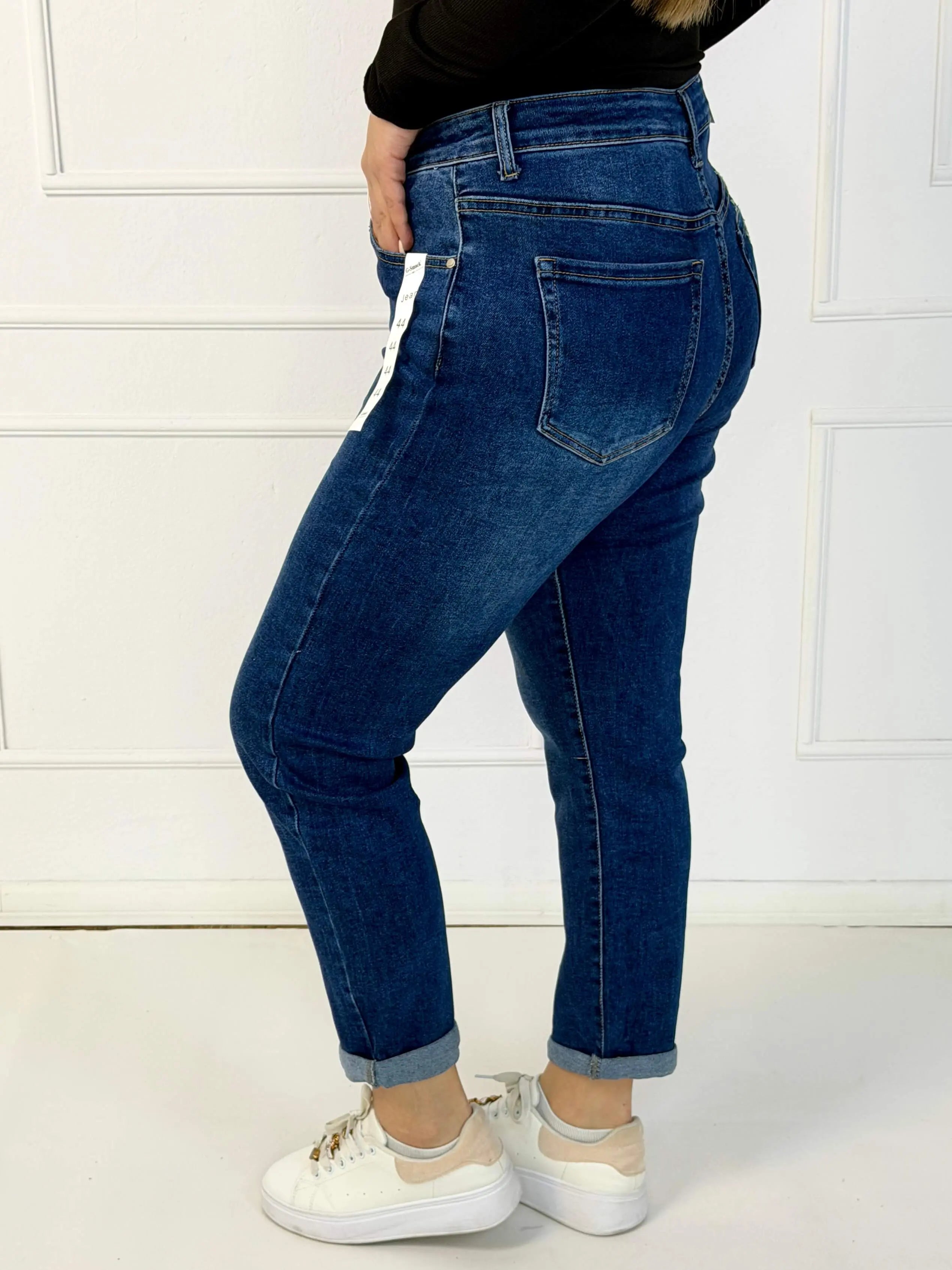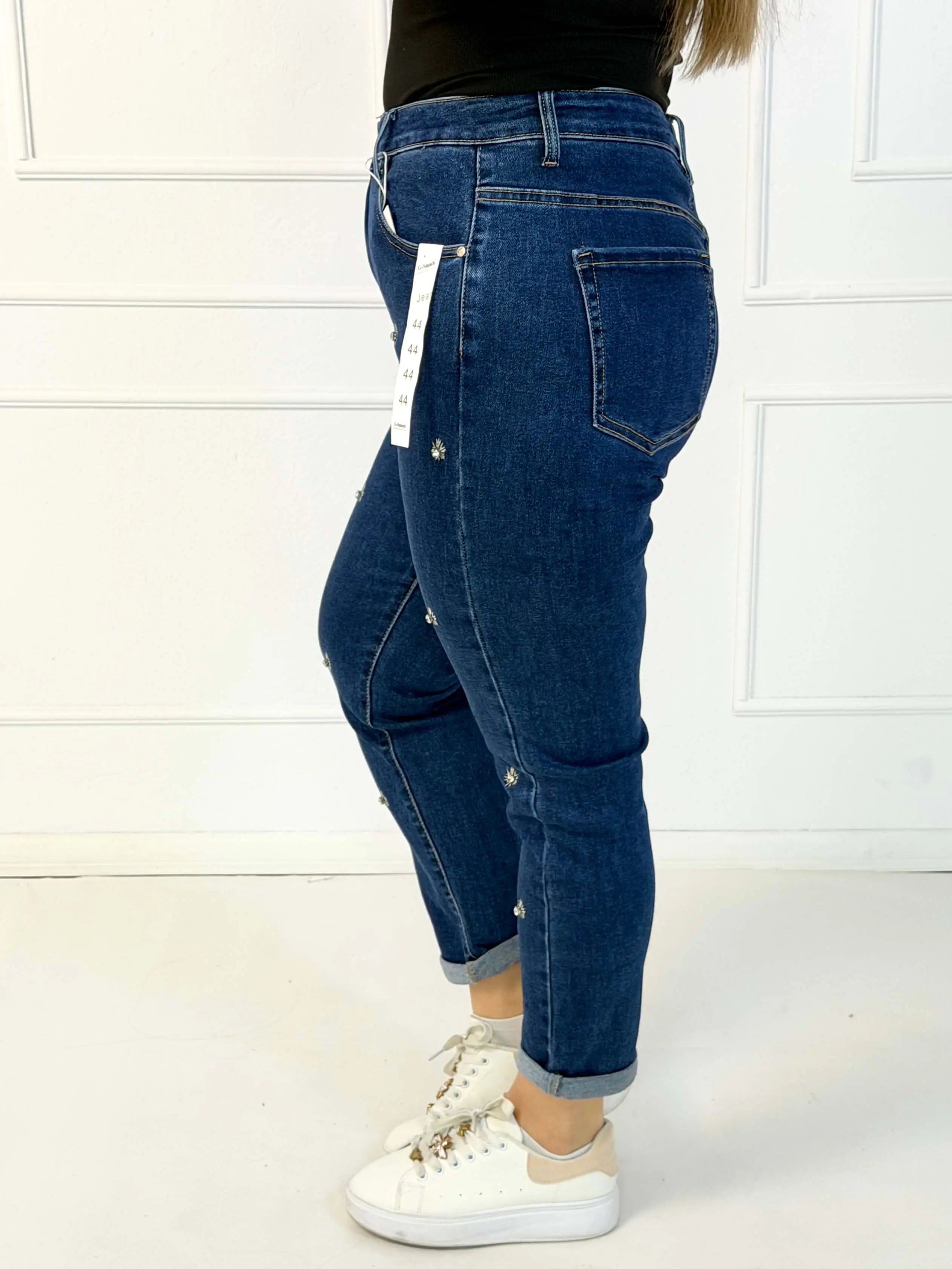 Jeansy plus size granatowe z ozdobnymi aplikacjami – spodnie damskie XXL