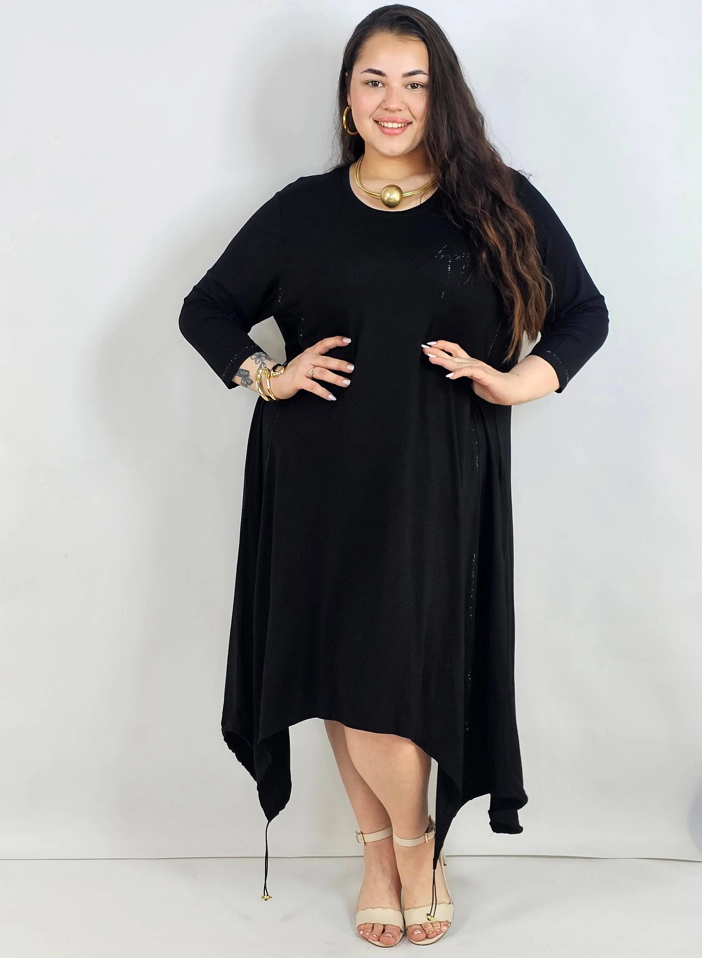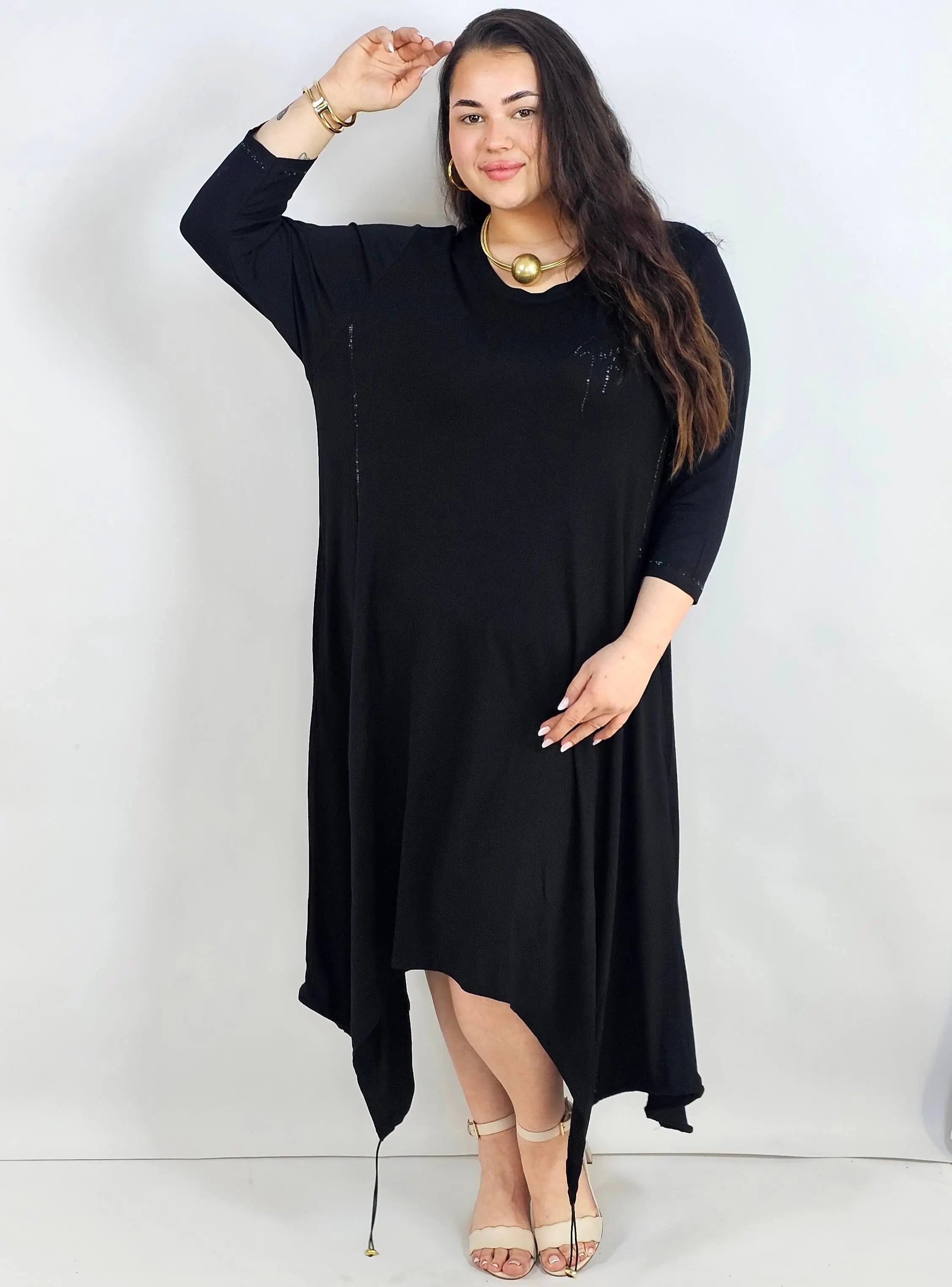 Sukienka plus size – asymetryczna tunika z aplikacją i lekko transparentnym dołem