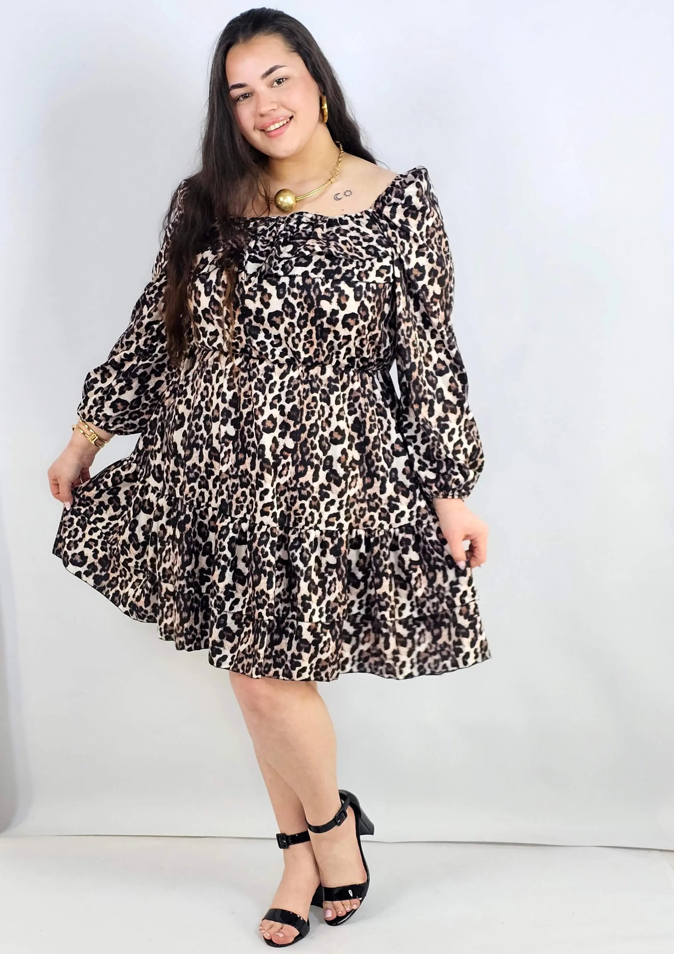 Sukienka plus size w panterkę z dekoltem hiszpańskim – modny fason XXL
