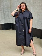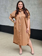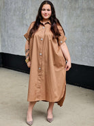 Szyk i wygoda w jednym? Mamy to! Ta oversize’owa sukienka z klasycznym kołnierzykiem i fantazyjnymi guzikami w kształcie kwiatów to model, który sprawdzi się zarówno na co dzień, jak i na bardziej eleganckie okazje. Wybierz karmel lub głęboką czerń i podkreśl swój styl z lekkością
