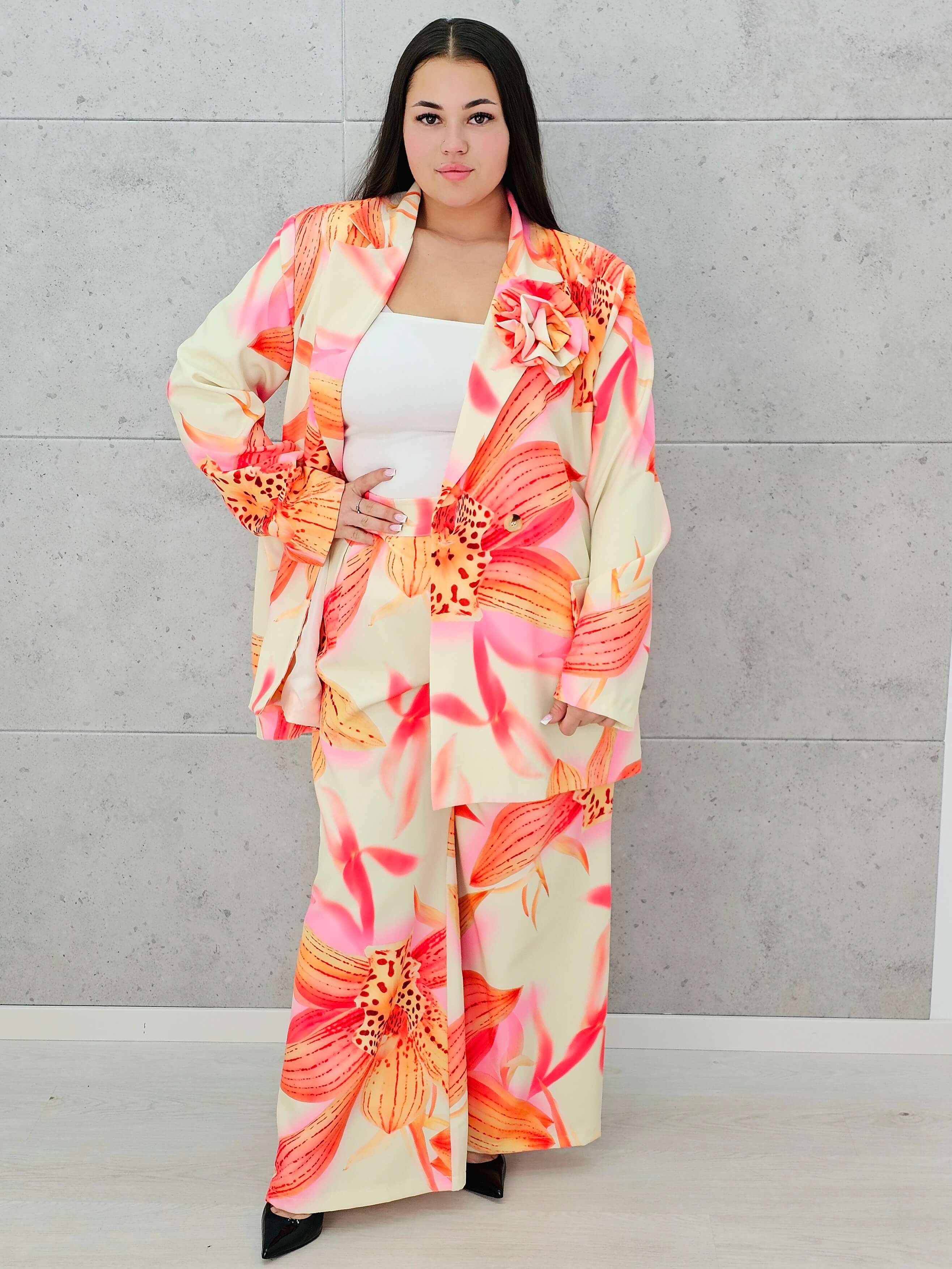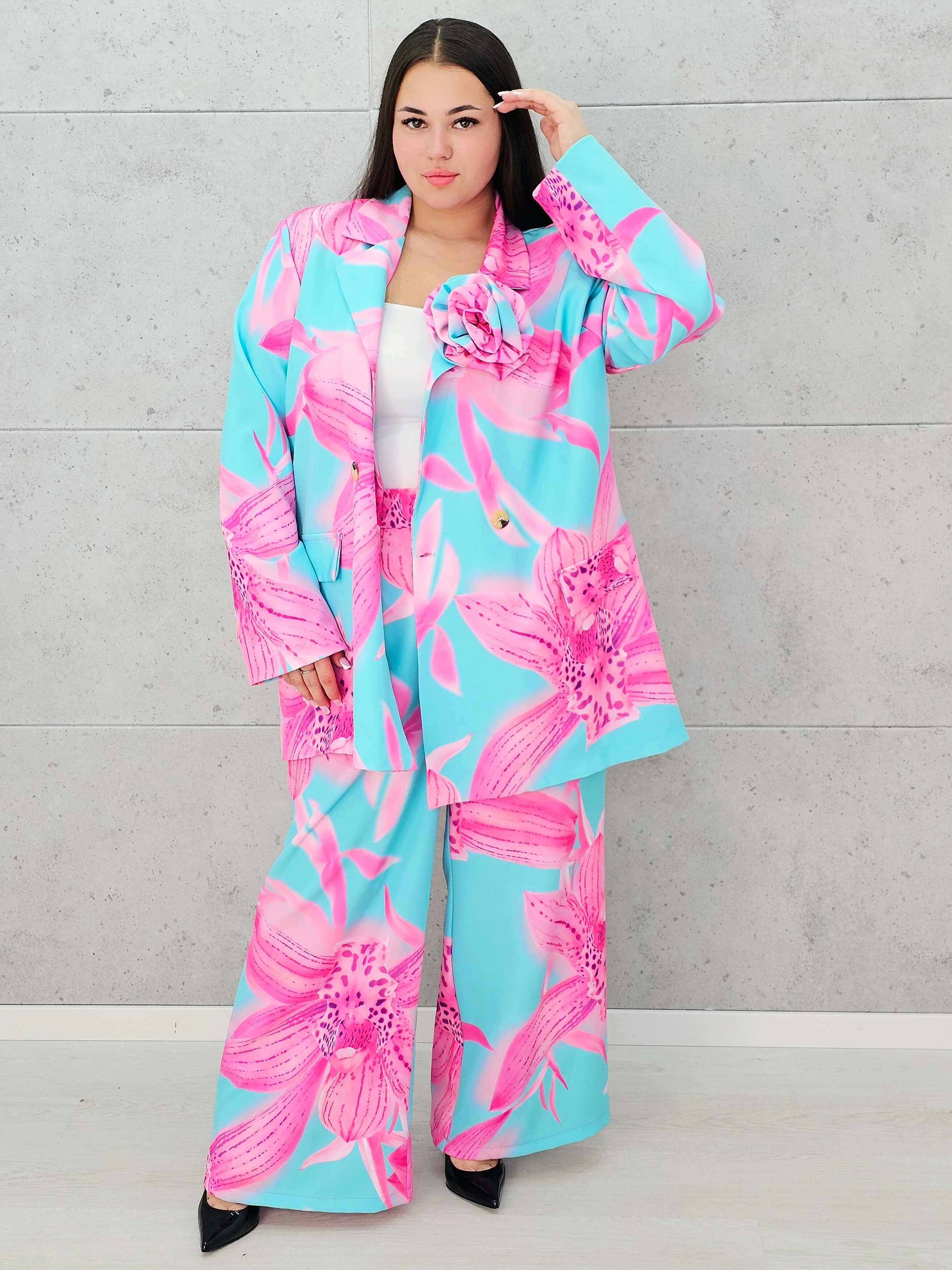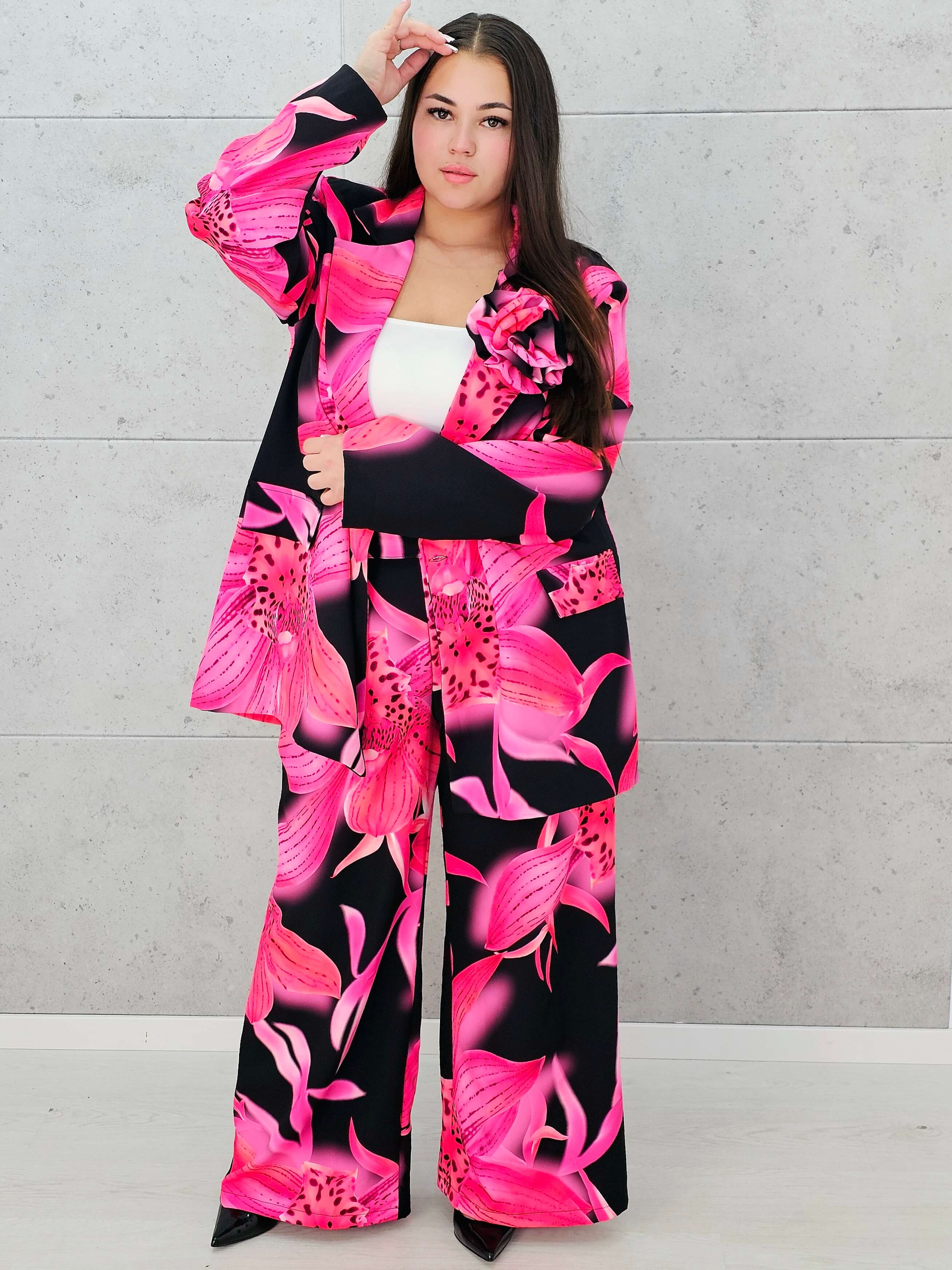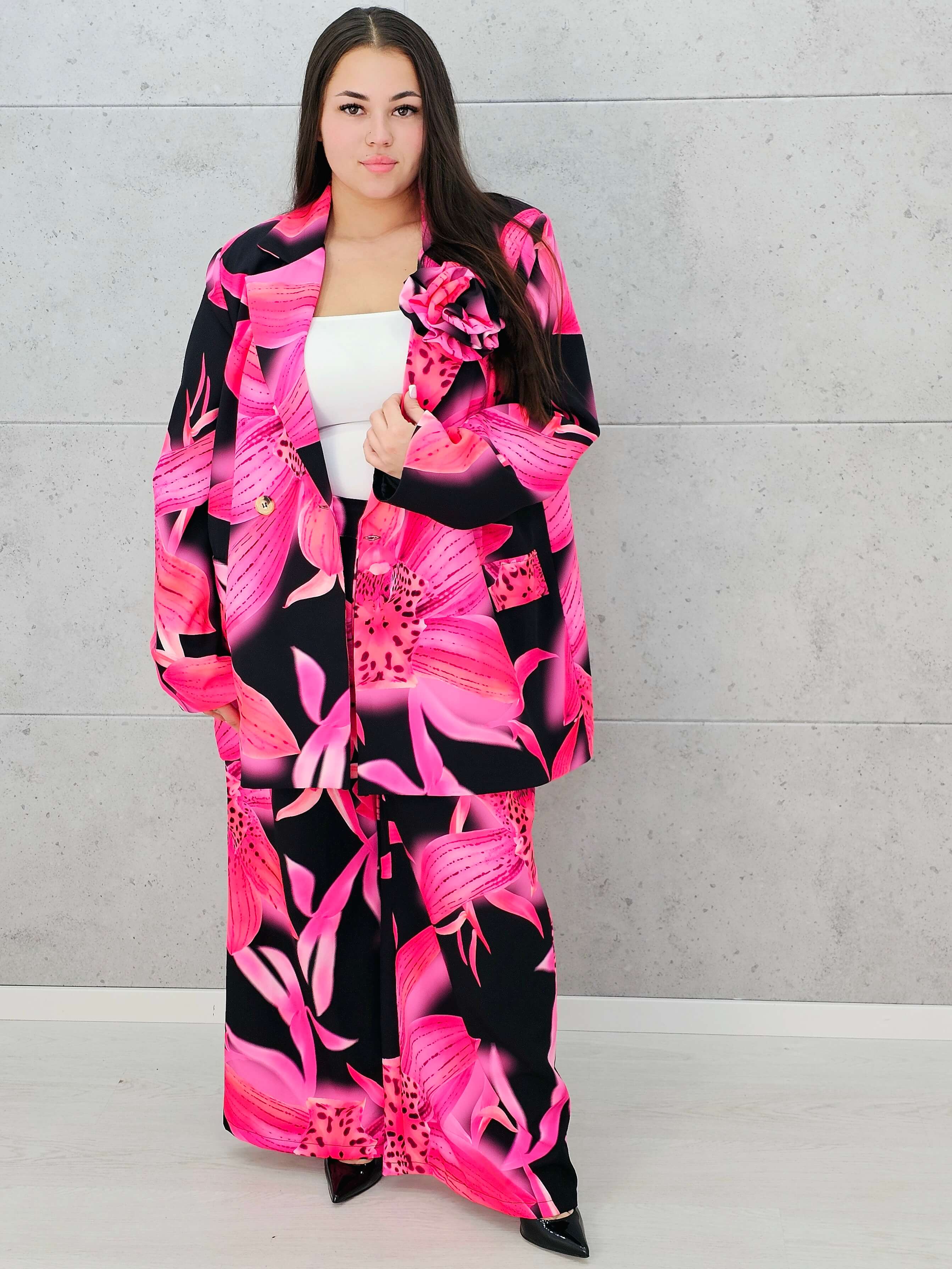 To komplet, który sprawi, że poczujesz się wyjątkowo już od pierwszego założenia. Intensywny wzór w duże kwiaty dodaje charakteru, a lekka, lejąca tkanina pięknie układa się na sylwetce. To idealna propozycja na letnie przyjęcia, spacery po deptaku lub stylowy city look