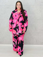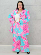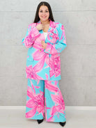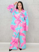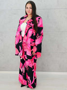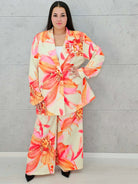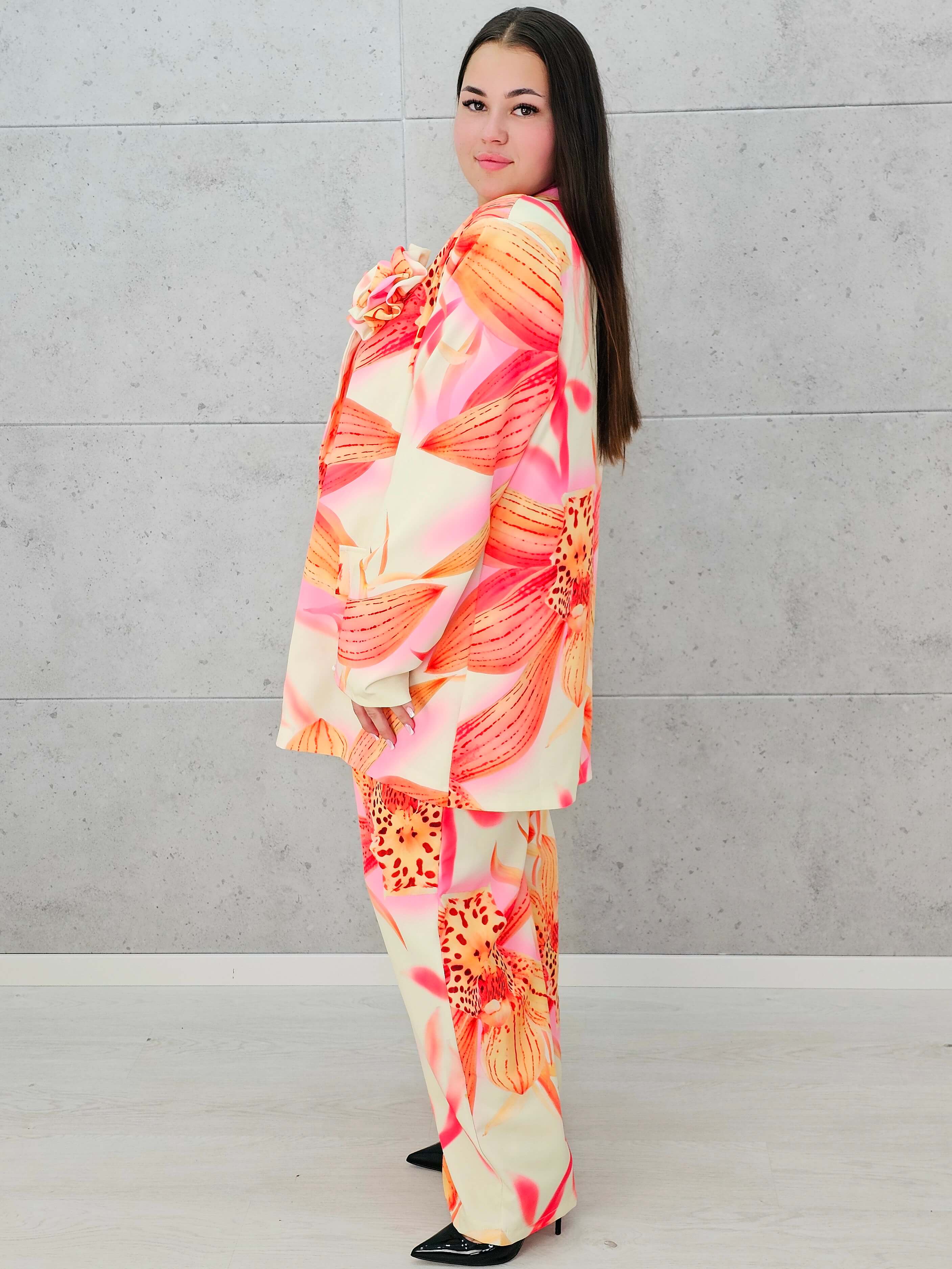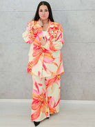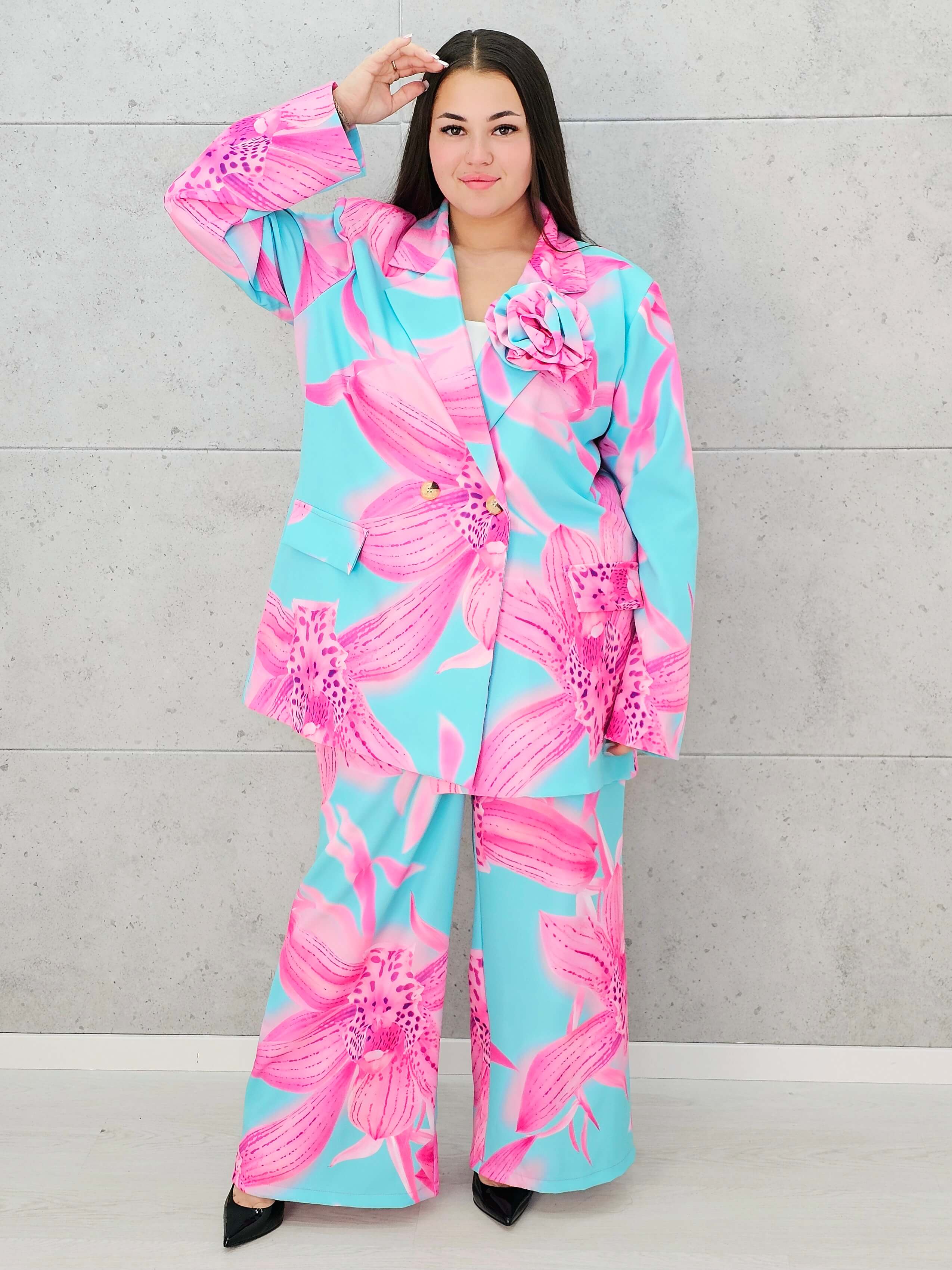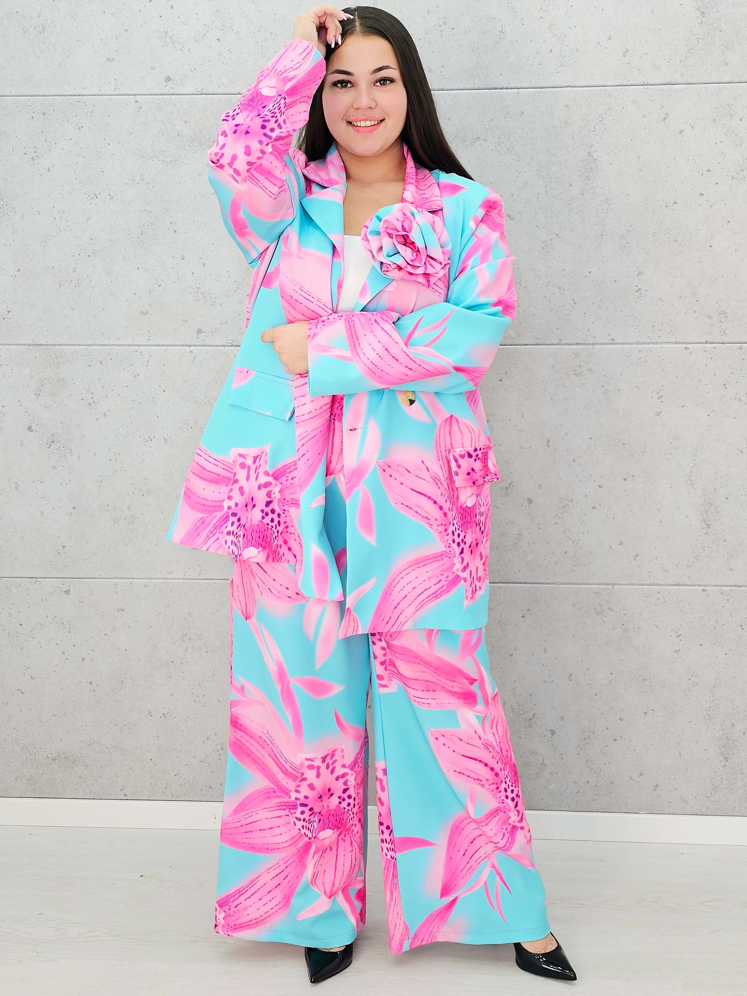 To komplet, który sprawi, że poczujesz się wyjątkowo już od pierwszego założenia. Intensywny wzór w duże kwiaty dodaje charakteru, a lekka, lejąca tkanina pięknie układa się na sylwetce. To idealna propozycja na letnie przyjęcia, spacery po deptaku lub stylowy city look