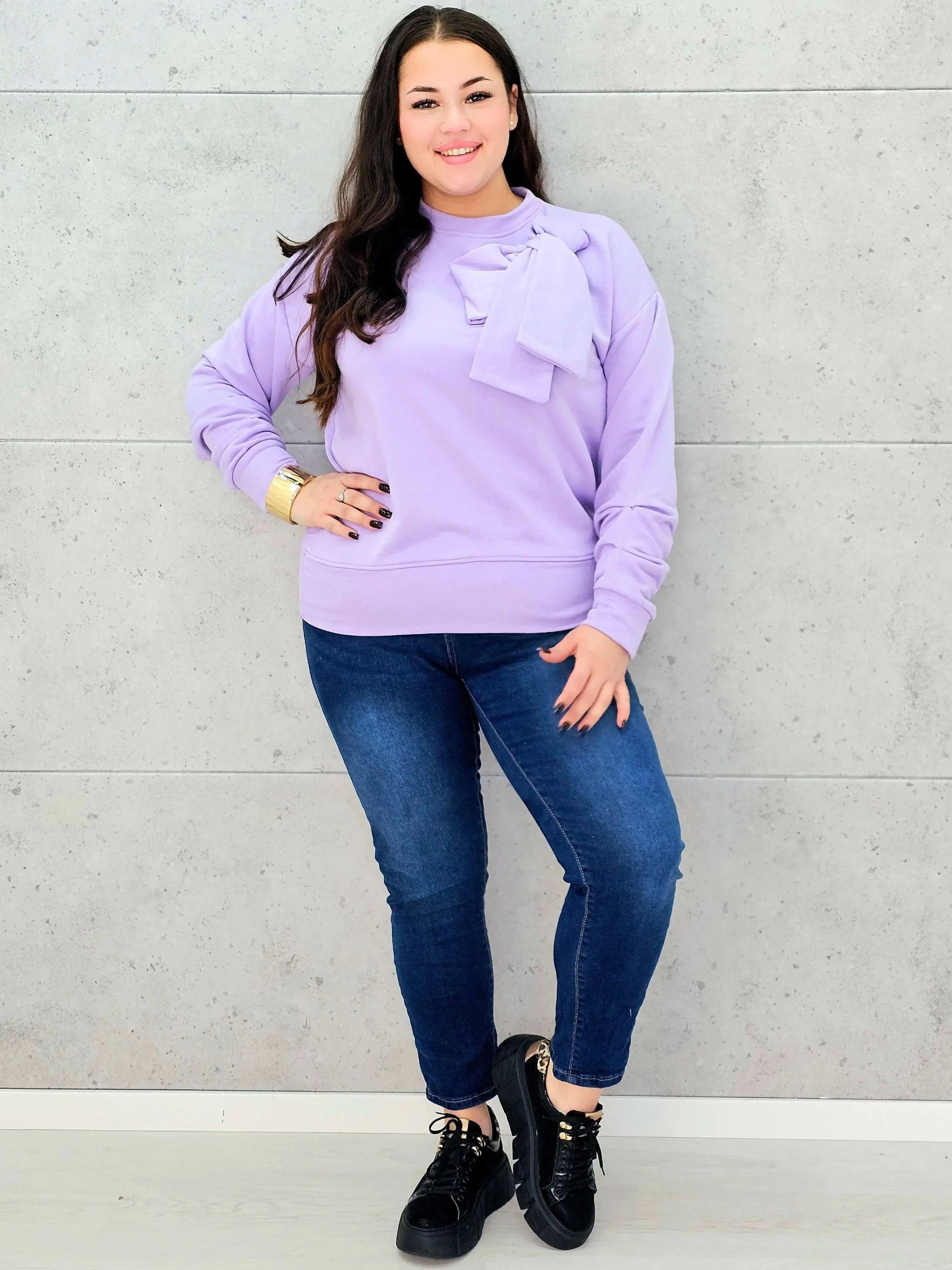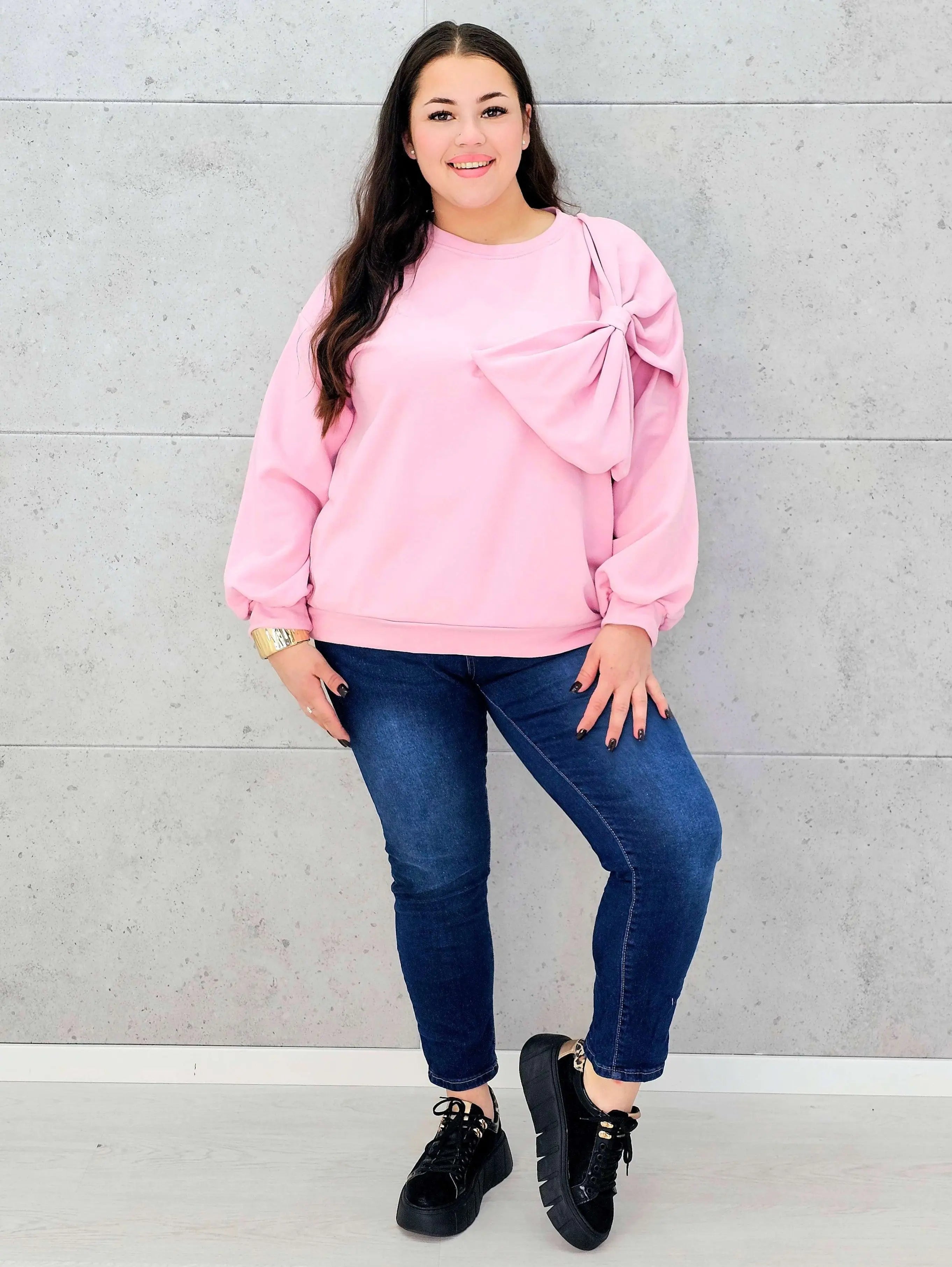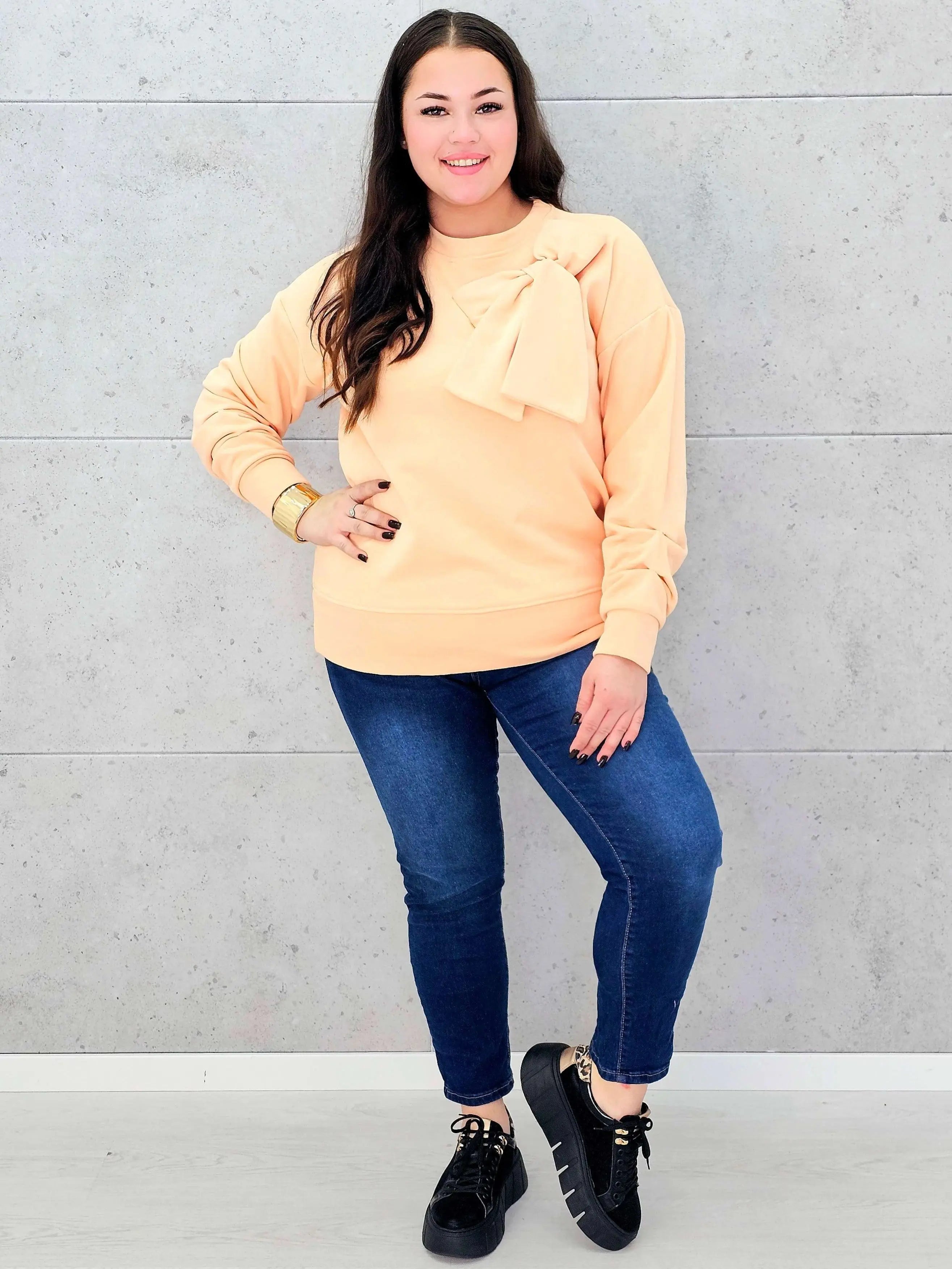 Bluza prezentuje się wyjątkowo elegancko i stylowo dzięki swojemu supermodelowemu designowi. Na przodzie bluzy znajduje się duża kokarda, która jest głównym elementem dekoracyjnym, dodającym bluzie charakteru i uroku. Kokarda ta nadaje bluzie wyrafinowanego wyglądu, który doskonale podkreśla indywidualność noszącej ją osoby. Długi rękaw sprawia, że jest to idealne rozwiązanie na chłodniejsze dni, zapewniając jednocześnie wygodę noszenia.