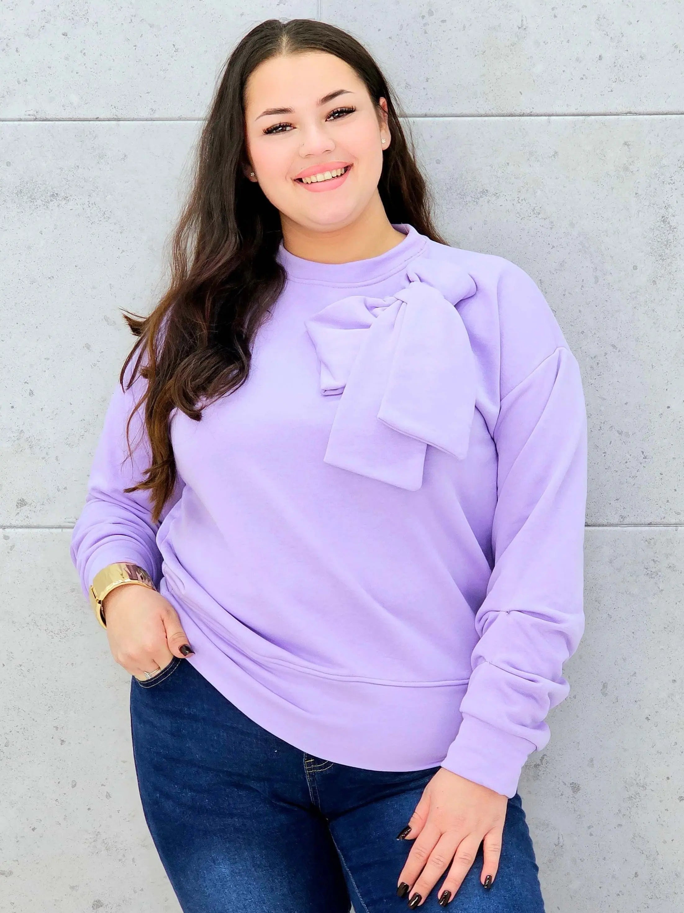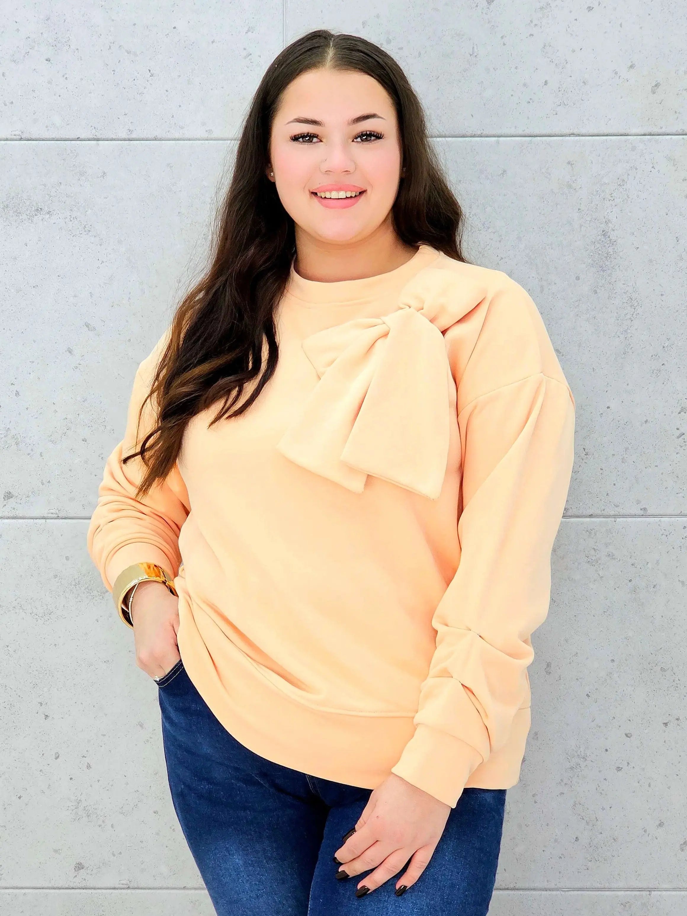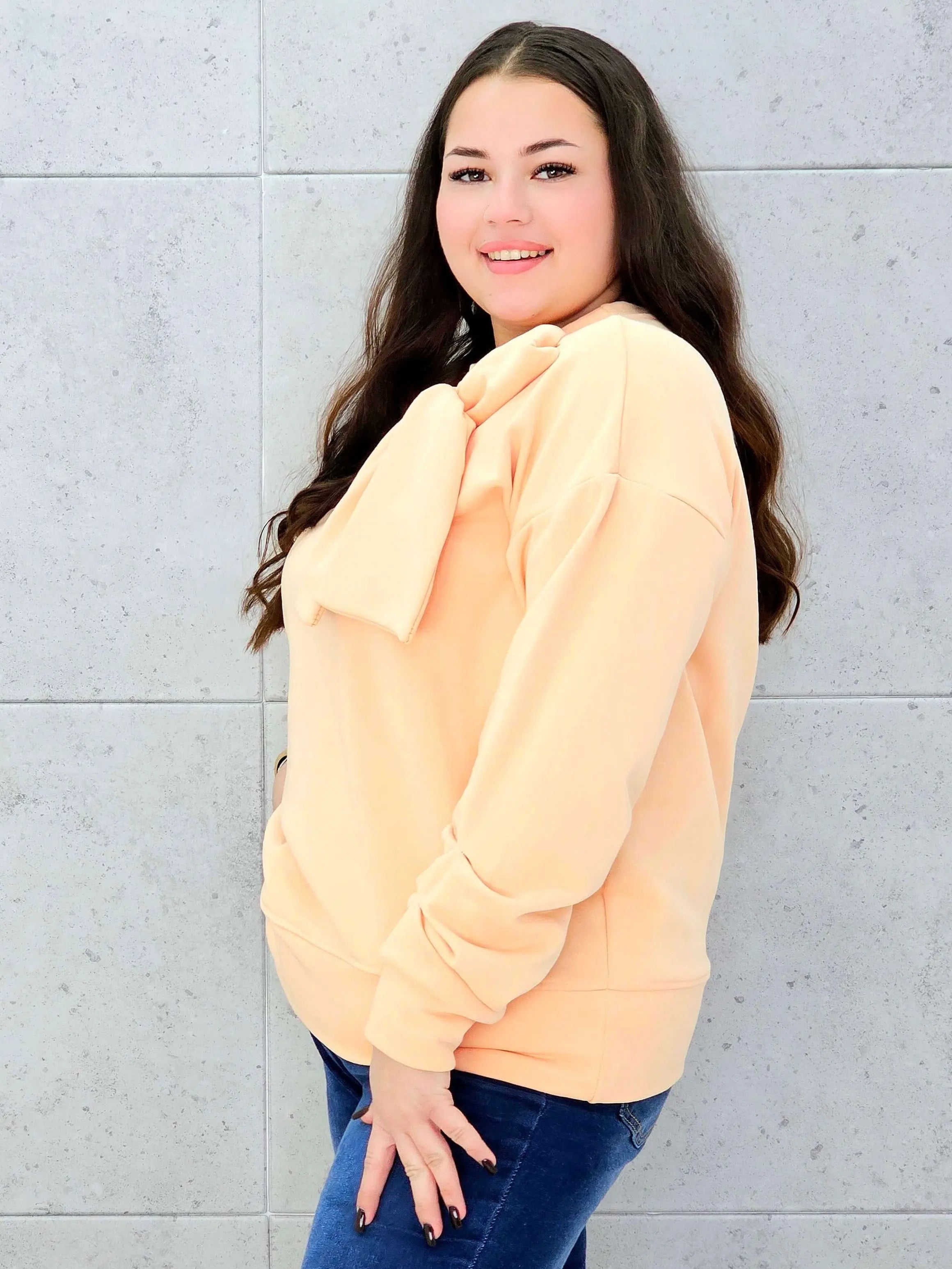 Bluza prezentuje się wyjątkowo elegancko i stylowo dzięki swojemu supermodelowemu designowi. Na przodzie bluzy znajduje się duża kokarda, która jest głównym elementem dekoracyjnym, dodającym bluzie charakteru i uroku. Kokarda ta nadaje bluzie wyrafinowanego wyglądu, który doskonale podkreśla indywidualność noszącej ją osoby. Długi rękaw sprawia, że jest to idealne rozwiązanie na chłodniejsze dni, zapewniając jednocześnie wygodę noszenia.