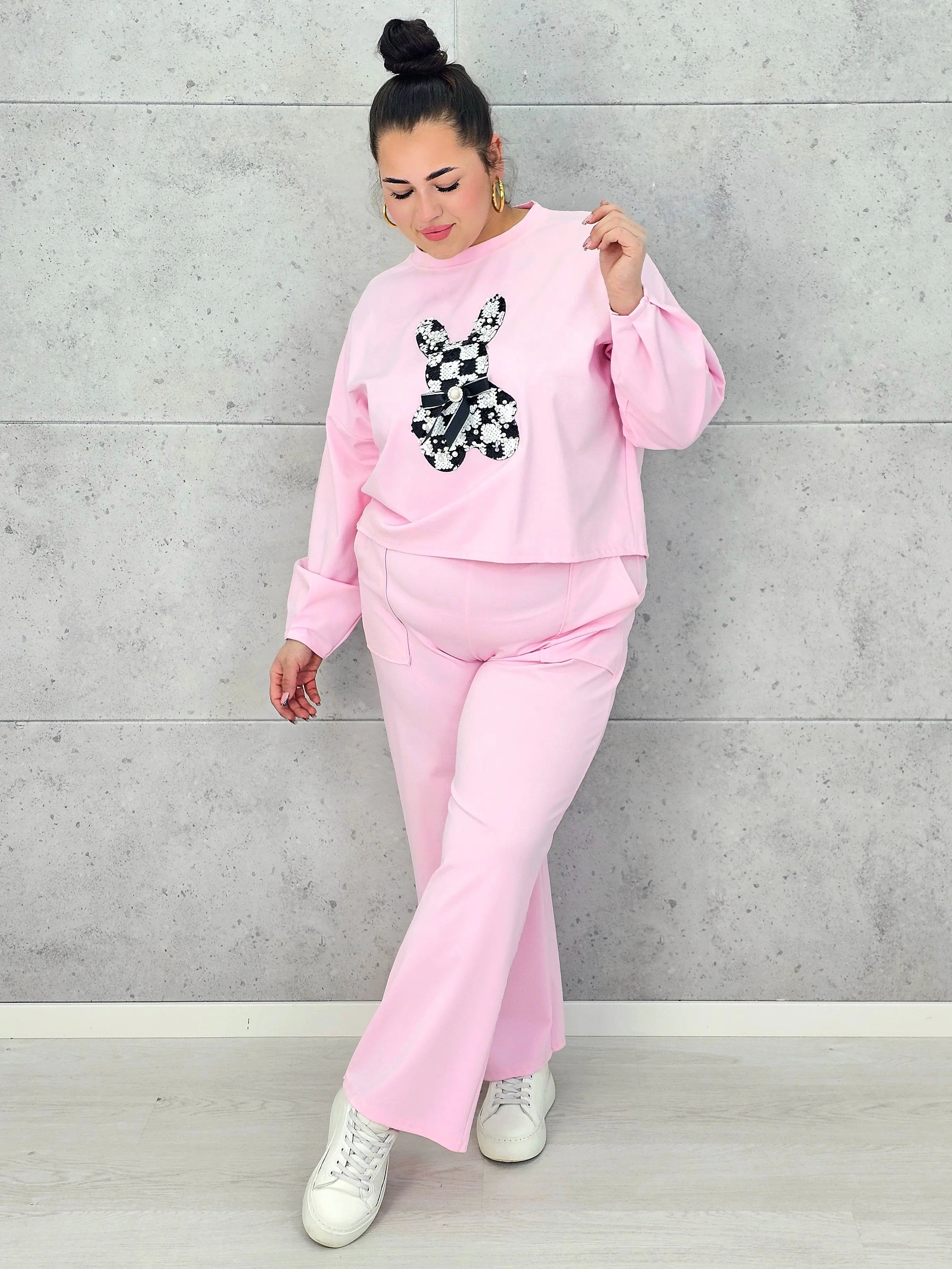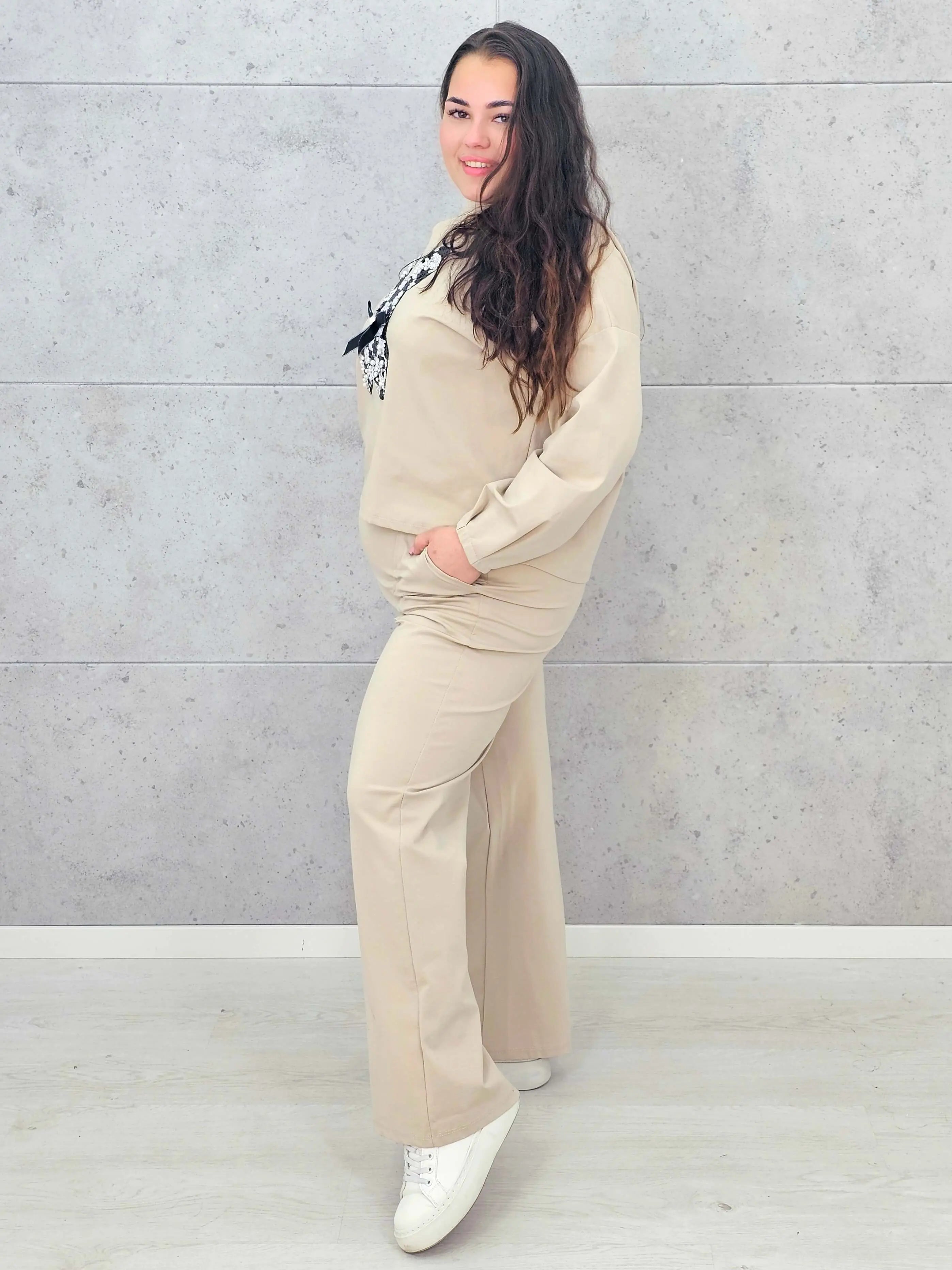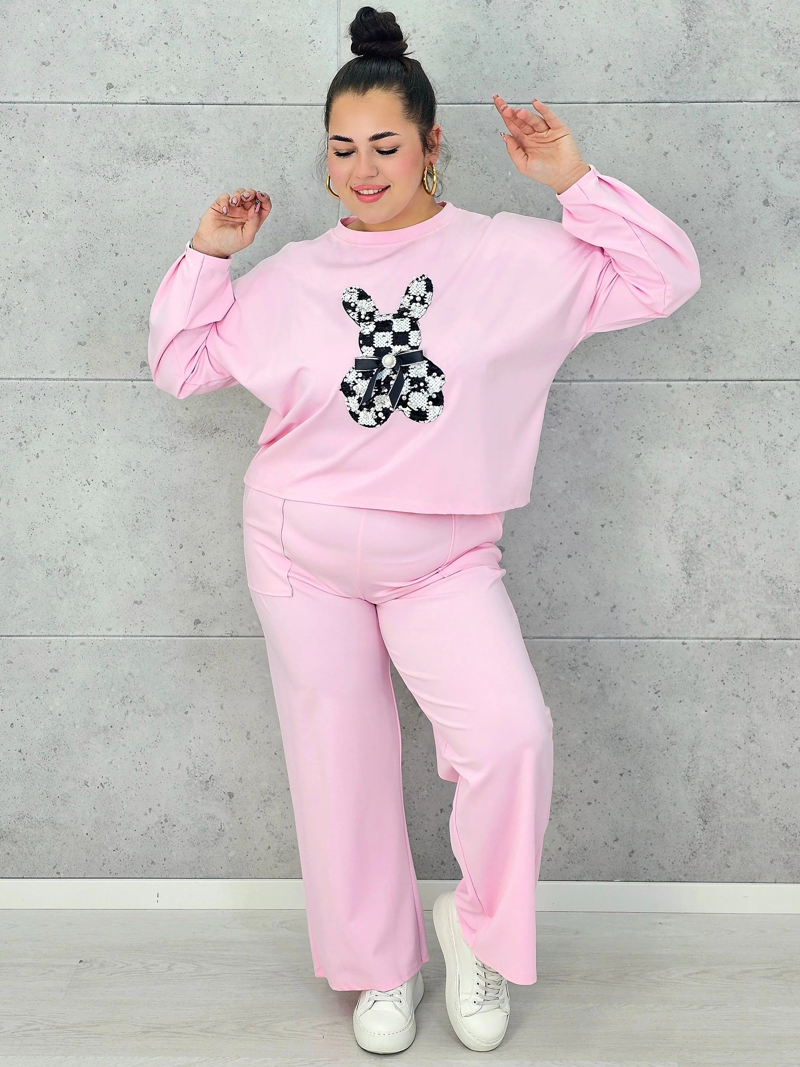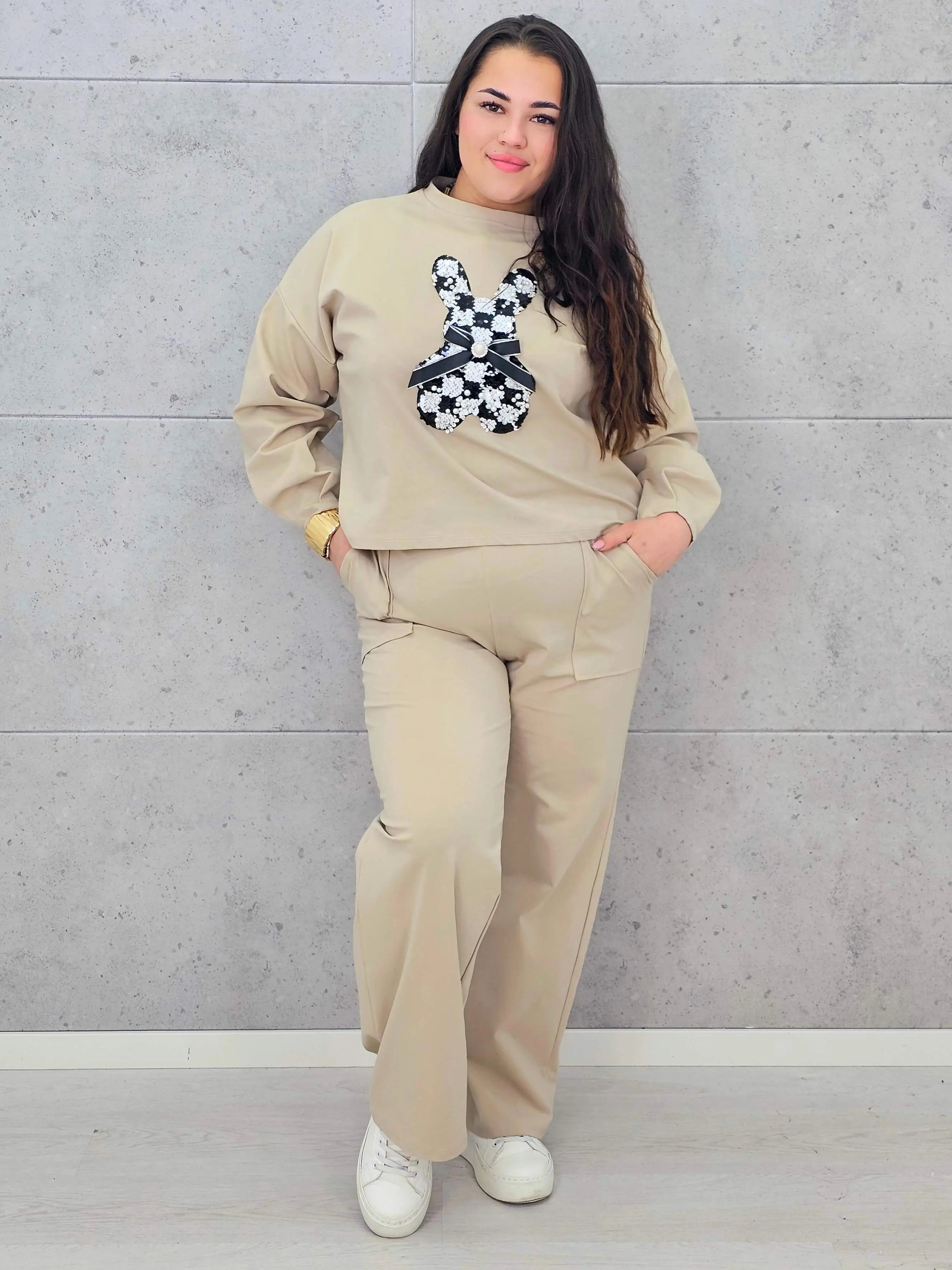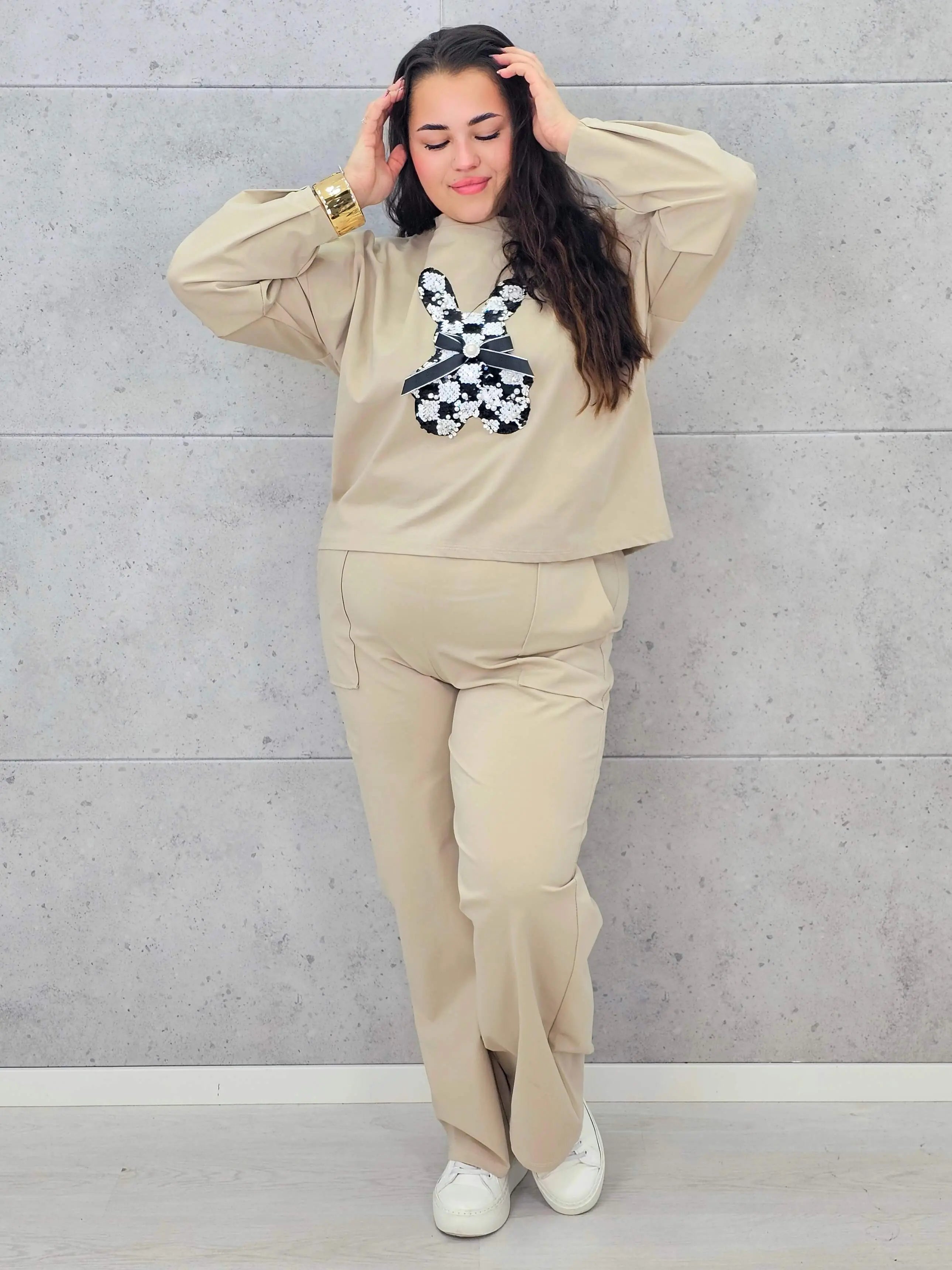 Dres plus size sprawdzi się zarówno na spacery, zakupy, jak i domowy relaks, oferując pełną swobodę ruchów. Spodnie o prostym kroju dopełniają zestaw, tworząc spójną i wygodną całość. To model, który pozwala wyglądać modnie, nie rezygnując z komfortu, a dekoracyjny detal dodaje mu wyjątkowego charakteru.