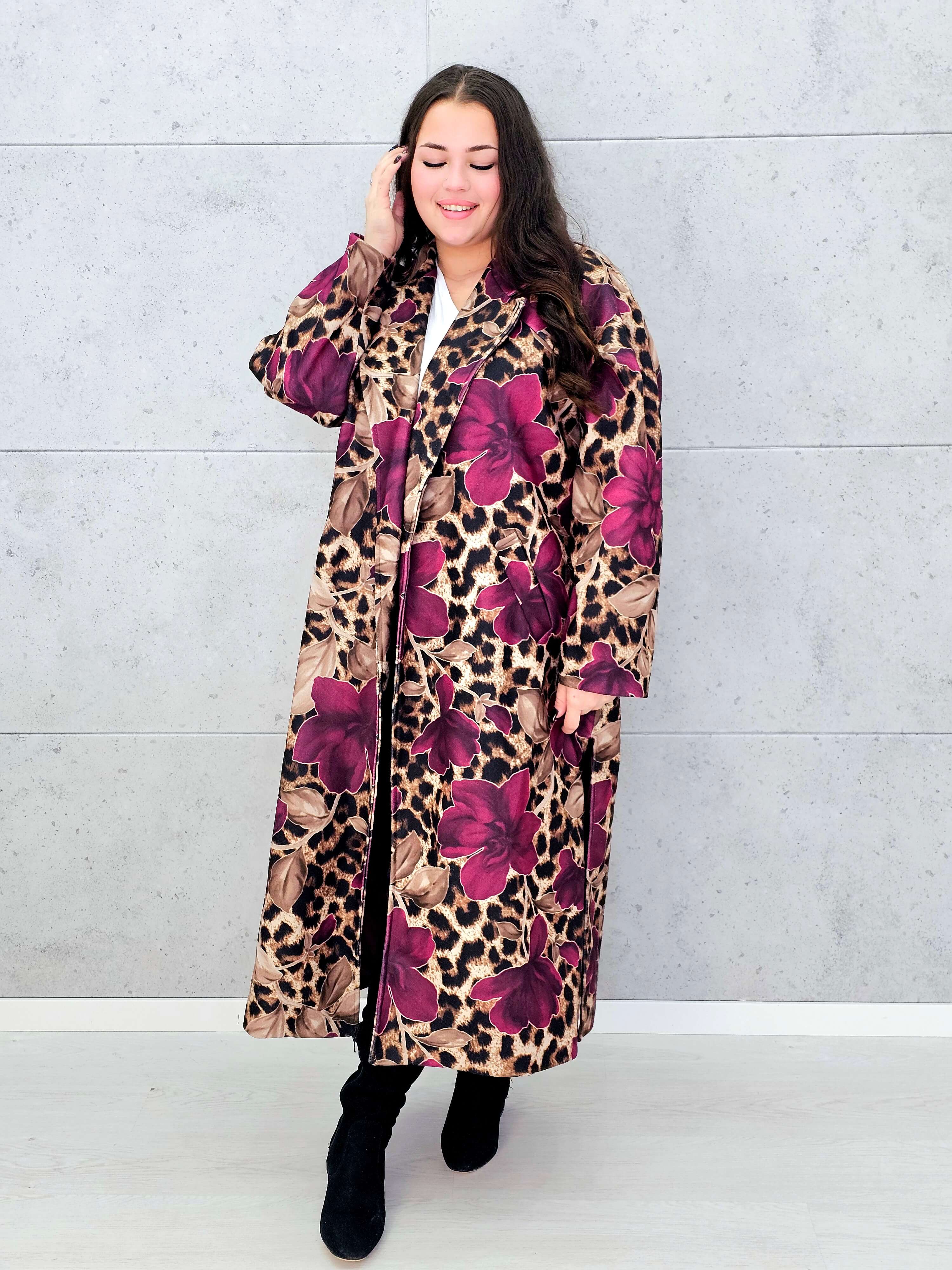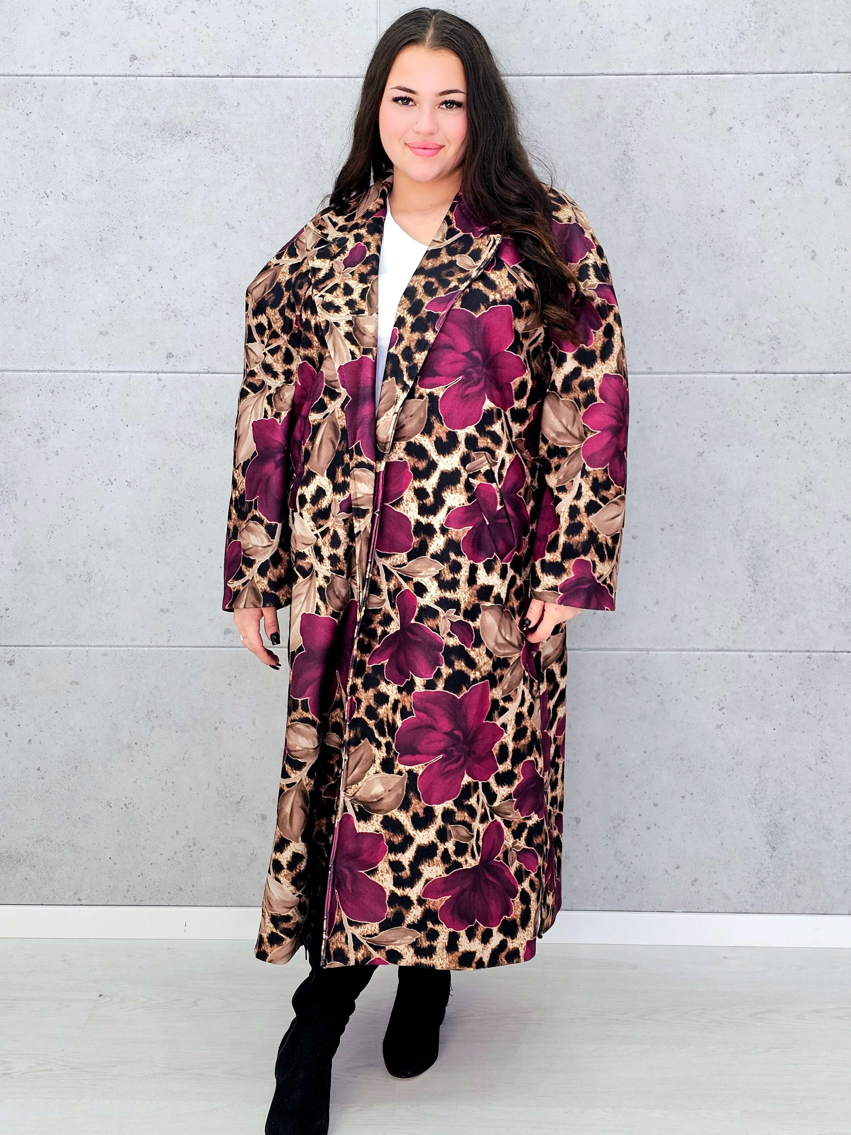 Płaszcz plus size z motywem panterki i kwiatów – odważny styl i kobieca elegancja